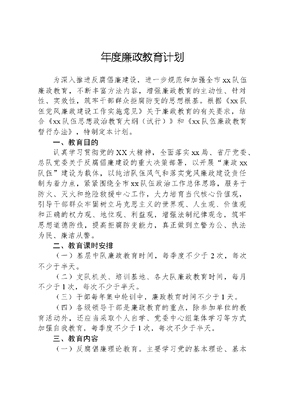 年度廉政教育计划为深入推进反腐倡廉建设,进一步规范和加强全市xx队伍廉政教育,不断丰富方法内容,增强廉政教育的主动性、针对性、实效性,筑牢干部群众拒腐防变的思想根基。根据《xx队伍党风廉政建设工作实施意见》关于廉政教育的有关要求,结合《xx队伍思想政治教育大纲(试行)》和《xx队伍廉政教育暂行办法》,特制定本计划。一、教育目的认真学习贯彻党的XX大精神,全面落实xx局、省厅党委、总队党委关于反腐倡廉建设的重大决策部署,以开展廉政xx队伍建设为载体,以纯洁队伍风气和落实党风廉政建设责任制为着力点,紧紧围绕全市xx队伍政治工作总体思路,服务于防火、灭火和抢险救援中心工作,大力培育当代核心价值观,引导干部群众牢固树立马克思主义的世界观、人生观、价值观和正确的权力观、地位观、利益观,增强法制纪律观念,筑牢思想道德防线,提高拒腐防变能力,真正做到立警为公、执法为民、廉洁从警。二、教育课时安排(一)基层中队廉政教育时间,每季度不少于2次,每次不少于半天。(二)支队机关、培训基地、各大队廉政教育时间,每月不少于1次,每次不少于半天。(三)干部每年集中轮训中,廉政教育时间不少于1天。(四)各级领导干部是廉政教育的重点,除参加单位的教育活动外,还应当采取个人自学、党委中心组集体学习等方式加强自我教育,每季度不少于1次,每次不少于半天。三、教育内容(一)反腐倡廉理论教育。主要学习党的基本理论、基本路线、基本纲领、基本经验和国家的重大方针、政策,学习中国特色反腐倡廉理论体系,学习部党委关于反腐倡廉建设的重大理论观点、战略思想和决策部署,正确认识新时期反腐败斗争形势,增强反对腐败、战胜腐败的决心和信心。(二)理想信念教育。主要学习马克思主义世界观、人生观、价值观的基本内涵,学习社会发展史、中国现代史、中国革命史、中共党史等基本知识,坚信中国共产党的正确领导,坚定走中国特色社会主义道路的决心和信心。(三)执法为民教育。主要学习依法治国、依法行政的基本理论,学习社会主义法治理念的基本内容和部党委关于执法为民的基本要求,克服特权思想,增强群众观念,严格依法行使权力、履行职责。(四)法制纪律和道德规范教育。主要学习党纪条规、国家法律法规和队伍条令条例以及各项规章制度,增强遵纪守法的自觉性;学习公民道德规范、军人道德规范和xx队伍职业道德规范,树立和实践社会主义荣辱观。(五)廉洁从警教育。主要学习中央关于领导干部廉洁自律的有关规定,学习部党委关于廉洁从警的有关要求和《机关领导干部五个严禁》、《xx队伍四个严禁》等禁令,培养秉公执法、清正廉明的职业风范。其中,理想信念教育、执法为民教育列入思想政治教育计划,廉政教育计划不再重复安排。四、学习科目(一)支队机关,xx队伍大队、培训基地:一月份:《关于进一步加强当前队伍管理的紧急通知》、《部五条禁令》、《转发部xx队伍局纪委〈关于贯彻落实全国机关贯彻执行禁令电视电话会议精神的通知〉的通知》二月份:《部党委关于改进工作作风的十项规定》、总队《六个一律》三月份:《全市xx队伍党风廉政建设工作实施意见》、文可居文库——海量学习资料,手机电脑均可下载www.wenkeju.com《现役队伍领导机关和领导干部改进工作作风规定》、《全省xx队伍改进工作作风九项措施》四月份:《xx队伍支队加强和改进作风建设十二条措施》、《xx队伍支队队伍管理六条刚性措施》、《xx队伍四个严禁》、《部党风廉政建设责任制实施办法》、《队伍党风廉政建设责任制考核评价办法(试行)》五月份:六月份:七月份:《机关领导干部五个严禁》、《xx队伍总队督察队工作规定》、《xx队伍部门信访工作细则》、《xx队伍审计规定(试行)》八月份:《中国共产党纪律处分条例》、《军队贯彻执行〈中国共产党纪律处分条例〉的补充规定》、《全省机关领导干部反腐倡廉建设一岗双责实施办法》九月份:《中国共产党党员领导干部廉洁从政若干准则》《〈中国共产党党员领导干部廉洁从政若干准则》实施办法》、《关于加强xx队伍监督执法廉政建设的若干规定(试行)》十月份:《xx队伍廉政教育暂行办法》十一月份:《xx队伍预防犯罪工作规定》、《甘肃省xx队伍招投标工作监督管理暂行规定》、《甘肃省xx队伍干部人事工作监督暂行办法》。十二月份:《机关xx队伍机构工作人员执法过错责任追究规定》、《xx队伍机构内部执法监督工作暂行规定》、《甘肃省xx队伍廉政谈话和函询实施办法(试行)》。(二)基层中队各基层中队廉政教育内容由各xx队伍大队根据基层中队廉政教育课时安排,结合支队廉政教育计划和各大队工作实际,统一自行安排。五、几点要求一要高度重视,精心组织。廉政教育是反腐倡廉建设的第文可居文库——海量学习资料,手机电脑均可下载www.wenkeju.com一道防线,廉政教育应注重创新