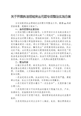关于开展执法领域突出问题专项整治实施方案为切实抓好执法领域突出问题专项整治工作,根据xx局的安排部署,现制定方案如下:一、指导思想和主要目标以党的XX大精神为指导,认真贯彻中共中央政治局关于改进工作作风、密切联系群众的八项规定,以排查整治监督执法突出问题为重点,坚持改革创新、科学务实,坚持开展集中整治与加强日常监管相结合,坚持执法规范化建设与队伍党风廉政建设一起抓,通过专项整治使随意执法、趋利执法、倾斜执法、野蛮执法、懈怠执法的现象得到全面清查,执法动机不纯、法纪观念淡薄的问题得到有效遏制,确保实现两减少两改善两提升的目标,即:涉及执法信访举报明显减少,执法违法违纪案件明显减少;执法作风明显改善,执法形象明显改善;执法公信力明显提升、人民群众满意度明显提升。二、整治内容以端正执法思想、转变执法作风、规范执法行为为主线,重点整治在建设工程监督管理、监督检查、产品监督、行政处罚、行政强制、火灾事故调查等执法环节中存在的十个突出现象和问题。一是法纪观念淡薄,执法动机不纯,特权思想严重,漠视群众利益,执法方式简单粗暴,对待群众冷硬横推。二是行政许可受理未履行一次性告知,反复折腾刁难办理人的。三是利用行政许可权和执法权指定工程施工队伍、产品、检测单位、设施维保单位和外保温材料等。四是行政许可受理不规范、超时限审批或未按法定流程审批的。五是利用执法权向企业和个人摊派、乱拉、强拉赞助或以摊派、赞助替代罚款。三、方法步骤专项整治活动分为动员部署、自查自纠、整改落实、建章立制和总结验收5个阶段。(一)动员部署阶段(从6月6日至6月15日)。xx局将通过制定工作方案、召开党委会、执法干部大会的形式,对专项整治活动进行动员部署,各大队要组织全体执法人员认真学习xx局和xx局的工作方案,认真领会会议要求,充分认识开展监督执法突出问题专项整治工作的重要性和必要性。切实增强规范执法、服务人民的责任感和紧迫感。(二)自查自纠阶段(6月10日至7月15日)。xx局全体执法干部要对照整治内容,逐条逐项检查,切实找准存在的突出问题,覆盖面必须达到100%。一是组织一次执法监督岗位廉政风险排查。xx局防火处和各大队要组织开展一次执法岗位廉政风险排查,紧紧围绕四个严禁进行对照检查,从岗位职责、工作流程、制度机制三个角度,逐人、逐岗深入查找廉政风险,全面、深入、客观、准确地查找思想道德、岗位职责、业务流程、制度机制、外部环境等方面的廉政风险,坚持分岗查险、分险设防,制定防控措施。认真填写《个人岗位廉政风险自查表》(附表1)。(三)整改落实阶段(7月15日至7月30日)。xx局将由xx局纪委牵头,防火处人员配合,成立专门的审查组,对防火处和各大队的网上执法情况进行逐一排查。排查的重点内容是:有无超期、违规办理、双轨运行等情况;排查的重点项目是:专项整治活动以来办理的行政许可、行政处罚案件,这两类案件将逐一审查;排查过程中,还将对工程建设单位、被处罚单位和公众聚集场所等发放征求意见表,严格执纪执法,真正将违法违纪人员责任追究到位,处理到位,确保整治工作取得实效。(四)建章立制阶段(8月1日至8月20日)。建立健全文可居文库——海量学习资料,手机电脑均可下载www.wenkeju.com党风廉政建设长效机制是专项整治活动的根本目标,xx局将按照边整治、边研究、边总结、边完善的思路,将机制建设贯穿整治工作始终。一是要深化监督执法规范化建设,结合当地实际制定细化行政处罚、流程及标准,特别是自由裁量基准的参照标准,最大限度压缩自由裁量空间;大力推进网上执法,加强移动执法终端设备配备和应用;加强中介服务管理的制度建设;大力推进产品、建筑内装修材料、建筑外保温材料监督制度化。(五)总结验收阶段(8月21日至8月30日)。xx局将认真对xx局防火处和各大队的整治工作逐一进行进行总结验收,通过验收,保证以实实在在的整治工作成果取信于民。验收的方法有:一是通过资料分析、报表审核和现场检查等方式全面了解整治工作情况;二是过向当地党委政府、公安机关、社会单位和人民群众问卷调查、座谈了解等方式,进行群众对监督执法满意度调查。通过检查验收,确保排查整治工作内容落实、整改措施切实有效、制定的制度健全完善。在总结验收阶段,各大队要收集整理好专项整治工作过程中形成的各种资料,做好迎接xx局抽查验收的准备。四、有关要求(一)加强组织领导。监督执法突出问题专项整治是推进执法规范化,加强队伍廉政建设的重要措施。xx局成立监督执法突出问题专项整治工作领导组,纪委书记负有主要责任,做到专项整治工作亲自协调、亲自督办;政治处要搞好组织协调,防火处等其他部门和各大队要切实履行职责,落实任务分工,加强协作配合,努力形成工作合力,推动工作落实。(二)强化督促检查。专项整治期间,xx局工