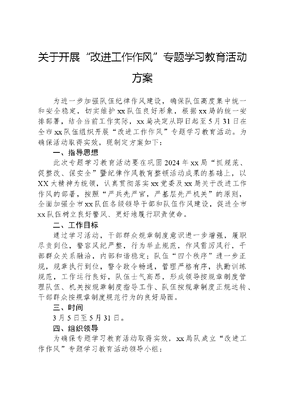 关于开展改进工作作风专题学习教育活动方案为进一步加强队伍纪律作风建设,确保队伍高度集中统一和安全稳定,切实维护xx队伍良好形象,根据xx局的统一安排部署,结合当前工作实际,xx局决定从即日起至5月31日在全市xx队伍组织开展改进工作作风专题学习教育活动。为确保活动取得实效,现制定方案如下:一、指导思想此次专题学习教育活动要在巩固2024年xx局抓规范、促整改、保安全暨纪律作风教育整顿活动成果的基础上,以XX大精神为统领,认真贯彻落实xx党委及xx局关于改进工作作风的部署,按照严兵先严官,严基层先严机关的原则,全面加强全市xx队伍各级领导干部和队伍作风建设,促进全市xx队伍树立良好警风、更好地履行职责使命。二、工作目标通过学习活动,干部群众规章制度意识进一步增强,履职尽责到位,警容风纪严整,行为举止规范,作风雷厉风行,干部群众关系融洽,内部和谐稳定;队伍四个秩序进一步正规,规章执行到位,警令政令畅通,管理严格有序,执勤训练规范,工作运行良好,队伍士气高昂,形成领导按规章制度管理队伍、机关按规章制度指导工作、队伍按规章制度正规运转、干部群众按规章制度规范行为的良好局面。三、时间3月5日至5月31日。四、组织领导为确保专题学习教育活动取得实效,xx局队成立改进工作作风专题学习教育活动领导小组:组长:副组长:成员:领导小组下设办公室和督导组:办公室主任:副主任:成员:五、重点学习内容(一)规章制度。组织学习xx等,强化干部群众的条令意识,提高广大干部群众遵守条令的自觉性和主动性。(二)法规禁令。组织学习《中央政治局关于改进作风、密切联系群众的八项规定》、四个严禁、《xx监督执法六个严禁》及道路交通法律法规等,增强干部群众的法纪观念、责任意识,培养良好作风,自觉维护xx队伍良好形象。(三)规章制度。组织学习《xx队伍正规化管理规定(试行)》、《xx队伍安全管理规定》、《xx队伍作战训练安全要则》、《xx队伍抢险救援规程》、《xx队伍干部群众开设使用互联网个人空间的管理规定(试行)》等,不断提高干部群众学习、生活、训练、工作等的规范化水平。六、方法步骤第一阶段:动员部署(3月上旬)。各单位要层层进行动员,统一思想,提高认识,使全体干部群众明确此次整顿教育的重要意义。各单位要召开专门会议,结合单位实际,研究制定具体的活动实施方案,切实增强学习教育活动的针对性和实效性。方案于3月10日前,将方案报司令部。第二阶段:集中教育(3月中旬至3月底)组织集中学习教育,原原本本地学习相关的规章制度和各项规章制度,引导干部群众进一步熟悉作风纪律要求和相关制度规定,强化纪律意识、责任意识和忧患意识,为清理排查打文可居文库——海量学习资料,手机电脑均可下载www.wenkeju.com牢思想基础。每名干部群众都要有学习笔记,xx局将适时组织一次网上答题活动,确保学习的效果。期间机关和大中队要结合实际组织好队列训练、卫生检查和安全自查分析等工作,xx局将随机督查。第三阶段:清理排查(4月上旬至4月底)在学习提高的基础上,每名干部群众要认真查找在思想作风、学风、工作作风和生活作风等方面存在的问题。查找问题采取个人自查与互查、本级查与上级查的办法进行。个人自查中每名干部群众要结合工作实际,对照规章制度和各项规章制度查找自身纪律作风方面存在的不足,自查过程中要注重征求干部群众的意见和建议,确保找准问题、明白根源,同时要认真填写自查自改登记表,分析问题产生原因,督促整改措施落实;每名干部群众都要针对个人自查和组织排查中发现的问题,制定切实可行的整改措施和整改目标。重点清理排查以下四个方面的问题:一是执纪不严。不按规章制度和规章制度办事,有令不行、有禁不止;执行标准不统一,上紧下松,严兵不严官;纪律观念不强,违反队伍纪律规定;一日生活制度不落实、四个秩序不正规等问题。二是作风不实。机关、大队干部工作态度不端正,表率作用不好,服务基层意识不强;工作作风不扎实,调查研究不深入,指导工作走过场;公款吃喝、公车私用、铺张浪费;中队干部群众扎根基层思想树立不牢,责任心不强,离兵离营,脱岗漏岗,骨干作用不明显等问题。第四阶段:整改落实(5月上旬至5月中旬)针对清理排查出的问题,逐项制订措施,逐级明确责任,并强化跟踪问效,抓好整改落实。对于一些重点难点问题,要进行专题研究,制定切实可行的措施,强力督促整改。第五阶段:检查总结(5月下旬)各单位要分阶段对所属队伍开展学习教育活动情况进行检查、讲评。xx局党委成员要认真督促各自包片大(中)队扎实开展活动,坚持每阶段至少要对联系点单位进行一次检查、讲文可居文库——海量学习资料,手机电脑均可下载www.wenkeju.com评。七、有关要求(一)要加强组织领导。各单位要高度重视学习教育活