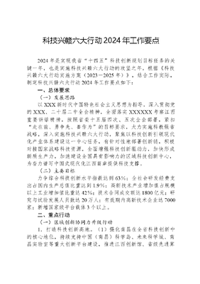 科技兴赣六大行动2024年工作要点2024年是实现我省十四五科技创新规划目标任务的关键一年,也是实施科技兴赣六大行动的攻坚之年。根据《科技兴赣六大行动实施方案(2023-2025年)》,结合工作实际,制定科技兴赣六大行动2024年工作要点如下:一、总体要求(一)发展思路以XXX新时代中国特色社会主义思想为指导,深入贯彻党的XXX、二十届二中全会精神,全面落实XXXXXX考察江西重要讲话精神,按照省委十五届四次、五次全会部署,紧扣走在前、勇争先、善作为的目标要求,大力实施科教强省战略,深入实施科技兴赣六大行动,聚焦以科技创新引领现代化产业体系建设这一中心任务,有针对性地部署创新链,积极对接国家战略科技资源,全面增强科技创新驱动力,加快形成新质生产力,加速建设全国具有影响力的区域科技创新中心,为奋力谱写中国式现代化江西篇章提供科技支撑。(二)主要目标力争综合科技创新水平指数达到63%;全社会研发经费支出占国内生产总值比重达到1.9%;高新技术产业增加值占规模以上工业增加值比重达42%;技术合同成交额达1800亿元;研究与试验发展人员数达20万人;有效期内高新技术企业达7000家;新增国家级平台载体3个以上。二、重点行动(一)区域创新协同力升级行动1.打造科技创新高地。(1)强化南昌在全省科技创新中的核心地位,持续支持中国(南昌)科学岛、未来科学城、南昌实验室等重大创新平台建设,推进江西创新馆、省级先进算力中心建设,推动厅市会商工作,加快打造中部地区区域科技创新中心;支持南昌围绕电子信息、航空、汽车及装备、新能源、新材料、医药健康、绿色食品、轻工纺织等制造业重点产业链开展技术创新。(2)支持赣州发挥创新优势,聚焦有色金属、生物医药等领域,布局建设重大创新平台,加快建设具有世界影响力的稀土科技创新中心和国内一流的生物医药科创中心;支持赣州围绕稀土新材料及应用、新能源、新材料、钨新材料及应用、电子信息、现代家具等制造业重点产业链开展技术创新。2.筑牢市县科技创新基础。(1)推进鄱阳湖国家自主创新示范区建设,支持省级高新区争创国家高新区,支持市、县(区)高起点布局一批省级高新区。(2)支持井冈山国家农业科技园区升新中国成立家农业高新技术产业示范区。(3)落实科创城创新发展建设指引,高标准建设中国中医药科创城等十大科创城。(4)支持南昌市、萍乡市、景德镇市、新余市等国家创新型城市进位赶超。指导井冈山市、南昌县、樟树市、永新县、信丰县、贵溪市等国家级创新型县(市)建设,打造具有典型示范带动作用的省级创新型县(市、区)。(5)加强对地方高校、科研机构的支持力度,深入实施科技特派员制度,健全科技人员帮扶企业创新和乡村振兴机制。(二)创新平台引领力升级行动1.争创国家级科技创新平台。(1)推进国家实验室研究基地或网络成员建设,力争2-3家国家实验室研究基地或网络成员落户江西。(2)争创稀土、核资源、有色金属等领域全国重点实验室3-4家。(3)根据中央科技委的统一布署,制定方案,开展国家技术创新类平台的清理和争创工作。(4)积极创建庐山国家植物园。2.优化省级科技创新平台。(1)选准方向,新建1-2家省实验室。(2)全面完成省重点实验室优化重组工作。(3)开展省级技术创新类平台的清理整合,加强企业研发平台布局。文可居文库——海量学习资料,手机电脑均可下载www.wenkeju.com(4)开展科技创新平台管理提升行动,修订《江西省重点实验室管理办法》,制定《江西省实验室体系建设运行管理实施办法》《江西省重点实验室积分动态管理办法(试行)》等,开展省重点实验室积分制试点工作。(5)强化省临床医学研究中心评估和动态管理,推进国家临床医学研究中心分中心建设。(6)优化省级创新平台布局,实现产业需求和地方发展有效衔接。3.完善基础条件平台。(1)出台《江西省科技资源共享服务平台管理办法》和《江西省基础条件资源开放共享实施办法》,强化平台管理和开放共享服务。(2)争创鸟类观测国家野外科学观测研究站。(3)推进鄱阳湖科学数据中心等省级科学数据中心建设。(4)强化科技资源共享服务,扩充大型仪器(设施)、科技文献共享平台资源,推进生物种质等资源共享,实现大型仪器(设施)、科技文献共享后补助金额增长10%。(5)新增1家实验动物生产基地。(三)技术攻关硬实力升级行动1.优化基础研究系统布局。(1)积极争取国家自然科学基金支持,力争获重点项目、杰青项目、优青项目等20项左右。(2)实施自然科学基金丛林计划,设立国家自然科学基金区域发展联合基金(江西),与南昌、赣州等地以及有关企业、行业部门共同设立联合基金,做大基金总盘子。(3)建立有效需求导向的自然科学基金资助机制,围绕我省重点产业发展方向,对自然科学基金指南学科领域进行系统梳理研究,采用企业提出技