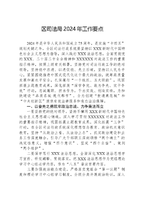 区司法局2024年工作要点2024年是中华人民共和国成立75周年,是实施十四五规划关键之年。全区司法行政系统要坚持以XXX新时代中国特色社会主义思想为指导,深入践行XXX法治思想,全面贯彻党的XXX、二十届二中全会精神和XXXXXX对政法工作的重要指示精神,按照上级有关部署,坚持党对司法行政工作的绝对领导,坚持稳中求进、以进促稳、先立后破,坚持以人民为中心,紧紧围绕推进中国式现代化这个最大的政治,统筹高质量发展和高水平安全,扎实履行一个统抓、五大职能,巩固拓展主题教育成果,深化拓展深学争优、敢为争先、实干争效行动,忠诚履职、担当作为,干出实效、创造实绩,为加快建设品质名城·现代都市,全力创建世遗典范城和中央创新区提供有效法律服务和有力法治保障。一、以奋先之勇筑牢政治忠诚、力争秉法而立一要坚持党的绝对领导。坚持不懈用XXX新时代中国特色社会主义思想凝心铸魂,深入学习贯彻XXXXXX对政法工作的重要指示精神,巩固拓展主题教育成果,深化拓展三争行动,在全区司法行政系统深化理想信念教育、政治机关意识教育,坚持从政治上看、从法治上办,抓实政治建设和业务工作深度融合。引导广大干部职工深刻领悟两个确立的决定性意义,增强四个意识、坚定四个自信、做到两个维护。二要深学笃行XXX法治思想。全面深化XXX法治思想学习宣传、研究阐释、贯彻落实,把XXX法治思想作为党组理论学习中心组必学内容,作为八五普法首要内容。三要加强政治能力建设。严格落实党组会第一议题制度和理论学习中心组学习制度,分级分类开展政治轮训,深入开展忠诚教育和党性教育,引导广大干部职工不断提高政治判断力、政治领悟力、政治执行力。认真贯彻政法工作条例,严格执行请示报告制度。四要加强机关党的建设。加强机关党建工作与业务工作深度融合探索研究,以党建引领带动司法行政工作高质量发展。全面落实党组书记抓党建工作主体责任,通过运用党组理论学习中心组学习、三会一课、主题党日等形式,深入学习XXX新时代中国特色社会主义思想、XXX法治思想和党的XXX精神,引领党员干部增强政治自觉,不断提高党员干部的履职尽责的能力。五要严格落实意识形态工作责任。加强意识形态阵地建设和管理,狠抓XX掌上12348公共法律服务平台微信公众号宣传阵地建设,做好网络舆情监测和处置。六要深化精神文明创建。深入培育和践行社会主义核心价值观,加强党史、新中国史、改革开放史、社会主义发展史宣传教育,弘扬中华优秀传统文化,开展存正心、守正道、养正气和我们的节日主题活动,充分发挥区司法局在普法、法律服务等方面的优势,提升志愿服务活动效果。切实加强作风建设,建设风清气正的政治机关、服务机关。二、以奋进之心统抓法治建设、力耕依法而治一要统筹推进全面依法治区。加快实施法治XX建设一规划两方案。牵头制定区委全面依法治区委员会年度工作要点,调整充实各协调小组成员。配合制定加强新时代法治工作队伍建设措施。完善与纪检监察、检察监督协作配合机制,增强法治督察实效。落实主要负责人述法制度,推动全面依法治区工作全面发展。二要完善行政执法协调监督机制。做好全省一体化大融合行政执法平台推广应用。配合推动建立省市县乡四级全覆盖的行政执法协调监督工作体系,探索拓展司法所行政执法监督职能。配合建立健全行政执法监督与检察监督、法治督察、行政文可居文库——海量学习资料,手机电脑均可下载www.wenkeju.com复议、行政诉讼等协作配合机制。深入实施提升行政执法质量三年行动计划,配合市级行政执法三项制度专项检查,开展行政执法案卷评查工作,推进严格规范公正文明执法。三要全面推进行政复议应诉工作。深入贯彻实施新修订的行政复议法,健全配套制度机制,完善我区行政复议工作规则及流程图,建立区行政复议委员会,常态化开展案卷自查,推动行政复议工作规范化建设。切实发挥行政复议化解行政争议主渠道作用,持续深化府院联动,加强府院沟通协调,推进行政诉讼全流程调解,致力优化行政机关负责人出庭应诉率和行政诉讼败诉率。组织集中培训和集体学习,以常态化集体讨论实现传帮带,塑造以应诉思维办理复议案件的严谨作风。四要加大合同审查力度。持续落实政府合同管理制度,提高合同审查质效,实现对政府合同起草、审查、签订、履行全过程进行监管,进一步防范法律风险、提升政府公信力。五要深入实施八五普法规划。积极参与全国守法普法示范市(县、区)创建活动,加快实施一地区一品牌项目。深入开展宪法宣传周民法典宣传月蒲公英普法、乡村振兴·法治同行等系列活动。加强法治带头人法律明白人培养,做好人民陪审员选任工作,发挥人民监督员和人民陪审员作用。三、以奋楫之责护航高质量发展、力使崇法而兴一要配合做好立法保障