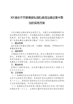 XX镇关于开展集镇私搭乱建违法建设集中整治的实施方案为坚决制止私搭乱建违法建设行为,从重打击和遏制镇辖区内违法建设的恶性势头,切实整改拆除违法建筑,规范集镇区建筑秩序,美化城乡环境,镇党委、政府决定在集镇区范围内开展私搭乱建违法建设集中整治行动。具体方案如下:一、整治范围305省道从加油站至桥头段、向湖路、湖滨路、罗坪新街所有集镇道路两旁。二、组织领导为确保此次拆违工作的顺利完成,成立以镇党委书记赵钢为总组长,党委副书记、镇长范海强同志为常务副组长,其他班子成员为副组长,XX镇全体干部职工、各村支书为成员的违章建筑整改工作领导小组,具体负责此次集中拆除工作的组织实施。三、整治时间经领导小组研究决定,本次集中整治行动时间定于202X年X月X日-X月X日。四、工作原则(一)集镇规划区内已取得规划许可手续,未按照建设工程规划许可证的规定进行建设,有超层扩面违法建设行为的建设项目(个人),其超层扩面的违法行为在对规划实施未造成影响,且没有相邻纠纷的,予以补办规划许可手续。(二)集镇规划区内未取得《建设工程规划许可证》进行建设的建设项目(个人),在建设位置和用地性质符合规划的情况下,补办规划许可手续。不符合规划的,由农业农村办牵头镇综合执法大队、国土等相关部门配合,予以拆除。 五、工作要求1、工作台账管理及报送。镇农业农村办负责对私搭乱建违法建设拆除前后对比的相关佐证资料台账进行收集、归档,对已处理到位的私搭乱建行为进行销号。2、统一思想。要召开好动员会,统一好思想,参加人员要一切行动听指挥,要根据自身职责明确好内部分工、人员方位、工作措施、力量布置等情况,并将有关情况报组长审定。3、周密部署。所有参加人员要按规定的时间要求,到达指定地点,确保此次集中整治行动的正常开展,要做好相关准备工作,确保工作落到实处。 4、做好维护稳定工作。各组对整治行动中的维稳工作要有处置预案,确保不发生暴力抗法事件,不发生当事人越级上访、重复上访和集体上访事件,切实维护社会和谐稳定。5、认真做好对象的来访接待处置工作。要按照法规政策进行说服教育和劝导,避免矛盾激化。要做好宣传,进行正面引导,营造全镇控违拆违工作的良好舆论氛围。6、除以上工作要求以外,还要督促集镇各住户做到门前三包,果皮纸屑不乱扔、垃圾污水不乱倒、牛皮广告不乱贴、车辆杂物不乱放等,努力营造整洁优美、文明有序的生活环境。文可居文库——海量学习资料,手机电脑均可下载www.wenkeju.com