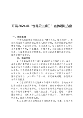 开展2024年世界艾滋病日宣传活动方案一、活动主题今年我国宣传活动的主题是携手抗艾,重在预防,意在说明当前艾滋病防治工作进入新的阶段,预防是防治工作的重要内容,号召各级政府、部门及单位、社会组织和个人等社会力量携手并肩,群策群力,多措并举,不断创新工作模式和方法,全面落实各项防控措施,以实际行动遏制艾滋病流行,推进健康中国建设。二、活动内容(一)提高各级领导干部对艾滋病防治工作的认识。各地、各有关部门要积极主动向当地党委和政府领导同志汇报本地艾滋病防治工作进展和目前存在的重点难点问题。通过宣传教育和倡导,让各级领导干部深刻认识到艾滋病防治工作的重要性和紧迫性,关心和重视防治工作,积极参加世界艾滋病日现场宣传活动,主动深入工作一线,研究解决问题,督促落实各项防治措施。(二)组织开展预防艾滋病工作建议征集活动。各地有关部门要动员全社会共同参与,利用微博、微信等网络新媒体渠道以照片、视频短片等形式,征集在伸出的手上写出对预防艾滋病工作的希望和建议,为防艾出主意、尽力量。同时,广泛传播好的作品,吸引更多人关注艾滋病防治工作,了解防治知识和政策,营造良好社会氛围。(三)主动开展艾滋病自愿咨询检测活动。各地、各有关部门要结合本地、本部门实际,按照艾滋病防治工作职责,在世界艾滋病日期间,依法主动开展艾滋病自愿咨询检测活动,针对活动人口、青年学生、老年人、被监管人员等重点人群和高危人群,深入细致宣传艾滋病防治知识和政策,强调艾滋病的危害和道德法制教育,积极引导有易感染艾滋病行为人群参加自愿咨询检测活动,了解自身感染状况,提高自我防护意识和传播风险。(四)全面开展大众人群艾滋病防治宣传教育活动。各地、有关部门要充分运用广播、电视、报刊杂志等传统媒体以及微信、客户端等网络新媒体宣传渠道,采取群众喜闻乐见的形式,广泛宣传艾滋病的危害、防治知识及有关法规政策,弘扬社会主义核心价值观和公序良俗,倡导健康文明生活方式。鼓励和支持企事业、基金会、社会组织和自愿者等社会力量,利用自身优势,开展艾滋病防治宣传和关怀救助等公益活动。三、相关要求(一)各级艾滋病防治工作委员会办公室要结合本地实际,及时下发宣传活动通知和材料,组织好相关活动。各级防治艾滋病工作委员会成员单位要结合本单位职责和优势,组织开展宣传活动。各级医疗卫生机构要发挥带头作用,为其他部门、系统、团体提供必要的技术支持,在12月1日世界艾滋病日前后形成宣传活动的高潮。(二)国家卫生计生委组织制作了艾滋病日主题海报等宣传材料(包括纸质材料和电子模版),近期将由中国健康教育中心下发。中国疾病预防控制中心性病艾滋病预防控制中心建立了艾滋病防治健康教育资料库。各地可根据本地实际情况和需要,制作本地的宣传材料。(三)活动结束后,各地、各部门要及时进行总结,将总结材料于2024年X月X日前纸版报送我办(电子版发送至),将好的宣传材料通过邮件提交中国疾病预防控制中心性病艾滋病预防控制中心。文可居文库——海量学习资料,手机电脑均可下载www.wenkeju.com