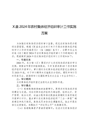 X县2024年农村集体经济组织审计工作实施方案为加强农村集体经济组织审计监督,规范农村集体经济组织运营管理,根据《X省农业农村厅关于开展农村集体经济组织审计工作的实施意见》(X〔2022〕X号)、合肥市农业农村局《关于做好2024年农村集体经济组织审计工作的通知》要求,现就做好2024年农村集体经济组织审计工作通知如下:一、年度任务2024年,各乡镇(区)要逐步扩大农村集体经济组织审计范围,根据省市要求和前期摸底,今年X县选择65个农村集体经济组织开展审计。审计期间为村集体经济组织登记注册时点至2023年底,对于审计期间未实施账务分设的,需延伸审计至村民委员会。鼓励将审计范围延伸至村办企业(专业合作社)。二、审计期间为村集体经济组织登记注册时点至2023年底。三、审计重点(一)农村集体经济组织运营审计。聚焦农村集体经济组织建设与发展,对农村集体经济组织内部治理、组织运行、资产管理、账务处理、收益分配等相关配套政策制定及落实情况开展审计评价。重点审计农村集体经济组织三会一章程制度建设和执行情况,集体成员身份动态调整情况,独立开展实体化运营情况,参照执行四议两公开机制情况等。(二)农村集体资产资源管理审计。依法对农村集体经济组织所有的房屋、建筑物、机器设备、农业资产、无形资产等经营性资产,用于公共服务的教育、科技、文化、卫生、体育等非经营性资产,土地、山岭、荒地、滩涂等资源性资产进行审计。重点审计集体资产资源管理、运营和处置过程中遵守法律规定情况,年度清查和盘点情况,台账建立和完善情况,合同签订和履行情况,规范交易和保值增值情况等。(三)农村集体财务管理审计。依法对农村集体经济组织经营收入、发包及上交收入、投资收益、补助收入等收入,用于经营活动、日常管理、村内公益事业和综合服务等支出,以及相关经济活动进行审计。重点审计收入和支出的真实性、合法性、准确性情况,村级资金账户设置、专用票据管理、资金分配使用情况,现金、备用金及大额支付制度执行情况,会计科目处理、财务审核规范性情况,村级债权债务管理情况,工程建设项目预算、审批、招投标、监理、审计验收、付款等制度执行情况等。(四)农村集体经济组织负责人经济责任审计。依法对农村集体经济组织负责人在任职期间农村集体资产、负债、权益的变动情况,财经法纪遵守情况,岗位目标完成情况,经济责任评价情况,重大决策和内控制度执行情况,民主公开制度落实情况以及本人遵守党风廉政建设有关规定情况等进行审计,促进农村集体经济组织负责人守法守纪、守规尽责。四、工作要求(一)强化组织,压实责任。开展农村集体经济组织审计工作对于保障农村集体资产安全、加强基层党风廉政建设、维护农村社会稳定有着十分重要作用。各乡镇(区)要认真贯彻落实上级关于开展农村集体经济组织审计工作的部署要求,高度重视、超前谋划,抓好贯彻落实。各乡镇(区)参考借鉴往年审计经验,成立审计工作组,进一步健全领导机制,明确专人负责,压实工作责任。开展内审的乡镇(区)可统筹调配相关专业人员组建工作组,在接受专业部门的指导下自行开展审文可居文库——海量学习资料,手机电脑均可下载www.wenkeju.com计。需要通过政府购买委托第三方机构开展审计的,要按照规范程序完成审计机构招投标工作,确定审计机构。建立会商机制,加强与组织、纪检监察、财政、审计等部门沟通,及时跟踪审计发现问题及整改情况,推动审计资源、信息、成果共享。充分发挥审计治已病、防未病的保障作用,审计结果及整改情况将作为考核、奖惩农村集体经济组织管理人员的重要依据。各地要积极争取将审计经费列入同级财政预算,保障审计工作常态化开展。(二)明确任务,推动落实。根据《X省农业农村厅关于做好2024年农村集体经济组织审计工作的通知》(X〔2024〕X号)文件和合肥市农业农村局《关于做好2024年农村集体经济组织审计工作的通知》的安排。对照《农村集体经济组织审计工作流程图》,有序推进农村集体经济组织审计工作。乡镇(区)可统筹调配相关专业人员组建工作组自行开展审计,也可通过政府购买服务等方式,委托具备相应资质的第三方机构开展审计工作。审计工作组要结合被审计单位实际,制定审计工作方案,确定审计事项,依法依规开展审计工作,出具审计报告。加强对审计工作进展情况进行跟踪调度,确保6月20日前高质量完成现场审计工作。(三)做好问题整改。乡镇(区)要建立整改工作台账,指导被审计单位做好审计发现问题整改工作并形成整改报告,于8月底前报县级农业农村部门。对于账务处理、合同签订等可立即整改的问题,要指导村集体经济组织抓紧完成整改;对于制度建设、组织管理等需要长期整改的问题,要加强跟踪指导,协助完成整改;对于审计发现的严重违纪违法线索,要按程序移交相关部门处理。同时,县级农业农村部门要针对上年度审计发现问题整