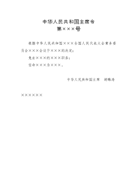 中人民共和主席令华国第×××号根据中华人民共和国×××全国人民代表大会常务委员会×××会议于×××的决定: 免去×××的×××职务; 任命×××为×××。 中华人民共和国主席 胡锦涛 ××××××权威范例:中华人民共和国主席令第二十号根据中华人民共和国第十一届全国人民代表大会常务委员会第十一次会议于2009年10月31日的决定: 免去周济的教育部部长职务; 任命袁贵仁为教育部部长。 中华人民共和国主席 胡锦涛 2009年10月31日