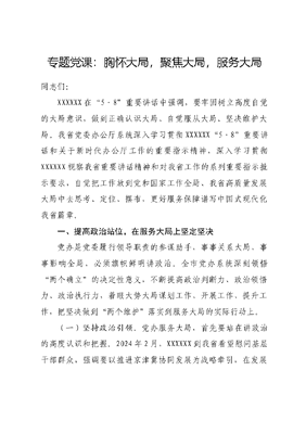 专题党课:胸怀大局,聚焦大局,服务大局同志们:XXXXXX在5·8重要讲话中强调,要牢固树立高度自觉的大局意识,做到正确认识大局、自觉服从大局、坚决维护大局。我省党委办公厅系统深入学习贯彻XXXXXX5·8重要讲话和关于新时代办公厅工作的重要指示精神,深入学习贯彻XXXXXX视察我省重要讲话精神和对我省工作的系列重要指示批示要求,自觉把工作放到党和国家工作全局、我省高质量发展大局中去思考、定位、摆布,更好服务保障谱写中国式现代化我省篇章。一、提高政治站位,在服务大局上坚定坚决党办是党委履行领导职责的参谋助手,事事关系大局,事事影响全局,必须旗帜鲜明讲政治。全市党办系统深刻领悟两个确立的决定性意义,不断提高政治判断力、政治领悟力、政治执行力,着眼大势大局谋划工作、开展工作、提升工作,把坚决做到两个维护落实到服务大局的实际行动上。(一)坚持政治引领。党办服务大局,首先要站在讲政治的高度认识和把握。2024年2月,XXXXXX到我省看望慰问基层干部群众,强调要以推进京津冀协同发展为战略牵引,在发展新质生产力、进一步全面深化改革开放、推动文化传承发展、提升城市治理现代化水平上善作善成。我们服务市委推动XXXXXX视察我省重要讲话精神和对我省工作的系列重要指示批示要求落地见效,找准定位、积极作为。印发通知对学习宣传贯彻XXXXXX视察我省重要讲话精神作出部署,服务召开全市领导干部会议、市委十二届五次全会和专题研讨会暨读书班,协助市委制定《关于深入学习贯彻XXXXXX视察我省重要讲话精神奋力谱写中国式现代化我省篇章的决定》及任务分工方案,加强组织推动和督促检查,精心谋划筹备四个善作善成专题推进会,把XXXXXX擘画的宏伟蓝图付诸行动、变成美好现实。(二)坚定政治信念。全市党办系统在服务党委扎实开展主题教育中,认真抓好自身学习教育,持续做好XXX新时代中国特色社会主义思想的深化、内化、转化工作,在以学铸魂、以学增智、以学正风、以学促干上取得扎实成效。全市党办系统把学习贯彻XXXXXX视察我省重要讲话精神同学习贯彻XXXXXX关于办公厅工作的重要讲话和指示批示精神特别是5·8重要讲话精神结合起来,同学习贯彻XXXXXX最新重要讲话精神结合起来,开展学讲话、担使命、强本领、建新功学习实践活动,用好理论学习中心组、读书班、座谈会等平台,通过交流思想、畅谈感悟,引导党员干部始终紧跟核心、自觉服务大文可居文库——海量学习资料,手机电脑均可下载www.wenkeju.com局,切实做到心领神会、融会贯通。(三)强化政治担当。全市党办系统锚定职责定位,始终向中心聚焦、为大局担当。我们服务市委推动落实京津冀协同发展重大国家战略,做好京津冀党政主要领导座谈会、联合调研等的协调保障工作,协助市委就贯彻落实XXXXXX在深入推进京津冀协同发展座谈会上的重要讲话精神开展专题学习、专题调研、专题部署、专题行动、专题交流。服务党和国家对外工作大局,圆满完成夏季达沃斯论坛、中新双边合作机制会议、世界智能大会等重大会议、活动服务任务。聚焦事关我省长远发展的重点领域,做好高质量发展十项行动方案制定审核、会议部署推动、跟踪督查问效等工作,推动各项任务高标准推进、高质量完成。海河23·7流域性特大洪水发生后,我省迅速进入应战状态,服务市委会商研判、指挥调度、调研检查,推动防汛抗洪救灾取得重大战果,在大战大考中彰显党办担当。二、积极履职尽责,在服务大局上见行见效XXXXXX强调,要围绕大局反映情况、报送信息,出谋划策、贡献智慧,加强督办、促进落实,统筹协调、搞好保障。全市党办系统切实担起抓落实的基本职能,把快、稳、严、准、细、实工作要求贯穿工作全过程各方面,提高三服务质效,扎实推动党中央决策部署和市委要求落地见效。文可居文库——海量学习资料,手机电脑均可下载www.wenkeju.com(一)高质量抓统筹。党委管全局、抓大事,党办就要做好具体工作的统筹协调。我们自觉增强统的意识、完善统的机制,做好上传下达,加强左右协同,强化衔接配合,做到既统得起来、协调得好,又充分调动各方面积极性,围绕大局协同发力。建立健全市级机关秘书长联席会议工作机制,常态化交流沟通重要会议活动和重点工作安排情况,相互支持配合,服务保障市委各项工作高效运转。进一步优化调整市委应急处置机制,强化市委总值班室牵头抓总、协调督办职能,每周对各区进行工作调度,每日进行视频点名,遇有重要情况随时连线调度有关区和部门,以第一时间的信息报送服务市委领导科学决策、有力处置,打造市委处置中心。各区委办加强与同级班子办公室的协作对接,对重大会议、重大活动、重要政策、重要事项主动牵头协调、统一安排部署,确保各方面步调一致、同频共振。(二)高水平当参谋。