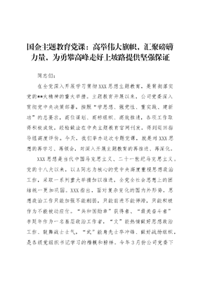 国企主题教育党课:高举伟大旗帜,汇聚磅礴力量,为勇攀高峰走好上坡路提供坚强保证同志们:在全党深入开展学习贯彻XXX思想主题教育,是贯彻落实党的**大精神的重大举措。主题教育开展以来,公司党委深入贯彻党中央决策部署,按照学思想、强党性、重实践、建新功的总要求,高位谋划、高标组织、高效推进,各项工作取得积极成效,经验做法在中央主题教育官网刊发,得到巡回指导组高度评价。今天,我们举办这次专题党课,就是对XXX思想的再学习、再领会,对深入开展主题教育的再推进、再深化。XXX思想是当代中国马克思主义、二十一世纪马克思主义。党的十八大以来,以A同志为核心的党中央高度重视思想政治工作,采取一系列重大举措加以推进,全党全社会思想上的团结统一更加巩固。XXX指出,面对复杂变化的国内外形势,思想政治工作只能加强不能削弱,只能前进不能停滞,只能积极作为不能被动应付。共和国勋章获得者、最美奋斗者李延年作为一名基层政治工作者,文能热情做好思想政治工作、鼓舞战士士气,武能身先士卒冲锋、做好战场组织,是各级党组织书记学习的楷模和榜样。今年3月份公司党委下发《关于学习实践12字精神特质争做李延年式基层党组织书记的意见》以来,广大党员干部积极响应,踊跃学习李延年先进事迹,努力提升思想政治工作能力,在公司上下营造了学习李延年、争做李延年的浓厚氛围。下面,结合主题教育学习思考和察实情、出实招领题调研情况,围绕加强和改进思想政治工作,我和大家交流三个方面的问题。第一个问题,为什么要抓好思想政治工作思想政治工作是党的优良传统、鲜明特色和突出政治优势是一切工作的生命线。我们党成立一百多年来,思想政治工作与党的事业相生相伴,与党的中心工作同频共振,在百年发展历程中发挥了巨大作用、取得了伟大成就。今天,我们反复强调加强和改进思想政治工作,其背景和意义可以归结为以下三个方面。(一)抓好思想政治工作是党的优良传统,具有深刻的历史意义纵观百年党史,既是一部共产党人践行初心使命,与人民心连心、同呼吸、共命运的历史,也是一部党的思想政治工作从无到有、从简单到复杂、从模糊到清晰、从偶发到科学的发展历史。新民主主义革命时期,我们党始终把掌握思想教育作为第一等的业务。在党的一大通过的决议中,就要求全党做好马克思主义的宣传工作和反帝反封建的革命教育工作,确立了党对宣传教育工作的领导地位。在井冈山斗争时期,我们党不断摸索发展并最终形成了一整套完整的思想政治教育体系。正如毛泽东同志在《井冈山的斗争》文中所说,红军的物质生活如此菲薄,战斗如此频繁,仍能维持不敝,除了党的作用外,就是实行军内的民主主义。在千头万绪的革命工作中,毛泽东同志始终坚持掌握思想教育是我们第一等的业务,他亲自领导开展的延安整风运动开创了运用思想政治工作治党的典范,当时提出的团结—批评—团结、惩前毖后、治病救人、批评与自我批评等思想政治教育原则,成为正确处理党内思想政治问题的基本原则。社会主义革命和建设时期,我们党进一步把思想政治工作作为治国的重要方式。新中国成立后,以毛泽东同志为核心的党中央明确提出,思想工作和政治工作,是完成经济工作和技术工作的保证。在1951年召开的第一次全国宣传工作会议上,刘少奇同志首次提出了思想政治工作概念,指出思想政治工作的必要性更加提高了,更加需要加强党的思想领导。1957年,毛泽东同志在《关于正确处理人民内部矛盾的问题》一文中进一步阐述了这一概念,强调要用民主的方法即讨论、批评、说服教育的方法,正确处理民主与集中、自由与纪律、理想与现实、个人利益与国家利益的关系。这是对新形势下群众性思想政治工作的经验总结,为此后思想政治工作的继续发展提供了理论指导,开创了马克思主义思想政治教育理论中国化的新境界。改革开放和社会主义现代化建设新时期,我们党对思想政治工作进行不断创新和发展。以邓小平同志为核心的党中央始终坚持物质文明和精神文明两手抓,两手都要硬,要求全党要适应新的条件,加强党的思想工作,防止埋头经济工作,忽视思想工作的倾向。江泽民同志进一步强调,搞好精神文明建设,抓好思想政治工作,是我们办好一切事情的保障。在社会转型进入关键时期,胡锦涛同志指出,思想政治工作必须结合经济工作和其他实际工作一道去做,把解决思想问题同解决实际问题紧密结合起来。在社会主义现代化建设进程中,面对经济建设、社会发展各种困难挑战,思想政治工作为安邦定国、政通人和作出了不可磨灭的贡献,取得了经济快速发展和社会长期稳定的巨大成就。(二)抓好思想政治工作是时代要求,具有重大的时代意义进入新时代,踏上新征程,既面临重大机遇,也面临诸多挑战。必须充分发挥思想政治工作的传家宝和生命线作用,为奋进新征程、建功新时代提供强大精神动力。从发展大势看,实现中华民族伟大复兴
