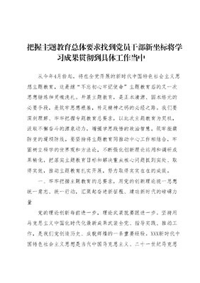 把握主题教育总体要求找到党员干部新坐标将学习成果贯彻到具体工作当中从今年4月份起,将在全党开展的新时代中国特色社会主义思想主题教育,这是继不忘初心牢记使命主题教育后的又一次思想锤炼和灵魂洗礼。开展主题教育,是正本清源、固本培元的必要手段,是筑牢思想根基,补足精神之钙的必经之路。我们要深刻理解、牢牢把握专题教育总要求,以此次主题教育为契机,汲取不懈奋斗的源泉动力,增强学思践悟的政治智慧,筑牢拒腐防变的堤坝防线。要坚持将主题教育同推动中心工作相结合,牢固树立科学的世界观和方法论,不断强化创新理论运用和调研成果转化,把落实主题教育目标和解决重点核心问题抓到实处、取得实效,推动主题教育扎实开展,努力取得实实在在的成效。一、牢牢把握主题教育的总要求,用党的创新理论统一思想统一意志、统一行动,汇聚起奋进新征程、建功新时代的磅礴力量党的理论创新每前进一步,理论武装就要跟进一步。坚持用马克思主义中国化时代化最新成果武装全党、指导实践、推动工作,是我们党创造历史、成就辉煌的一条重要经验。XXX新时代中国特色社会主义思想是当代中国马克思主义、二十一世纪马克思主义,是中华文化和中国精神的时代精华,实现了马克思主义中国化时代化新的飞跃。开展这次主题教育,就是要推动全党特别是领导干部不断把学习贯彻XXX新时代中国特色社会主义思想引向深入。(一)开展主题教育是提升党性修养的必然要求。主题教育既是提升党性修养的加油站,也是检视党性修养的放大镜,是必须严格推进的政治大体检。党员干部要紧抓主题教育契机,对照党的理论和路线方针政策、对照党章党规党纪、对照初心使命,再检视、再深化、再提升,确保教育整改全面扎实、反馈意见全面落实、实际效果全面提升。要自觉把主题教育节点作为干部四风的考点,不当无原则的老好人,不做不扛事的软肩膀,严于律己、严负其责、严管所辖,审慎稳妥处理好每件工作,确保不出纰漏、不留瑕疵、不埋隐患,持续走好主题教育长管长严的每一步。要牢牢把握学思想的要求,全面学习领会XXX新时代中国特色社会主义思想,既全面系统掌握这一思想的基本观点、科学体系,做到融会贯通避免碎片化、片面性;又把握好这一思想的世界观、方法论,坚持好、运用好贯穿其中的立场观点方法,更好领会这一思想的精髓要义,真正做到内化于心、外化于行,不断增进对党的创新理论的政治认同、思想认同、理论认同、情感认同,真正把马克思主义看家本领学到手,自觉用以指导各项工作。(二)开展主题教育要通过理想教育实现精神洗礼。XXX新时代中国特色社会主义思想,深刻彰显对马克思主义的信仰,对社会主义、共产主义的信念,集中反映了当代中国共产党人的政治品格、价值追求、精神风范,是新时代中国共产党的思想和精神旗帜。这次主题教育要牢牢把握强党性的要求,自觉用XXX新时代中国特色社会主义思想改造主观世界,不断筑牢信仰之基补足精神之钙、把稳思想之舵。广大党员干部要主动把自己的思想摆进去,深刻领会党的创新理论关于坚定理想信念、提升思想境界、加强党性锻炼等一系列要求,包括不忘初心、牢记使命,胸怀国之大者,提高政治判断力、政治领悟力、政治执行力三严三实,忠诚干净担当,为民务实清廉等等,始终保持共产党人的政治本色。要更加自觉深刻领悟两个确立的决定性意义,增强四个意识、坚定四个自信、做到两个维护,在思想上政治上行动上同以XXX同志为核心的党中央保持高度一致。(三)开展主题教育要将理论成果转化为实践应用。XXX新时代中国特色社会主义思想是实践的理论,这一思想扎根现实土壤回应实践需求,从理论和实践的结合上深入回答关系党和国家事业发展、党治国理政的一系列重大时代课题,是党和人民奋进新征程的行动指南。这次主题教育要牢牢把握重实践的要求,自觉践行XXX新时代中国特色社会主义思想,用以改造客观世界、推动事业发展。广大党员干部要坚持知行合一、真抓实干,把XXX新时代中国特色社会主义思想运用到贯彻落实党的XX大提出的重大战略部署中去,善于运用这一思想观察时代、把握时代、引领时代,积极识变应变求变,解决经济社会发展和党的建设中存在的各种矛盾问题,防范化解重大风险,推动中国式现代化取得新进展新突破。要抓好调查研究,扑下身子、沉到一线,把脉问诊、解剖麻雀,运用党的创新理论研究新情况、解决新问题。二、开展主题教育要坚持融会贯通,熟练掌握其中蕴含的领导方法、思想方法、工作方法,不断提高履职尽责的能力和水平本次主题教育的总要求是学思想、强党性、重实践、建新功。我们要始终在基层工作开展中坚持好、运用好理论立场观点方法,从内心增进对党的创新理论政治认同、思想认同、理论认同、情感认同。认真研读,深入领会,自觉用新时代中国特色社会主义思想指导各项工作。以理论思想改变主观世界,坚定理想信念、提升思想