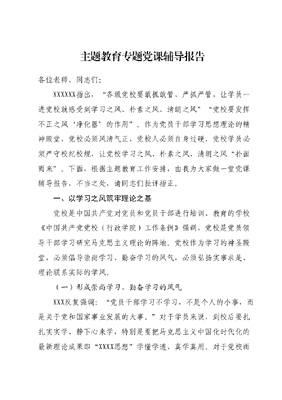 主题教育专题党课辅导报告各位老师,同志们:XXXXXX指出,各级党校要敢抓敢管、严抓严管,让学员一进党校就感受到学习之风、朴素之风、清朗之风党校要发挥不正之风净化器的作用。作为党员干部学习思想理论的精神殿堂,党校必须风清气正,党校人必须自身过硬,党校学员必须严守校纪校规,让党校学习之风、朴素之风、清朗之风扑面而来。下面,根据主题教育工作安排,由我为大家做一堂党课辅导报告,不当之处,请同志们批评指正。一、以学习之风筑牢理论之基党校是中国共产党对党员和党员干部进行培训、教育的学校《中国共产党党校(行政学院)工作条例》强调,党校是党员领导干部学习研究马克思主义理论的阵地。党校作为学习的神圣殿堂,必须倡导崇尚学习、勤奋学习的风气,必须弘扬实事求是、理论联系实际的学风。(一)形成崇尚学习、勤奋学习的风气XXX反复强调:党员干部学习不学习,不是个人的小事,而是关于党和国家事业发展的大事。对于学员来说,到校后要扎扎实实学、静下心来学,特别是要把马克思主义中国化时代化的最新理论成果即XXXX思想学懂学透、真学真用。对于党校而言,要把理论宣传和党性教育作为教学的中心任务,持续推进学习和贯彻新思想工作往深里走、往实里走、往心里走,让党员干部在党校全面系统地接受理论培训中持续培根铸魂。同时,党校要搭建平台,鼓励教师与学员之间、学员相互之间切磋交流,实现教学相长、学学相长。(二)发扬实事求是、理论联系实际的传统实事求是、理论联系实际是党校的优良传统和学风校风。xx时期,毛泽东为中央党校制定实事求是、不尚空谈的校训。1943年11月,xx中央党校大礼堂落成,毛泽东挥笔写就实事求是四个大字,镶嵌在大礼堂的门楣上。党校和学员要充分发扬实事求是的优良传统,要把理论教育与科研、决策咨询密切联系起来。学员要把理论学习与国家、民族、个人的命运紧密联系起来,在内心深处形成政治认同、思想认同、理论认同、情感认同,不断增强四个意识、坚定四个自信、做到两个维护,从而筑牢信仰之基、补足精神之钙、把稳思想之舵。十个明确十四个坚持,反映了以XXX同志为核心的党中央对中国特色社会主义规律性认识的深化、拓展、升华,是我们一切工作的遵循和指针。学习理论就是要活学活用,用理论来指导实践、用理论破解难题,找到解决问题的方法和路径。(三)营造民主、生动活泼的学习氛围1941年12月,毛泽东亲自审定《中共中央关于xx干部学校的决定》,要求:在学校内养成学生自由思想、实事求是、埋头苦干、遵守纪律、自动自治、团结互助的学风,而坚决反对主观主义、宗派主义、教条主义、好高骛远、武断盲从、夸夸其谈、自以为是及粗枝大叶不求甚解的恶习。在学校生活中,应该充分发挥民主,在学习中应提倡敢于怀疑、敢于提出问题、敢于发表意见与同志辩论问题的作风。对于错误的、不正确的思想,主要的应采取说服、解释与共同讨论的方法来纠正。也就是说,党校要坚持解放思想、实事求是,充分发扬民主,营造既有纪律又有自由、严肃认真、生动活泼的学习氛围,以实现理论教学和学术研究的创新性发展。二、以朴素之风涵养为民情怀俭,德之共也;侈,恶之大也。节俭朴素是我们党的传家宝。党校作为党委的重要工作部门、为党育才的重要阵地,理应在涵养朴素之风方面下功夫,助推党员领导干部忆苦思甜,牢记创业之艰辛、明白守业之艰难、深察民生之多艰,始终保持初心不改。(一)加强艰苦朴素的优良传统教育党校在党性教育课程中,应讲深讲透井冈山时期红军红米饭南瓜汤、挖野菜当粮的历史,讲深讲透xx时期党的领导人一身粗布、一双草鞋的历史,讲深讲透毛泽东等老一辈革命家始终保持着艰苦朴素作风的历史。1936年斯诺到达陕北,他说:我看到毛泽东住在简陋的窑洞里,穿的是打了补丁的衣服,吃的是小米饭和辣椒土豆丝;周恩来睡在土炕上;彭德怀穿的背心是用缴获敌人的降落伞做的。新中国成立后的三年困难时期,毛泽东等中央领导人与民同甘共苦,定下不吃肉、不吃蛋、吃粮不超定量的原则。党校要用这些鲜活的历史和红色故事感染人、启迪人,培育党员干部的艰苦朴素作风。(二)建设勤俭节约的良好校风党校作为干部学习的殿堂,要弘扬勤俭节约的优良传统,激发在校师生艰苦奋斗的精气神,让勤俭节约蔚然成风。党校要力戒奢靡之风,坚决杜绝豪华校门豪华办公楼(室)豪华宾馆和豪华电梯等;要制定文明用餐规范,在教师和学员中大力倡导吃完所购食物、不留剩饭剩菜的光盘行动;广泛开展节水节电节纸活动,以实际行动降低能源资源消耗,引导广大教师、学员、员工身体力行,从我做起、从点滴做起,大力推进节约型校园建设。(三)引导党员干部常持为民情怀中华传统文化素来重视民生民本,安民之道在于察其疾苦。从屈原长太息以掩涕兮,哀民生之多艰的感慨,到杜甫安得广厦千万间,大庇天下