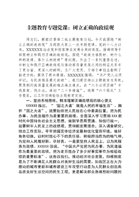 主题教育专题党课:树立正确的政绩观同志们,根据区委第二批主题教育计划,今天我围绕树立正确的政绩观为题跟大家上一次专题党课。党的十八大以来,XXXXXX站在党和国家事业发展全局的高度,强调领导干部要树立和践行正确的政绩观,围绕政绩为谁而树、树什么样的政绩、靠什么树政绩等问题,作出了一系列重要论述,对树立和践行正确政绩观与推动高质量发展之间的辩证关系有了更全面、更深入的阐明。为广大党员、干部干事创业指明了前进方向,提供了根本遵循。XXXXXX强调,共产党人必须牢记,为民造福是最大政绩。我们要坚持以主题教育为契机,聚焦制约高质量发展的难点痛点堵点,在六个必须坚持中找答案、找办法,谋划二十条措施,统筹六个强化工作要求,以工作实绩检验主题教育实效。一、坚持系统思维,精准理解正确政绩观的核心要义XXXXXX指出,国之大者就是人民的幸福生活。胸怀国之大者,就要始终把人民放在心中最高位置,把为民办事、为民造福作为最重要的政绩。全面深入学习贯彻XXX新时代中国特色社会主义思想,做到学思用贯通、知信行统一,就要树牢人民至上的政绩观,贯彻新发展理念,深入调查研究,结合工作实际,牢牢把握实体经济发展和优化营商环境,做好角色切换,以时时放心不下的责任感、积极担当作为的精气神,为党和人民履好职、尽好责。一是要坚持人民至上,以为民服务为政绩。XXXXXX强调,中国共产党把为民办事、为民造福作为最重要的政绩,把为老百姓办了多少好事实事作为检验政绩的重要标准。这告诉我们,推动经济社会发展,归根到底是为了不断满足人民群众对美好生活的需要。如我区正在大力推动的城市更新和城市建设三年攻坚行动是为人民群众创造高品质美好生活空间的民生工程,更是解决群众急难愁盼问题的民心工程。在今后工作中我们要将始终树牢以人民为中心的发展思想,坚持为民造福,充分考虑群众意愿、顺应群众需求,加快推进历史城区保护、公园城市建设、拆违治乱,持续提升城市品质和人居环境。坚持为民解忧,聚焦群众关心关注的住与行,扎实做好老旧小区、背街小巷及农村低收入困难群体危房改造,深入开展物业领域品质提升行动,加快停车设施建设和道路贯通,用心用情用力解决群众的急难愁盼,切实让群众住得好、行得畅。坚持为民谋利,在低效片区、河道综合治理开发等重大项目推进中,注重算大账、算整体账、算长远账,做到不与民争利,让城市更新成果更多惠及广大人民群众。二是要贯彻新发展理念,以助推发展为政绩。XXXXXX深刻指出,要树立正确政绩观,处理好稳和进、立和破、虚和实、标和本、近和远的关系,坚持底线思维,强化风险意识,自觉把新发展理念贯穿到经济社会发展全过程。这告诉我们,在新时代干工作、抓发展,必须完整、准确、全面贯彻新发展理念。坚持规划先行,统筹好当前改造和长远发展,高标准开展李村河(张村河)流域、重点低效片区等重要区位城市设计,一揽子做好产业布局调整、基础设施配套的文章,努力做到集约高效利用城市土地和空间资源,为城市发展留足空间。坚持绿色低碳,加快生态治理和绿化建设,抓好重点河流流域环境综合整治,大力推进公园城市建设和山头公园整治工作,高效开展全国智能建造试点任务,全周期规范建筑垃圾管理和生活垃圾分类,因地制宜推动生产、生活、生态协同发展。坚持实事求是,从实际出发谋划事业和工作,对重点工作、重点项目进行系统梳理、反复论证,确保符合国家战略、符合我市实际,能够经得起历史、人民和实践的检验。三是要深化作风建设,以干出实效为政绩。XXXXXX指出,要坚持真抓实干、狠抓落实,一切工作都要往实里做、做出实效。要坚持问题导向,针对城市建设管理中出现的难点、堵点问题,开展深入调研,将问题摸清、原因摸透、方法找准,有的放矢解决制约发展的瓶颈、化解群众心里的疙瘩,让群众心情更舒畅,对城市更热爱;要坚持一线工作,根据分管领域特点,带领广大干部用脚步丈量城市的每一个角落,在田间地头、社区一线、重要片区、重点项目等现场一线逐点找不足、逐项抓整改;要坚持担当作为,遇到问题不推诿,碰到矛盾不打怵,秉持遇水架桥、逢山开路的态度,以钉钉子精神狠抓城市更新建设中的堵点、难点、痛点,一件一件解决、一项一项攻克,以更加严实的作风、更加务实的举措、更加有力的担当为加快推进新时代社会主义现代化城市作出更大贡献。二、注重统筹兼顾,准确把握正确政绩观与高质量发展的关系要深刻把握政绩观的内涵实质,充分认识到政绩观的力量源泉是依靠人民群众,政绩观的初心是为人民谋利益,政绩观的方法论是实事求是、实干担当,政绩观的评判标准是人民群众,只有经得起历史考验的政绩才是真正的政绩。只有深刻领会正确政绩观的丰富内涵和实践要求,进一步增强树立和践行正确政绩观的思想自觉、政治自觉、行动自觉,才能在工作中作出科学的决策、正确的选择,无愧