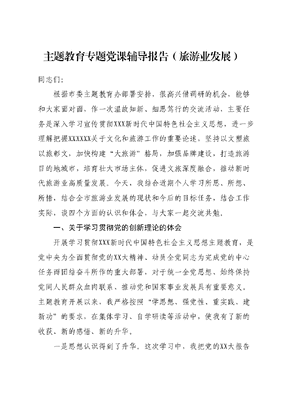 主题教育专题党课辅导报告(旅游业发展)同志们:根据市委主题教育办部署安排,很高兴借调研的机会,能够和大家面对面,作一次温故知新、细思笃行的交流活动,主要任务是深入学习宣传贯彻XXX新时代中国特色社会主义思想,进一步理解把握XXXXXX关于文化和旅游工作的重要论述,坚持以文塑旅以旅彰文,加快构建大旅游格局,加强品牌建设,打造旅游目的地城市,培育壮大市场主体,促进文旅深度融合,推动新时代旅游业高质量发展。今天,我结合近期个人学习所思、所想、所悟,结合全市旅游业发展的现状和今后的目标任务,结合工作实际,谈四个方面的认识和体会,与大家一起交流共勉。一、关于学习贯彻党的创新理论的体会开展学习贯彻XXX新时代中国特色社会主义思想主题教育,是党中央为全面贯彻党的XX大精神、动员全党同志为完成党的中心任务而团结奋斗所作的重大部署,对于统一全党思想、始终保持党同人民群众血肉联系、推动党和国家事业发展具有重要意义。主题教育开展以来,我严格按照学思想、强党性、重实践、建新功的要求,在集体学习、自学研读等活动中,使我有了新的收获、新的感悟、新的升华。一是思想认识得到了升华。这次学习中,我把党的XX大报告党章、《XXX著作选读》等内容作为重点,通过静下心来读原著、学原文、悟原理,对XXX新时代中国特色社会主义思想的科学体系精神实质、实践要求有了进一步把握,对贯穿其中的马克思主义立场、观点、方法有了新的认识,更加自觉用XXX新时代中国特色社会主义思想武装头脑,始终做XXX新时代中国特色社会主义思想的坚定信仰者和忠诚实践者。二是党性修养得到了提高。通过学习XXXXXX关于党性修养的一系列重要论述,深刻认识到作为一名党员领导干部,要始终坚定理想信念、强化党性锻炼、提升党性修养、坚守党性原则,不断锤炼对党忠诚的政治品质,始终保持共产党人的浩然正气。时刻牢固树立党章意识,自觉用党章规范自己的一言一行,筑牢信仰之基、补足精神之钙、把稳思想之舵,在任何情况下坚决做到政治信仰不变、政治立场不移、政治方向不偏。三是使命担当得到了增强。XXX指出:干部敢于担当作为,既是政治品格,也是从政本分。在实际工作中,我将始终保持只争朝夕、奋发有为的奋斗姿态和越是艰险越向前的斗争精神,担当起应该担当的责任,始终把发展扭住,着力把重点抓住,坚持有什么问题就解决什么问题,什么问题突出就重点解决什么问题,勇于挑最重的担子、啃最硬的骨头、接最烫的山芋,在解决一个又一个问题中推动发展,真正做到不负重托、不辱使命。四是宗旨意识得到了深化。通过学习使我清醒的认识到,作为一名党员领导干部,要时刻牢记党的一切工作都是为了实现好维护好、发展好最广大人民根本利益,时刻牢记全心全意为人民服务的根本宗旨。要把守初心、担使命体现到落实党中央决策部署和省市委工作要求上,体现到提升景区品质、丰富景区业态等一件件实际工作中,实干苦干,不务虚功,把主题教育的成果转化为践行党的根本宗旨的自觉行动。二、关于学习贯彻党的创新理论的感悟一是坚持深学细悟,方可提升能力素质。XXXXXX指出:好学才能上进,中国共产党人依靠学习走到今天,也必然要依靠学习走向未来。我们要坚持一篇一篇读原著、逐段逐句学原文,做到全面系统学、突出重点学、及时跟进学、反反复复学,深刻领会、准确把握XXX新时代中国特色社会主义思想的科学体系和丰富内涵,全面把握贯穿其中的立场观点方法,切实切实将主题教育学习成果转化为干事创业的强大动力。要做到真思、思透,真悟、悟透,知其言更知其义、知其然更知其所以然,切实悟出贯穿其中的中国共产党人的政治品格、价值追求、精神境界、作风操守,蕴藏其中的真理力量、实践力量、人格力量,坚持不懈用XXX新时代中国特色社会主义思想凝心铸魂。二是坚定理想信念,方可做到绝对忠诚。XXX指出,坚定理想信念,坚守共产党人精神追求,始终是共产党人安身立命的根本。坚定理想信念,重在绝对忠诚。作为党员干部,忠诚是第一位的要求。绝对忠诚和坚定理想信念是相通相致的,两者都体现出不谈条件和回报;都表现为严格履行责任、义务和操守,为党尽忠、为国尽职、为民尽责;都是人生最重要的品质,更是共产党人最重要的品质。对党绝对忠诚,最根本的就是用好党的创新理论,内化于心、外化于行,发自内心、坚定不移,树牢四个意识,坚定四个自信,做到两个维护,严守党的政治纪律和政治规矩,始终在政治立场、政治方向、政治原则、政治道路上同以同志为核心的党中央保持高度一致,做到任何时候都站得稳、靠得住、不动摇。三是树牢发展意识,方可全力抓好落实。坚定不移抓落实,是我们党在革命、建设、改革各个历史时期,带领广大人民群众战胜一个又一个困难、夺取一个又一个胜利的重要法宝。正如XXXXXX所言,如果不沉下心来抓落实,再好的目标,再好的蓝图,也只是镜中花、水中月。党员领导干