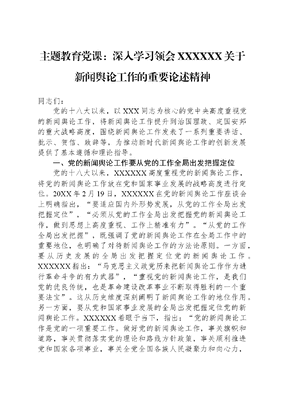 主题教育党课:深入学习领会XXXXXX关于新闻舆论工作的重要论述精神同志们:党的十八大以来,以XXX同志为核心的党中央高度重视党的新闻舆论工作,将新闻舆论工作提升到治国理政、定国安邦的重大战略高度,围绕新闻舆论工作发表了一系列重要讲话、批示、贺信、致辞等,为推动新时代新闻舆论工作的创新发展提供了基本遵循和理论指导。一、党的新闻舆论工作要从党的工作全局出发把握定位党的十八大以来,XXXXXX高度重视党的新闻舆论工作,将党的新闻舆论工作放在党和国家事业发展的战略高度进行定位。20XX年2月19日,XXXXXX在党的新闻舆论工作座谈会上明确指出,要适应国内外形势发展,从党的工作全局出发把握定位,必须从党的工作全局出发把握党的新闻舆论工作,做到思想上高度重视、工作上精准有力。从党的工作全局出发把握,既强调了党的新闻舆论工作在全局工作中的重要地位,也明确了对待新闻舆论工作的方法论原则。一方面,要从历史发展的全局出发把握定位党的新闻舆论工作。XXXXXX指出:马克思主义政党历来把新闻舆论工作作为进行革命斗争的有力武器,重视党的新闻舆论工作,是我们党的优良传统,也是革命建设改革事业不断取得胜利的一个重要法宝。这从历史维度深刻阐明了新闻舆论工作的地位作用。另一方面,要从党和国家事业发展的全局出发把握定位党的新闻舆论工作。XXXXXX着眼于当下,指出:党的新闻舆论工作是党的一项重要工作。做好党的新闻舆论工作,事关旗帜和道路,事关贯彻落实党的理论和路线方针政策,事关顺利推进党和国家各项事业,事关全党全国各族人民凝聚力和向心力,事关党和国家前途命运,做好党的新闻舆论工作,营造良好舆论环境,是治国理政、定国安邦的大事。在会见中国记协第九届理事会全体代表和中国新闻奖、长江韬奋奖获奖者代表时,XXXXXX再次指出,做好党的新闻舆论工作,营造良好舆论环境,是治国理政、定国安邦的大事,党的新闻舆论工作是党的工作的重要组成部分。XXXXXX从治党治国的战略高度,用一项重要工作五个事关重要组成部分精准定位新闻舆论工作在党的全局工作中的重要位置,阐释了党的新闻舆论工作与党和国家全局工作的内在关系,为党的新闻舆论工作做到思想上高度重视、工作上精准有力提供了重要指导。二、党的新闻舆论工作要牢牢把握党性原则党性原则是党的新闻舆论工作历来所必须坚持的一项根本原则。XXXXXX不仅在多个场合反复强调新闻媒体的党性原则,而且从理论层面作出深刻全面的论证和阐释,指明牢牢坚持党性原则的途径方法。在根本要义上,坚持党性原则就是要坚持党对新闻舆论工作的领导,坚持正确政治方向。20XX年8月19日,XXXXXX在全国宣传思想工作会议上提出,要坚持党管媒体原则不动摇,坚持政治家办报、办刊、办台、办新闻网站。在党的新闻舆论工作座谈会上,XXXXXX进一步提出:党性原则是党的新闻舆论工作的根本原则。党管宣传、党管意识形态、党管媒体是坚持党的领导的重要方面。XXXXXX结合新闻舆论工作的特点,将党性原则具体化为党管宣传、党管意识形态、党管媒体,有针对性地提出新闻宣传领域坚持党性原则的具体要求。XXXXXX高度重视媒体的政治导向,提出八个讲导向:各级党报党刊、电台电视台要讲导向,都市类报刊、新媒体也要讲导向;新闻报道要讲导向,副刊、专题节目、广告宣传也要讲导向;时政新闻要讲导向,娱乐类、社会类新闻也要讲导向;国内新闻报道要讲导向,国际新闻报道也要讲导向。将党性原则覆盖到包括新媒体在内的所有媒体中。在价值立场上,坚持党性原则要全面把握好党性和人民性的关系。XXXXXX明确指出,党性和人民性从来都是一致的、统一的……从本质上说,坚持党性就是坚持人民性,坚持人民性就是坚持党性,党性寓于人民性之中,从党性和人民性的辩证关系角度,对二者的内在联系进行了全面系统的阐释。在党的新闻舆论工作座谈会上,XXXXXX结合新闻舆论工作特点,进一步指出新闻媒体要把对党负责和对人民负责统一起来、把服务群众同教育引导群众结合起来、把满足需求同提高素养结合起来,明确对党负责和对人民负责的内在统一性,为践行党性与人民性相统一原则提供了行动指南和价值遵循。在行动取向上,坚持党性原则要遵循团结稳定鼓劲、正面宣传为主的基本方针。20XX年8月19日,XXXXXX在全国宣传思想工作会议上指出:关键是要提高质量和水平,把握好时、度、效,增强吸引力和感染力,让群众爱听爱看、产生共鸣,充分发挥正面宣传鼓舞人、激励人的作用。在党的新闻舆论工作座谈会上,XXXXXX结合新闻舆论工作的特点,对这一方针作出进一步阐释,坚持团结稳定鼓劲、正面宣传为主,涉及怎样看待真实性这个重大问题,搞清楚是个别真实还是总体真实,不仅要准确报道个别事实,而且要从宏观上把握和反映事件或