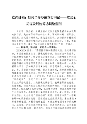 党课讲稿:如何当好乡镇党委书记——驾驭全局谋发展统筹协调绘蓝图乡村治,百姓安。乡镇党委书记作为我国最基层中央政策的执行者,是全镇干部群众的主心骨,面对新时期、新形势、新问题,必定要与时俱进,深化思想认识,主动担负乡村振兴的历史重任,推动全镇经济社会发展再上新台阶。下面,我将结合自身工作,浅谈如何当好乡镇党委书记的一些体会。一、勤学习,强修养,知行合一干事业。XXXXXX指出:要坚持不懈加强理论武装,坚定理想信念,牢记党的性质宗旨,强化党性修养,切实解决一些党员、干部理想信念缺失、宗旨意识淡化等问题,不断增强全党同志党的意识、党员意识。作为乡镇党委书记,要以高度自觉性,坚持不懈的通过学习汲取营养,增长知识,增强本领。一是加强理论学习。坚持每天自学1小时,从思想观念上和党中央、省、市、县委保持绝对一致,提高自身素质,提升政治敏感性,增强廉洁自律的免疫力。坚持带头落实三会一课制度,积极参加党组织生活,上好党课,开好民主生活会,牢固树立四个意识,坚定四个自信,做到两个维护,全面落实从严治党要求。二是强化实践学习。我镇紧邻高铁高速,交通便利,但是大部分区域均在水源保护地内,不适合大型企业发展。按照XXX指示精神,化劣势为优势,把发展农村特色产业作为抓手,不断提高全镇村民生活水平。截止目前,依托东方酒业,大力推进酒香小镇建设,打造东方酒厂—窖藏基地—X故居旅游线路,促进观光农业纵深发展。重点建设X村葡萄种植园、X村山楂种植园、X蔬菜种植园等3个的规模化、现代化、产业化农村种植项目,发展特色农业。成立高效农业合作社20余家,黑色花生、东方合作社的各类蔬菜畅销京津冀市场,不断增强人民群众获得感、幸福感、安全感。二、抓班子,带队伍,民主集中强机制。抓班子、带队伍是乡镇党委书记的主要职责,班子抓好了党委就有威信,班子就有凝聚力,党员群众就有积极性。在抓班子干部队伍中着力做到三个坚持:一是坚持民主集中制。在统筹发展、资金使用、干部调整、工作安排等方面,及时召开党委会,坚持民主集中制,多和班子成员谋一谋、议一议,善于听取不同意见和建议,做到大事讲原则,小事讲风格,有效避免决策失误,确保决策科学化。在今年年初修缮便民服务大厅工作中,个别同志提出:修建便民服务大厅按要求达标即可,不需要加大投入。通过多次在党委会上沟通谈心,统一思想,达成共识:高标准建设便民服务大厅。建成后的便民服务大厅占地70余平方,重新粉刷墙体、天花板,整合办公资源,配备办公设备,新增休息椅、报架、便民雨伞、饮水机、老花镜等便民设施,最大限度的为群众办理业务提供方便,成为我镇为民服务亮点工程。二是坚持用人标准。按照信念坚定、为民服务、勤政务实、敢于担当、清正廉洁的好干部标准选人用人。调整优秀青年干部6名补充到中层岗位,使每一名干部都能充分发挥出自己的才能,避其所短,用其所长,让人人肩上有任务,个个身上有指标。三是坚持队伍团结。加强干部团结建设,每一名干部在工作中遇到困难时,多给予鼓励与支持,在生活上多关心,努力帮助解决难题。每月定期与干部谈心交流,达到思想上相通,认识上相容,工作上拧成一股绳,决不能在干部之间存在抱怨、怀疑、对立、拆台和较量。同时,搞好村级班子选优配强工作,将政治上靠得住、工作上有本事、作风上过得硬、人民群众信得过的优秀人才调整到村两委班子领导岗位上,努力形成全镇上下干事创业的良好氛围。三、善工作,谋全局,围绕中心促发展。作为一名乡镇党委书记,必须站在大局立场,以长远眼光统筹考虑镇域民生经济和谐稳定发展。1984年2月8日,XXXXXX在正定县委工作会议上对干部提出要求:要有战略头脑,通观全局,科学的安排各项工作。在重点问题上,要做到三个在前。一是人民利益在前。人民对美好生活的向往,就是我们奋斗的目标。集中力量对镇域范围内大街小巷全部硬化,有效解决雨后路面积水、群众出行困难问题。国省县道及村内主要道路全部安装路灯,安排专人负责,及时检修维护,实现镇域范围内全面亮化,极大方便了村民晚上出行。积极对接菜市场北迁项目,认真谋划,科学选址,高标准打造农村菜篮子工程;拆除路边违建、废旧场所3200余平,美化亮化墙面340余平,高铁沿线造林绿化400亩,修建休闲公园、小广场20余处,加强农村人居环境整治,推进农村精神文明建设。二是企业发展在前。坚持创新、协调、绿色、开放、共享的发展理念,取缔小散乱污违法企业6家,对涉及VOCs工序的4家企业实行重点时段错时生产,多措并举做好大气污染防治工作。协助贸易有限公司引进酵素生产项目,申报2家规上企业,惠及民生,助推镇域企业发展。截止目前,我镇规模以上企业完成总产值近30亿元,固定资产投资完成60亿元。三是长远规划在前。始终秉持为官一任、造福一方的理想和信念,好事办好