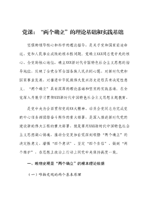 党课:两个确立的理论基础和实践基础坚强的领导核心和科学的理论指导,是关乎党和国家前途命运、党和人民事业成败的根本性问题。党确立XXX同志党中央的核心、全党的核心地位,确立XXX新时代中国特色社会主义思想的指导地位,反映了全党全军全国各族人民共同心愿,对新时代党和国家事业发展、对推进中华民族伟大复兴历史进程具有决定性意义。两个确立具有深厚的理论基础和坚实的实践基础。在全党深入开展学习贯彻XXX新时代中国特色社会主义思想主题教育,是党中央为全面贯彻党的XX大精神、动员全党同志为完成党的中心任务而团结奋斗所作的重大部署,是深入推进新时代党的建设新的伟大工程的重大部署,就是要用XXX新时代中国特色社会主义思想凝心铸魂,推动全党更加自觉深刻领悟两个确立的决定性意义,增强四个意识、坚定四个自信、做到两个维护,在思想上政治上行动上同党中央保持高度一致。一、唯物史观是两个确立的根本理论依据(一)唯物史观的两个基本原理我们知道,历史观有两种,一种是唯心史观,另一种是唯物史观。唯心史观的主要缺陷是:至多考察了人们活动的思想动机而没有进一步考究思想动机背后的物质动因和经济根源,因而从社会意识决定社会存在的前提出发,把社会历史看成是精神发展史,否认社会历史的客观规律,否认人民群众在社会历史发展中的决定性作用。唯物史观有两个基本原理,一个是人民群众是历史创造者的原理。这个原理强调的是,人民群众是社会物质财富的创造者,是社会精神财富的创造者,是社会变革的决定力量,同时又承认个人对社会发展的影响作用,甚至是重大的影响作用。唯物史观认为,社会历史发展是无数个人合力作用的结果,每个人在历史发展过程中都起一定的作用。每个人尽管在历史上发挥作用的性质和程度各不相同,但都会在历史上留下自己的印记。离开了每一个个人的作用,也就不可能有群众的作用。马克思曾指出,每一个社会时代都需要有自己的大人物,如果没有这样的人物,它就要把他们创造出来。唯物史观也强调,杰出人物对历史发展有着深刻影响。在历史发展进程中,新的历史任务往往是由杰出人物首先发现并提出来的。因为他们比一般人站得高、看得远,解决历史任务的愿望比别人更强烈、更主动,能为群众指明革命斗争的方向,在革命斗争中起着领导核心作用。杰出人物的出现虽然是一种偶然现象,但却具有历史必然性。另一个是社会存在决定社会意识、社会意识反作用于社会存在的原理。这一原理强调的是,正确反映事物和合乎客观规律的思想认识就是真理,不能正确反映事物和不合乎客观规律的思想认识就是谬误。真理对认识和改造世界具有极大的能动的指导作用。1950年9月10日,刘少奇同志在马列学院第二、三班开学典礼上的讲话指出,理论是实际工作的指针,没有理论,工作就是盲目的,没有前途的。没有理论的人容易被俘虏,被人家天花乱坠的话所迷惑。掌握了理论才能正确地指导工作。2017年9月29日,XXXXXX在十八届中共中央政治局第四十三次集体学习时强调:时代在变化,社会在发展,但马克思主义基本原理依然是科学真理。马克思主义就是我们党和人民事业不断发展的参天大树之根本,就是我们党和人民不断奋进的万里长河之泉源背离或放弃马克思主义,我们党就会失去灵魂、迷失方向。在坚持以马克思主义为指导这一根本问题上,我们必须坚定不移,任何时候任何情况下都不能动摇。由此可见,坚持科学的理论指导是这一基本原理的必然要求。所以,我们坚持和发展中国特色社会主义,必须高度重视理论的作用,增强理论自信和战略定力对于唯物史观的这两个基本原理,我们应该全面准确地理解和把握,如果重视和强调一个方面而忽视和丢掉另一个方面,就会犯机械论、片面性的错误,就不能科学地解释历史,也就无法正确地认识和把握历史发展规律。(二)两个确立建立在唯物史观的两个基本原理基础之上第一,党确立XXX同志党中央的核心、全党的核心地位与人民群众是历史创造者的基本原理。XXXXXX是从人民中走出来的、对人民怀有真挚感情和强烈责任感的人民领袖,无论是在基层、地方工作,还是在中央工作,都始终把人民挂在心头、念在心里。人民至上是XXX新时代中国特色社会主义思想的理论基点、价值支点、实践原点,也是治国理政的出发点、落脚点。XXXXXX表示:党中央的核心、全党的核心,对我来说就是责任,我要用毕生精力和全部生命来回报党和人民的信任,鞠躬尽瘁、死而后已,赴汤蹈火、万死不辞。XXXXXX强调,我们的责任,就是要团结带领全党全国各族人民接过历史的接力棒,继续为实现中华民族伟大复兴而努力奋斗XXXXXX还表示:我始终放在心上的,有这样几件事:五千年的文明不能搞丢了,老祖宗留下的地盘不能搞小了,正确的发展道路不能走歪了,老百姓的日子要过好了。2019年6月24日,XXXXXX在十九届中共中央政治局第十五次集体学习时