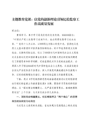 主题教育党课:以党的创新理论引领纪检监察工作高质量发展同志们:重视学习、善于学习是我们党的优良传统。XXXXXX指出:中国共产党人依靠学习走到今天,也必然要依靠学习走向未来。党的十八大以来,以XXX同志为核心的党中央,坚持把马克思主义基本原理同中国具体实际相结合、同中华优秀传统文化相结合,从新的实际出发,创立了XXX新时代中国特色社会主义思想对关系新时代党和国家事业发展的一系列重大理论和实践问题进行了深邃思考和科学判断,纪检监察机关作为党的政治机关,必须深入学习领会XXX新时代中国特色社会主义思想,认真落实健全全面从严治党体系任务要求,深入开展党风廉政建设和反腐败斗争,以党的创新理论为指引,推动纪检监察工作高质量发展。下面,我以《学思践悟新思想砥砺奋进建新功以党的创新理论引领纪检监察工作高质量发展》为题,围绕学习贯彻党的创新理论,从深刻领会精髓要义、从严落实重要要求、准确把握职责定位三个方面,与大家交流分享几点体会。一、深刻领会精髓要义,切实增强捍卫两个确立的思想自觉政治自觉行动自觉马克思主义政党的先进性,首先体现为思想理论上的先进性党的十八大以来,XXXXXX鲜明提出理论强党这一重大命题并作出深刻阐释,不仅回顾历史、总结经验,强调注重思想建党理论强党,是我们党的鲜明特色和光荣传统,而且立足现实、着眼未来,强调只有坚持思想建党、理论强党,不忘初心才能更加自觉,担当使命才能更加坚定。站在新的历史起点上,深刻学习领会XXXXXX关于理论强党的重要论述,对于加强党的思想理论建设,具有十分重要的指导意义。(一)深刻领悟两个确立的决定性意义。中国共产党作为马克思主义政党,坚强的领导核心和科学的理论指导是我们党创造历史伟业的成功密码。纵观党的历史,遵义会议前,我们党一直没有形成一个核心、领袖,党的事业屡经挫折、屡陷被动。从遵义会议开始,党确立了毛泽东同志的核心、领袖地位,有了坚强有力的领导,最终取得了革命的胜利。十一届三中全会后,党及时确立了邓小平同志的核心、领袖地位,迅速拨乱反正,实现工作重心转移,走上了改革开放的强国之路。党的十八大以来以XXX同志为核心的党中央带领全国人民,稳经济、促发展,战贫困、建小康,控疫情、抗大灾,应变局、化危机,攻克了一个个难关险阻、创造了一个个发展奇迹。之所以能取得这些历史性成就和历史性变革,最根本在于有XXXXXX作为党中央的核心、全党的核心掌舵领航、运筹帷幄;在于有XXX新时代中国特色社会主义思想的举旗定向、科学指引。可以说,两个确立是党在新时代取得的最重大的政治成果、最重要的历史经验,是党应对一切不确定性的最大确定性、最大底气、最大保证。我们必须深刻领悟两个确立的决定性意义,矢志不渝地拥戴核心、信赖核心忠诚核心、紧跟核心,始终在思想上政治上行动上同以XXX同志为核心的党中央保持高度一致,更加自觉地增强四个意识、坚定四个自信、做到两个维护。(二)深刻领悟XXX新时代中国特色社会主义思想的世界观和方法论。党的十八大以来,XXXXXX把马克思主义基本原理同中国具体实际相结合、同中华优秀传统文化相结合,科学回答时代和实践提出的重大问题,创立了XXX新时代中国特色社会主义思想,实现了马克思主义中国化时代化的新飞跃。在党的XX大上,XXXXXX从最深层次、最高抽象的角度凝练了新时代中国特色社会主义思想的基本内核和本质规定,所蕴含的世界观和方法论、所贯穿的立场观点方法,即六个必须坚持(必须坚持人民至上、坚持自信自立、坚持守正创新、坚持问题导向、坚持系统观念、坚持胸怀天下)。这六个必须坚持,既与马克思主义的世界观和方法论一脉相承,又来源于党的百年奋斗历史经验,尤其是以XXX同志为核心的党中央治国理政经验总结,具有坚实的真理力量和实践力量,是理解掌握XXX新时代中国特色社会主义思想的金钥匙,是引领各项事业不断前进的行动指南。要持续学懂弄通做实XXX新时代中国特色社会主义思想,把握好这一思想的世界观和方法论,坚持好、运用好贯穿其中的立场观点方法,领会好蕴含其中的道理学理哲理,做到知其言更知其义、知其然更知其所以然。(三)深刻领悟中国式现代化的使命任务。实现中华民族伟大复兴,是近代以来中国人民的共同梦想。新中国成立特别是改革开放以来,我们党团结带领全国人民通过走中国式现代化道路仅用几十年的时间就走完了西方发达国家几百年走过的工业化历程,创造了世所罕见的经济快速发展和社会长期稳定两大奇迹。党的十八大以来,党对建设社会主义现代化国家在认识上不断深入、战略上不断成熟、实践上不断丰富,成功推进和拓展了中国式现代化。XXXXXX强调,一个国家走向现代化,既要遵循现代化一般规律,更要符合本国实际,具有本国特色。党的XX大报告概括了中国式现代化,是人口规模巨大、全体人民共同富裕