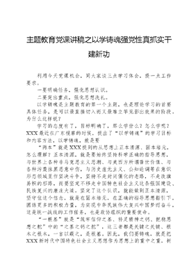 主题教育党课讲稿之以学铸魂强党性真抓实干建新功利用今天党课机会,同大家谈三点学习体会,提一点工作要求。一要明确任务,强化思想认识。二要突出重点,强化思想洗礼。以学铸魂是主题教育的第一个主题,也是理论学习的首要具体任务,是可以最直接切入而又最难立竿见影出效果的阶段。为什么这样说?学习的态度有了,目标明确了,那么学什么?怎么学呢?XXX最近在广东视察的时候,提出了以学铸魂的学习目标和内容方法,以学铸魂,就是要两本就是XXX提到的从思想上正本清源、固本培元,怎么理解?正本清源,就是要始终坚持科学正确的指导思想,与世界上各种非马克思主义思潮、与美西方所谓普世价值、与各种污蔑抹黑恶意中伤,与历史虚无主义、公知论调等在意识形态领域里作坚决斗争,坚持不走封闭僵化的老路,不走改旗易帜的邪路,而要坚定不移走中国特色社会主义这条强国建设、民族复兴的康庄大道。坚定了这个认识,就能做到正本清源,坚守住这个信念,就是在固本培元,在正确的指导思想指引下,团结更多的积极力量,为实现中华民族伟大复兴中国梦而奋斗,这是统一战线的工作任务,也是政协组织的重要使命。一根基就是筑牢信仰之基、补足精神之钙、把稳思想之舵中的之基之钙之舵,这三者都是关键之关键、根本之根本,一言以蔽之,是根基。因此,我们要铸魂,就是把XXX新时代中国特色社会主义思想作为思想上的重中之重,树牢、铸就、做实,真正成为我们思想的引领、意志的根基,前进的航标、奋斗的动力。为此,要增强四个意识,坚定四个自信,用两个维护的实际行动忠实捍卫两个确立的决定性意义。XXX还告诉我们,以学铸魂包含了三个层面的含义:一是坚定理想信念。首先必须实现理论武装,理论上成熟是政治上成熟的基础,而政治上的坚定源于理论上的清醒,只有把理论学懂弄通,才有政治上坚定信仰,所以说读原著学原文悟原理,就是为了努力做到理论上的清醒。其次,要增强对党的价值追求和前进方向的高度政治认同,明白作为党员必须在为实现党的奋斗目标而勇毅前行上坚定不移、坚韧不拔。再就是理想信念的坚定,表现在把好自身的世界观、人生观、价值观这个总开关,没有正确的三观,就不会有坚定的信仰。二是筑牢对党忠诚。首先是要自觉坚持党的全面领导,坚定维护党中央权威和集中统一领导。一个党员,如果对党的全面领导、党中央权威和集中统一领导不坚定、不信服、不尊崇,就不能做到对党忠诚,因为对党忠诚是体现在时时处处、人人事事上的,很具体、不抽象。其次是如何强化对党的绝对忠诚呢?就必须不断提高政治三力,强化对政治三力的历练、淬炼、锻炼,思想上不断成熟、意志上百炼成钢,把对党忠诚体现到贯彻落实好党中央决策部署的实际行动上。三是站稳人民立场。首先是要牢固树立并不断强化宗旨意识,切实加深对人民就是江山、江山就是人民人民对美好生活的向往,就是我们的努力方向以人民为中心的发展思想等的理解和把握,学习XXX我将无我、不负人民宁可得罪千百人,绝不辜负十四亿的坚定决心和坚强意志。XXX时刻把人民放在心上,是我们坚守宗旨意识的最好榜样。其次,站稳人民立场要求我们始终坚守初心使命。从新民主主义革命胜利夺取政权到七十多年来党的执政为民,我们党始终在践行着为中国人民谋幸福、为中华民族谋复兴的初心使命。作为马克思主义政党,中国共产党没有自己任何的其他利益,就是以人民的利益为自身的利益,而广大群众也始终用党和人民的鱼水情深、用小推车推出的淮海战役等来支持我们党和军队,因为群众知道这是他们自己的党、自己的军队。同样,长期执政的中国共产党,始终践行党的群众路线,把人民满意不满意作为评判一切工作的标准,充分体现了党和人民在一起,人民和党心连心的密切联系。第三,就是要努力解决好人民群众最关心最直接最现实的利益问题,通过深入细致有效的调查研究,发现问题、解决问题,把惠民生的事办实、暖民心的事办细、顺民意的事办好,让现代化建设成果更多更公平惠及全体人民。群众的满意度,既是给我们践行宗旨意识打分,也是对开展主题教育成效的评判。三要狠抓落实,提高两力两率。狠抓落实,是做好工作的落脚点;解决问题,是做好工作的终极目标。我们为群众解难题、办实事,最终还是要通过抓好落实来解决问题,而不能用抓而不实、浮于表面、形式主义、不切实际等思维方式、工作形式来对付。事实上,在我们平时的工作中,上述情况并不少见,如以文件落实工作、把开会当成落实、说了就等于做了、搞调研依赖于报表、做决策不了解基层等,都是机关里熟视无睹、见怪不怪的惯常做法。怎样利用主题教育来改变?我想,就是要深刻查找习以为常的认识偏差、反思自以为是的官僚作派、纠正不以为然的工作作风,做到三思并行。一是思想要重视。体现在:一要重视学习的关键性。即主题教育不仅要学习贯彻XXX新时代中国特色社会主义思想,更