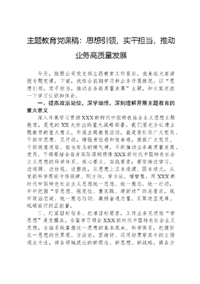 主题教育党课稿:思想引领,实干担当,推动业务高质量发展今天,按照公司党支部主题教育工作要求,我来给大家讲授专题党课,下面,我结合前期学习和业务开展情况,以思想引领,实干担当,推动业务高质量发展主题,和大家交流一下学习认识和体会。一、提高政治站位,深学细悟,深刻理解开展主题教育的重大意义深入开展学习贯彻XXX新时代中国特色社会主义思想主题教育,是党的XX大作出的重大战略部署。我们要充分认清主题教育的重大意义,开展主题教育活动,就是要引导广大党员、干部学思想、见行动,增强责任感和使命感,提振广大党员、干部锐意进取、担当有为的精气神,不断推动业务高质量发展。党员、干部要结合自身实际深刻领悟XXX新时代中国特色社会主义思想的科学体系、核心要义、实践要求;要坚持边学习、边对照、边检视、边整改,从思想上正本清源、固本培元,从党的科学理论中悟规律、明方向、学方法、增智慧。用XXX新时代中国特色社会主义思想统一思想、统一意志、统一行动,牢牢把握学思想、强党性、重实践、建新功的总要求,筑牢政治忠诚、统一意志行动、激扬奋进力量,汇聚攻坚克难、砥砺前行的正能量。二、盯紧目标任务、把准目标要求,工作业务见质效学思想是支撑点。全面学习领会XXX新时代中国特色社会主义思想,全面系统掌握这一思想的基本观点、科学体系,把握好这一思想的世界观、方法论,坚持好、运用好贯穿其中的立场观点方法,将各领域提出的新理念、新思想、新战略,将各方面工作提出的具体要求作为一个有机整体,融会贯通、活学活用,把蕴含其中的理论、方法,结合当前重点工作,运用到实践当中。强党性是关键点。党性是党员干部立身、立业、立言、立德的基石。作为一名共产党员,要自觉用XXX新时代中国特色社会主义思想改造主观世界,深刻领悟蕴含其中的真理力量、实践力量、人格力量,不断锤炼坚强党性,坚决做到以党的旗帜为旗帜、以党的意志为意志、以党的使命为使命,忠诚于党、真心爱党、时刻忧党、坚定护党、全力兴党。重实践是落脚点。XXXXXX指出实践观点是马克思主义哲学的核心观点。实践决定认识,是认识的源泉和动力,也是认识的目的和归宿。理论来源于实践,反过来又指导实践,科学理论的价值在于它能够指导实践。用XXX新时代中国特色社会主义思想武装头脑,目的就是为了指导新时代中国特色社会主义伟大实践,解决经济社会发展和党的建设中存在的各种矛盾问题,防范化解重大风险,推动中国式现代化取得新进展新突破。建新功是根本点。XXXXXX指出我们靠实干创造了辉煌的过去,还要靠实干开创更加美好的未来。我们要赢得优势、赢得主动、赢得未来,必须要从XXX新时代中国特色社会主义思想中汲取奋发进取的智慧和力量,熟练掌握其中蕴含的领导方法、思想方法、工作方法,不断提高履职尽责的能力和水平,凝心聚力促发展,驰而不息抓落实,立足岗位作贡献,努力创造经得起历史和人民检验的实绩。全面学习领会XXX新时代中国特色社会主义思想,结合技术、成本两条线专业内容和当前重点工作情况,接下来我从细、实、难、转四个方面,和大家分享一下我的观点。(一)要从细处着眼,在工作内容上做加法。强化细节意识,注重工作中的细节,把各环节都做到精细、到位,确保工作质量和效率;增强责任心,以高度负责的态度对待工作,把工作做好、做到位,不遗漏任何细节;提高专业素养,加强专业知识的学习和积累,提高专业素养,做好本职工作的同时,也能更好地协助其他部门开展工作;推陈出新,结合工作进展,鼓励条线员工提出新的思路和方法,激发条线员工的创造力和创新精神;注重工作效率的提升,优化工作流程和方法,提高工作效率和质量;鼓励条线员工不断学习新知识、新技能,提高员工的学习能力和适应能力。(二)要从实处落脚,在专业研究上做加法。加强调查研究,技术、成本应深入项目一线,实地了解项目情况,掌握项目第一手资料,为项目管理工作提供科学依据;注重数据分析,通过经验数值沉淀,对成本数据进行分析和沉淀,为后续工作提供数据支持和参考;深化理论研讨,加强理论学习和研究,深入探讨工作中的理论问题和实践问题,提高工作的科学性和前瞻性;强化问题意识,以问题为导向,关注工作中存在的问题和不足,加强研究和探索,寻找解决问题的有效途径;加强横向合作,与其他部门、单位建立合作关系,共享资源、互通有无,提高工作效率和质量;注重经验总结,及时总结工作中的经验教训,为今后的工作提供借鉴和参考;推动制度建设,加强制度建设和规范制定,结合项目管控实际情况,建立健全工作机制和管理制度,为工作的规范化、科学化提供保障。(三)要从难处发力,在解决问题上做加法。在面对工作中的难题和挑战,我们要迎难而上,以坚定的信心和勇气迎难而上,积极寻找解决问题的方法和途径。针对工作中存在的瓶颈和难题,采取有效措施进行突破,推动工作的顺利开