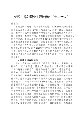 党课:深刻领会主题教育的十二字诀同志们:理论是统一思想、统一行动的先导。XXX新时代中国特色社会主义思想,是当代中国马克思主义、二十一世纪马克思主义,是中华文化和中国精神的时代精华,对我国发展具有方向性、引领性、根本性作用。用党的创新理论团结统一全党思想、意志和行动,是深入开展学习贯彻XXX新时代中国特色社会主义思想主题教育的根本目的。这就要求我们必须牢牢把握此次主题教育的学字诀,认识真理、学习真理、掌握真理、信仰真理、捍卫真理,以XXX新时代中国特色社会主义思想武装全党、教育人民,在纷繁的变中找到不变的内核,在复杂的多样中找到把方向的少数根本。下面,我强调几点意见。一、牢牢把握以学铸魂此次主题教育的总要求是学思想、强党性、重实践、建新功,把学思想、强党性摆在首位,具体目标中强调凝心铸魂筑牢根本锤炼品格强化忠诚,通过学思想、讲政治以学铸魂。马克思主义真理始终是中国共产党前进的灵魂指引,新时代的新思想始终是中华民族的信仰基石和精神动力,是锤炼党性和进一步指导实践的思想舵盘。凝心铸魂筑牢根本。二十世纪80年代末90年代初,东欧剧变、苏联解体让国际共产主义事业遭到重创,历史终结论中国崩溃论社会主义失败论等负面宣传一度甚嚣尘上。在中国共产党的领导下,我们始终坚持马克思主义理论的指导,坚持中国特色社会主义道路,经受住了国际国内的考验,科学社会主义重焕生机,尤其进入新时代以来,两大奇迹的事实雄辩地否定了唱衰中国的言论。中国共产党在百年波澜壮阔的奋进征程中,靠的就是统一意志凝心聚气,靠的就是统一思想凝心聚魂。而只有通过在实践中系统准确把握,在主题教育中常学常新,才能让党的创新理论飞入寻常百姓家,在广泛的社会层面激起层层波浪,筑牢执政之基。锤炼品格强化忠诚。忠诚是每一个共产党员的必备党性修养,是每一个共产党员鲜明的政治品格。苏共在拥有二十万党员时建立了苏维埃政权,在拥有两百万党员时取得了卫国战争的胜利,但在拥有两千万党员时却亡党亡国。惨痛的历史教训告诉我们,锤炼党性和强化忠诚在一个政党持久发展中的重要性。通过主题教育学习,我们要紧紧围绕强党性这一要求,切实锤炼党性、增强党性、永葆忠诚,做到以身许党、以身许国。我国人口规模大,庞大的人口基数需要强有力的社会主心骨,深刻理解两个确立,切实做到两个维护,在全党全国范围内形成政令畅通、令行禁止的氛围,确保党的团结统一,这是中国特色社会主义制度的优越性体现,也是中国之治的重要保障。每一名共产党员都必须有真心爱党、时刻忧党、坚定护党、全力兴党的政治觉悟和政治信念,共赴中国梦。二、牢牢把握以学增智以学增智,就是要从党的科学理论中悟规律、明方向、学方法、增智慧。XXX新时代中国特色社会主义思想理论体系代表着新时代新征程的主流意识形态,代表着中华民族发展的主旋律主节奏,如何深入理解这一系统科学的理论体系需要我们下大气力下大功夫去把握。浅尝辄止永远只能浮于表面,要在主题教育中牢牢把握以学增智,做到学得深、稳、透、实,避免知其然不知其所以然,学深悟透其精髓要义,深刻把握贯穿这一思想始终的科学世界观和方法论,洞悉其内在的立场观点方法,坚定六个必须坚持,唯有抓稳这把金钥匙,我们分析问题才能站得高、看得远、想得深、把得准。坚持人民至上。我将无我,不负人民是XXXXXX的庄严承诺,是将小我完全融入大我的豪迈与赤诚。在面对复杂严峻的国际国内局势时,人民是我们党面临惊涛骇浪的最大底气,是在不确定性中能找到的最大确定性。坚持自信自立。当今世界,要说哪个政党、哪个国家、哪个民族能够自信的话,那中国共产党、中华人民共和国、中华民族是最有理由自信的。党的百年奋斗征程是在坚持独立自主、自信自立的基础上创造出来的,事实胜于雄辩,两大奇迹有力证明了坚定四个自信的必然性,有力证明了走向现代化的道路不是唯一固定的,在立足本国国情的基础上找寻本国发展特色才是自信自立的重要体现。坚持守正创新。守正才能立方向、把根本,创新才能引领时代、把握未来,要在继承中发展,在发展中创新。坚持问题导向。问题是时代的声音,敢于破题、善于解题是共产党人的优良传统,要坚持底线思维,勇于斗争、敢于胜利。坚持系统观念。善于运用联系的、发展的、辩证的思维看待问题、把握规律,高瞻远瞩、统揽全局,稳步推动事业全局发展。坚持胸怀天下。马克思自幼受到宗教中救赎观念的熏陶,在中学毕业之际就发出了为人类幸福而工作的呼声,可以说,马克思毕生都在追求人类解放。美美与共、天下大同是中国人由来已久的追求,中国共产党在引领中国人民追求中华民族伟大复兴的征途中与世界人民共享机遇,彰显大国风范。以学增智,学得系统、学得深刻是此次主题教育的内在要求,启迪智慧、增长智慧是此次主题教育的内在指向。
