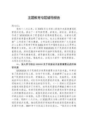 主题教育专题辅导报告同志们:党的十八大以来,以XXX同志为核心的党中央高度重视民营经济发展,提出了一系列新思想、新观点、新论述、新要求,形成了XXXXXX关于民营经济发展的重要论述,为新时代民营经济高质量发展指明了前进方向,也为工商联做好两个健康工作提供了根本遵循。全市各级工商联组织和广大民营经济人士要以开展学习贯彻XXX新时代中国特色社会主义思想主题教育为契机,深入学习领悟XXXXXX关于民营经济发展的重要论述,深刻把握其中的科学内涵和实践要求,推动民营企业坚定不移走健康发展、高质量发展之路,为服务自贸港建设大局作出更大贡献。借此机会,由我为大家作一堂党课报告,与同志们共同交流。一、深入学习领会XXXXXX关于民营经济发展重要论述的科学内涵XXXXXX关于民营经济发展的重要论述内容丰富,科学回答了民营经济怎么看、如何干等问题,系统阐释了社会主义制度下民营经济的性质、逻辑起点、发展方向、发展理念、发展途径和内在要求,对引导和促进民营经济发展、做好民营经济领域相关工作具有根本性的指导作用。(一)深刻认识坚持和加强党对民营经济工作领导,始终是民营经济朝着正确方向发展的根本保证。党领导民营经济发展的历史是党的百年探索奋斗史的重要组成部分。我国民营经济的发展,是在党的领导下开辟出来的一条道路,也是中国特色社会主义筚路蓝缕开出的一条路。党的十八大以来,以XXX同志为核心的党中央高度重视民营经济发展,推动民营经济领域的理论政策实现新的重大发展和完善。2015年中央统战工作会议提出,促进非公有制经济健康发展和非公有制经济人士健康成长是重大经济问题,也是重大政治问题。在2018年民营企业座谈会上指出,非公有制经济,是改革开放以来在党的方针政策指引下发展起来的。党的XX大报告强调要进一步加强非公有制企业党建工作。这充分表明民营经济工作就处在党坚持和加强集中统一领导的重要位置和重点环节,坚持党的领导是民营经济发展壮大的根本前提,是民营经济始终朝着正确方向发展的根本保证。(二)深刻认识坚持两个毫不动摇大政方针,始终是民营经济不断发展壮大的根本保障。改革开放以来,我国民营经济从小到大、从弱到强,不断发展壮大,已经成为中国特色市场经济制度的内在要素和推动发展不可或缺的力量。我市民营经济借改革开放东风和特区政策优势,特别是自贸港建设的重大战略机遇,市场主体数量不断攀升,发展活力不断增强,成为××经济社会发展和自贸港建设的生力军。这些发展成就得益于党对民营经济发展理论的持续探索和对民营经济发展实践的有力支持。党的十六大报告首次提出了两个毫不动摇方针;党的十九大把两个毫不动摇写入新时代坚持和发展中国特色社会主义的基本方略;党的XX大从构建高水平社会主义市场经济体制的高度,强调了坚持两个毫不动摇方针,并首次明确提出发展壮大民营经济。正是因为我们党始终坚持和完善社会主义基本经济制度,坚持两个毫不动摇,才形成了国有企业顶天立地、民营企业铺天盖地的发展态势,创造了中国经济发展的伟大奇迹。实践证明,只有坚定不移坚持两个毫不动摇方针,始终把民营经济当作我国经济制度的内在要素,把民营企业和民营企业家当作我们自己人,才能实现我国经济高质量发展,才能推动自贸港建设行稳致远。(三)深刻认识认真践行新发展理念,始终是实现民营经济高质量发展的必由之路。党的XX大报告明确提出,高质量发展是全面建设社会主义现代化国家的首要任务;市第八次党代会报告也鲜明指出,贯彻新发展理念、推动高质量发展是××自由贸易港建设的根本出路。认真践行新发展理念,也必然是我市民营经济实现高质量发展的必由之路。当前,民营经济发展成本上升较快、基础要素保障不足、风险防范意识不强、融资难融资贵、供给侧结构性矛盾突出等问题较为突显。XXXXXX提出创新、协调、绿色、开放、共享的新发展理念,为解决这些矛盾问题开出了良方,确立了民营经济高质量发展的方法论。民营企业要自觉践行新发展理念,提高自主创新能力,在各自产业优势领域精耕细作、锻长造优、补齐短板,推动互联网、大数据、人工智能和自身发展深度融合,提升核心竞争力。(四)深刻认识两个健康重要论述,始终是非公有制经济领域统战工作的重要指导思想。党的十八大以来,XXXXXX对民营经济健康发展和民营经济人士健康成长提出了一系列新论断,提出非公有制经济要健康发展,前提是非公有制经济人士要健康成长要促进非公有经济健康发展和非公有制经济人士健康成长,深入开展理想信念教育和社会主义核心价值观教育,帮助他们践行新发展理念,弘扬企业家精神,做合格的中国特色社会主义事业建设者。这些重要论述为民营经济高质量发展和民营经济人士高素质成长指明了方向,提供了强大的理论支撑和现实指导。工商联作为党领导下的人民团体和商会组织,承担着促进两个健