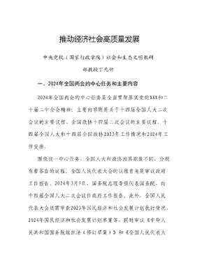 推动经济社会高质量发展中央党校(国家行政学院)社会和生态文明教研部教授丁元竹一、2024年全国两会的中心任务和主要内容2024年全国两会的中心任务是全面贯彻落实党的XXX和二十届二中全会精神;主要内容则是关于十四届全国人大二次会议的主要议程、全国政协十四届二次会议的主要议程、十四届全国人大和十四届全国政协2023年工作情况和2024年工作安排。围绕这一中心任务,全国人大和政协因其职能不同,分别有着各自的议程。全国人民代表大会的议程首先是审议政府工作报告。2024年3月5日,国务院总理李强代表国务院,向十四届全国人大二次会议作政府工作报告。此外,全国人民代表大会还需审查2023年国民经济和社会发展计划执行情况、2024年国民经济和社会发展计划草案等,同时审议《中华人民共和国国务院组织法(修订草案)》和《全国人民代表大会常务委员会工作报告》。2024年3月8日,全国人大常委会委员长赵乐际向十四届全国人大二次会议作《全国人民代表大会常务委员会工作报告》。赵乐际委员长的报告对2023年全国人大常委会的工作进行了全面总结,主要包括弘扬宪法精神、提高立法质量、完善社会主义法治体系、依法行使职权、做好监督工作以及加强人大代表工作能力建设等方面。同时,全国人大及其常委会还需服从国家的总体外交布局,推动相关外交活动,并不断加强常委会的自身建设。这些都是2023年全国人大常委会工作的重点。2024年3月10日上午,全国政协十四届二次会议通过了政协第十四届全国委员会第二次会议关于常务委员会工作报告的决议、政协第十四届全国委员会第二次会议关于政协十四届一次会议以来提案工作情况报告的决议、政协第十四届全国委员会提案委员会关于政协十四届二次会议提案审查情况的报告、政协第十四届全国委员会第二次会议政治决议。2024年是新中国成立75周年,也是人民政协成立75周年。文可居文库——海量学习资料,手机电脑均可下载www.wenkeju.com全国政协十四届二次会议胜利召开,标注新时代新征程上又一次新的出发。这次政协大会自3月 4日开幕以来,来自34个界别的2000多名政协委员深入协商议政、广泛凝聚共识, 寻求最大公约数、画出最大同心圆,凝聚起推进强国建设、民族复兴伟业的磅礴力量。王沪宁同志在中国人民政治协商会议全国委员会常务委员会工作报告中,对全国政协2023年的工作进行了全面总结。他指出,2023年是全面贯彻中共XXX精神的开局之年。以XXX同志为核心的中共中央团结带领全党全国各族人民,坚持稳中求进工作总基调,接续奋斗、砥砺前行,坚决克服内外困难, 全面深化改革开放,新冠疫情防控平稳转段,高质量发展扎实推进,科技创新实现新突破,安全发展基础巩固夯实,民生保障有力有效,经济社会发展主要目标任务圆满完成,社会大局保持稳定,全面建设社会主义现代化国家迈出坚实步伐,极大增强了全国各族人民信心和底气。全国政协十四届一次会议以来,共收到提案5621件,立文可居文库——海量学习资料,手机电脑均可下载www.wenkeju.com案4791件。截至2024 年2月底,99.9%的提案已经办复。提案内容涵盖了经济建设、政治建设、文化建设、社会建设、生态文明建设等各个领域,充分体现了政协委员们的履职热情和责任担当。二、2023年经济社会发展回顾2023年,我国坚持稳中求进工作总基调,完整、准确、全面贯彻新发展理念,加快构建新发展格局,着力推动高质量发展,全面深化改革开放,加大宏观调控力度,着力扩大内需、优化结构、提振信心、防范化解风险,国民经济回升向好,高质量发展扎实推进,现代化产业体系建设取得重要进展,科技创新实现新的突破,改革开放向纵深推进,安全发展基础巩固夯实,民生保障有力有效,社会大局和谐稳定,全面建设社会主义现代化国家迈出坚实步伐。第一,经济总体回升向好。国内生产总值超过126万亿元,增长5.2%,增速居世界主要经济体前列。城镇新增就业1244万人,城镇调查失业率平均为5.2%。居民消费价格上涨0.2%。文可居文库——海量学习资料,手机电脑均可下载www.wenkeju.com第二,现代化产业体系建设取得重要进展。传统产业加快转型升级,战略性新兴产业蓬勃发展,未来产业有序布局,先进制造业和现代服务业深度融合, 一批重大产业创新成果达到国际先进水平。国产大飞机C919投入商业运营,国产大型邮轮成功建造,新能源汽车产销量占全球比重超过60%。第三,数字经济加快发展,5G用户普及率超过50%。深入实施新型城镇化战略,进一步放宽放开城市落户条件,增强县城综合承载能力,常住人口城镇化率提高到66.2%。强化农业发展支持政策,有力开展抗灾夺丰收,实施新一轮千亿斤粮食产能提升行动,乡村振兴扎实推进。完善区域协调发展体制机制,在落实区域重大战略方面推