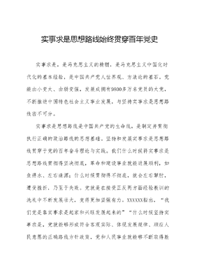 实事求是思想路线始终贯穿百年党史实事求是,是马克思主义的精髓,是马克思主义中国化时代化的基本经验,是中国共产党人世界观、方法论的基石。党能由小变大、由弱变强,发展成拥有9800多万名党员的大党,不断推进中国特色社会主义事业发展,与坚持实事求是思想路线密不可分。实事求是思想路线是中国共产党的生命线,是制定并贯彻执行正确的政治路线的思想基础。坚持和发展实事求是思想路线贯穿于党的百年奋斗理论与实践。我们什么时候将实事求是思想路线贯彻得坚决彻底,革命和建设事业就能进展顺利,如鱼得水、左右逢源;什么时候贯彻得不彻底,就会左右掣肘,遭受挫折,乃至于失败。党就是在接受正反两方面经验教训的洗礼中不断发展壮大,变得更加坚强有力。XXXXXX指出,我们党是靠实事求是起家和兴旺发展起来的什么时候坚持实事求是,党就能够形成符合客观实际、体现发展规律、顺应人民意愿的正确路线方针政策,党和人民事业就能够不断取得胜利;反之,离开了实事求是,党和人民事业就会受到损失甚至严重挫折。2021年11月,党的十九届六中全会通过的《中共中央关于党的百年奋斗重大成就和历史经验的决议》指出:党之所以能够领导人民在一次次求索、一次次挫折、一次次开拓中完成中国其他各种政治力量不可能完成的艰巨任务,根本在于坚持解放思想、实事求是、与时俱进、求真务实,坚持把马克思主义基本原理同中国具体实际相结合、同中华优秀传统文化相结合,坚持实践是检验真理的唯一标准,坚持一切从实际出发,及时回答时代之问、人民之问,不断推进马克思主义中国化时代化。一、实事求是思想路线是实践的产物思想路线亦称认识路线,指的是人们的认识所遵循的方向、途径、原则和方法。一个政党的思想路线,是指这个政党确定自己的指导思想并支配自己行动的认识路线。 1930年5月, 毛泽东同志在 《反对本本主义》 一文中首次提出 思文可居文库——海量学习资料,手机电脑均可下载www.wenkeju.com想路线这一科学概念,提出共产党人从斗争中创造新局面的思想路线中国革命斗争的胜利要靠中国同志了解中国情况,强调没有调查,没有发言权。1938年10月,毛泽东同志在党的六届六中全会上作题为《论新阶段》的 文可居文库——海量学习资料,手机电脑均可下载www.wenkeju.com政治报告。1941年5月,毛泽东同志在延安干部会议上作《改造我们的学习》的报告,把党的思想路线概括为实事求是。实事求是已有近2000年历史。实事求是一词最早见于东汉史学家班固撰写的《汉书·河间献王传》,其赞扬汉景帝刘启的儿子刘德修学好古,实事求是。刘德的实事求是是喜好先秦诸子的古书,考证古书时求真是 留其正本。唐代颜师古将实事求是注释为务得事实,每求真是也。桁林:实事求是思想路线始终贯穿百年党史(2)2024-05-10 09:11 宣讲家网 桁林 中国社会科学院马克思主义研究院研究员字号:1938年10月,毛泽东同志在党的六届六中全会报告的第七部分中国共产党在民族战争中的地位中首次提到实事求是的概念,明确提出共产党员应是实事求是的模范,又是具有远见卓识的模范。因为只有实事求是,才能完成确定的任务;只有远见卓识,才能不失前进的方向。1940年1月,毛泽东同志在《新民主主义论》中指出:科学的态度是实事求是,自以为是和好为人师那样狂妄的态度是决不能解决问题的。1941年5月,毛泽东同志在延安干部会议上作《改造我们的学习》的报告时,第一次解答了什么是实事求是。实事就是客观存在着的一切事物;是就是客观事物的内部联系,即规律性;求就是我们去研究。实事文可居文库——海量学习资料,手机电脑均可下载www.wenkeju.com求是的内涵从传统的治学方法变成党的思想路线的核心内容。1945年,党的七大正式将实事求是确立为全党的思想路线。毛泽东同志在这次会议的口头报告中指出:我们历史上的马克思主义有很多种,有香的马克思主义,有臭的马克思主义,有活的马克思主义,有死的马克思主义,把这些马克思主义堆在一起就多得很。我们所要的是香的马克思主义,不是臭的马克思主义;是活的马克思主义,不是死的马克思主义。毛泽东同志强调,要有目的地去研究马克思列宁主义的理论,要使马克思列宁主义的理论和中国革命的实际运动结合起来,是为着解决中国革命的理论问题和策略问题而去从它找立场,找观点,找方法的。这种态度,就是有的放矢的态度。这种态度,就是实事求是的态度。实事求是的态度使马克思主义在中国扎下根来。邓小平同志指出,毛泽东思想的基本点就是实事求是,毛泽东思想的精髓文可居文库——海量学习资料,手机电脑均可下载www.wenkeju.com就是这四个字