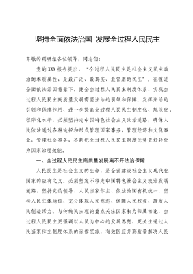 坚持全面依法治国 发展全过程人民民主尊敬的调研组各位领导,同志们:党的XXX报告提出,全过程人民民主是社会主义民主政治的本质属性,是最广泛、最真实、最管用的民主。在推进全面依法治国背景下,健全全过程人民民主制度体系、实现全过程人民民主高质量发展需要法治的引领和保障。发挥法治的引领和保障作用,进一步提高全过程人民民主制度化、规范化、程序化水平,必须坚持走中国特色社会主义法治道路,确保人民依法通过各种途径和形式管理国家事务,管理经济和文化事业,管理社会事务,不断把全过程人民民主制度优势更好转化为国家治理效能。一、全过程人民民主高质量发展离不开法治保障人民民主是社会主义的生命,是全面建设社会主义现代化国家的应有之义。必须坚定不移走中国特色社会主义政治发展道路,坚持党的领导、人民当家作主、依法治国有机统一,坚持人民主体地位,充分体现人民意志、保障人民权益、激发人民创造活力。与传统民主理论重点关注国家权力归属相比,全过程人民民主更强调以人民为中心的发展思想,更关注通过人民当家作主制度体系的运作实施,有效回应并高质量解决人民群众关心的现实利益问题,让改革发展成果更多更公平惠及全体人民,尊重和维护人民群众的合法权利,使人民群众的获得感、幸福感、安全感更加充实、更有保障、更可持续。实现全过程人民民主高质量发展,高效解决人民群众关心的现实问题,必须全面推进国家各方面工作法治化,用法治回应人民新要求新期待,用法治保障人民权益得到充分实现。法治是现代国家治理的基本方式,是国家治理体系和治理能力的重要依托,全面依法治国是顺应历史潮流和人民意愿作出的必然选择。实现全过程人民民主高质量发展,必须坚持全面依法治国,坚持以人民为中心,始终将人民作为推进全过程人民民主的主体和力量源泉。全面依法治国最广泛、最深厚的基础是人民,这既是我国社会主义民主政治建设的经验总结,也是新时代实现全过程人民民主高质量发展的基本原则。一方面,始终将人民作为推进全过程人民民主的主体和力量源泉,体现尊重历史发展规律和尊重人民主体地位的一致性。在我国,人民群众是国家和社会的主人,是发展全过程人民民主的主体,是现代化建设的深厚力量源泉和智慧源泉。另一方面,始终将人民作为发展全过程人民民主的主体和力量源泉,有利于推动人民当家作主。中国共产党在治国理政实践中,始终把人民拥护不拥护人民赞成不赞成人民满意不满意人民文可居文库——海量学习资料,手机电脑均可下载www. wenkeju .com 高兴不高兴人民答应不答应作为制定各项方针政策的出发点和落脚点,在推进全过程人民民主高质量发展进程中也是如此。因此,实现全过程人民民主高质量发展必须坚持人民主体地位,坚持以依法保障人民权益为根本目的,把体现人民利益、反映人民愿望、维护人民权益、增进人民福祉落实到全面依法治国各领域全过程,激发蕴藏在人民群众中的创造伟力,这也是社会主义法治国家建设的根基和力量源泉。二、法治保障全过程人民民主制度化规范化程序化人类社会发展的事实证明,法治是制度之治最基本、最稳定、最可靠的保障。实现全过程人民民主高质量发展,健全全过程人民民主制度体系,进一步提高全过程人民民主制度化、规范化、程序化水平,离不开法治强有力的保障。首先,坚持党的领导,既是发展全过程人民民主的最大体制优势,也是全过程人民民主事业健康发展的根本保证。《中华人民共和国宪法》第一条明确规定:中国共产党领导是中国特色社会主义最本质的特征。这以国家根本大法的形式确立了党的领导的最高法律地位,证明了党的领导地位的形成是历史和人民的选择,党的领导是我国宪法确定的基本法律事实。在全过程人民民主实践中,必须确保党中央权威和集中统一领导,保证党的理论、路线、方针政策和决策部署在各项具体工文可居文库——海量学习资料,手机电脑均可下载www. wenkeju .com 作中得到全面贯彻和有效执行,支持和保证国家机关依照宪法法律积极主动、独立负责、协调一致开展工作,确保全过程人民民主发展的正确方向。其次,全过程人民民主理念的具体落实和贯彻执行,必须依靠法治。我国宪法和法律确立的人民代表大会制度、中国共产党领导的多党合作和政治协商制度、民族区域自治制度、基层群众自治制度,是践行全过程人民民主的主要制度载体。真正把人民当家作主落到实处,夯实全过程人民民主的制度根基,必须把法治建设摆在更加突出的位置,把践行全过程人民民主的各项具体工作纳入法治化轨道,坚持在法治轨道上实行民主选举、民主协商、民主决策、民主管理、民主监督,保障人民群众的知情权、参与权、表达权、监督权得到充分实现,使人民民主生动、具体地体现在国家政治生活和社会生活的全过程、各环节,切实保障人民群众共享全过程人民民主发展成果。最后,实现和保障人民权益,充分调动人民群众投身全过程人民民主实践
