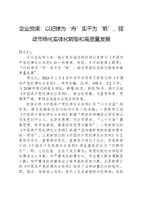企业党课:以纪律为舟实干为帆,驱动市场化实体化转型和高质量发展同志们:今天在此和大家一起分享交流近段时间以来学习《中国共产党纪律处分条例》的一些感悟、收获。今天的党课主题是:以纪律为舟实干为帆,驱动市场化实体化转型和高质量发展。同志们,2024年1月1日中共中央发布了新修订的《中国共产党纪律处分条例》,共有3编、11章、158条、2.2万字,与2018年修订的版本相比,新增16条、修改76条。修订后的《中国共产党纪律处分条例》,政治性更强、内容更科学、逻辑更严谨,更符合当前社会经济的发展。新修订的《中国共产党纪律处分条例》有六个方面的变化,通过前期的总结归纳与大家一起共勉:一是新修订的《中国共产党纪律处分条例》新增党的纪律建设必须坚持以马克思列宁主义、毛泽东思想、邓小平理论、三个代表重要思想、科学发展观、重要领导思想为指导。二是新修订的《中国共产党纪律处分条例》新增坚决维护党的权威和集中统一领导。三是新修订的《中国共产党纪律处分条例》对主要领导责任、重要领导责任、直接责任进行了区分。四是新修订的《中国共产党纪律处分条例》将监督执纪分为四种形态,即,让红红脸、出出汗成为常态;使党纪轻处分和组织处理成为大多数;对严重违纪的重处分、作出重大职务调整是少数;对严重违纪涉嫌违法立案审查的是极少数。五是新修订的《中国共产党纪律处分条例》规定了五种加重处分的情形,即,强迫、唆使他人违纪;拒不上交或者退赔违纪所得;违纪受处分后又因故意违纪应当受到党纪处分;违纪受到党纪处分后,又被发现其受处分前的违纪行为应当受到党纪处分;党内法规规定的其他从重或者加重处分情形。六是新修订的《中国共产党纪律处分条例》进一步明确了违反政治纪律部分、违反组织纪律部分、违反廉洁纪律部分、违反群众纪律部分、违反工作纪律部分等内容。通过学习《中国共产党纪律处分条例》结合市场化实体化转型和高质量发展实际,我有三点感悟。一、在懂纪中,坚定信仰。党纪是一把戒尺,用好用实戒尺的前提是学好党章党规,学懂弄通。作为一名党员,在党纪学习教育中要逐章逐条学纪,原本本学习、逐字逐句研读,才能养成遵规守纪的自觉。要落实好带着问题学、结合实际学、全面系统学在学懂弄通上下真功夫、花大气力。始终保持求知若渴的学习态度,沉心静气、细嚼慢咽、熟记于心,真正学出实效,悟出新得,在自省自警中做思想上的明白人。在懂纪中,补足党纪党规党章的精神之钙,让自己充充电,强化坚守初心,牢记使命的行动自觉;市场化实体化转型和高质量发展工作中,戴好党纪紧箍咒时刻保持清醒的头脑、坚定的理想、高尚的品行,不断提高自身的个人素养和业务能力,用自身党纪学习教育成效不断检验工作成效。二、在守纪中,严格规矩。守纪是党员的根本和要求,要始终把学纪、知纪、明纪、守纪当终身课题,学深学透,熟知于胸、铭记于心、镶嵌于行。聚焦以学促做切实做到学在实处、想在实处、干在实处。把纪律、规纪挺在前面,发现问题及时纠正,触犯纪律立即处置,全面构筑防止小错酿成大错、违纪行为恶化为违法犯罪体系。作为党员要以身作则,自己严守规矩,当好遵守党纪的领头羊,严格要求自己做到四个一样(即,台上台下一个样、人前人后一个样、八小时内外一个样、有没有监督一个样)。党员干部既是文可居文库——海量学习资料,手机电脑均可下载www.wenkeju.com党纪维护者、执行者也是党纪的监督者。党员干部要始终把党纪内化于心、外化于行,用党纪指导工作、指导实践。三、在用纪中,自我约束。知底线而不越红线、知规矩而不坏规矩。学会在工作中用纪严格按照规矩办事、按党纪管人,方能促进工作提质增效。俗话说,管人者先自管强调的是自我约束,由此可以看出用纪必须要有坚定的自我约束定力。作为一名党员要做到在党纪面前不越雷池,要知行知止、令行禁止,以廉者不求非其有,智者不为非其事为底线和要求,不搞团团伙伙、不立小山头、不拉小圈子、遵循组织程序、遵守组织纪律、遵照组织原则,在用纪中,增强自我约束的自觉性,明确行为的界限和底线。学习《中国共产党纪律处分条例》的关键在于思考的深度,关键要看学了之后结合综合保障服务工作思考了什么,对今后工作开展的实际指导作用和意义。同志们,我们不能有打好一仗就一劳永逸的想法,不能有差不多了、该松口气、歇歇脚的想法和思想。要在遵守党纪党规上做好表率、带好头,以身作则,千万不要以为腐败很远,一旦放松了警惕,就可能走上腐败的道路;要始终保持全面从严治党永远在路上,永不停歇的干劲,持续营造风清气正、干事创业、艰苦奋斗的良好氛围。对此我有三点收获和大家一起分享、交流。一是思想方面。党员干部要始终牢记初心使命,不断淬炼党性修养和道德涵养,工作