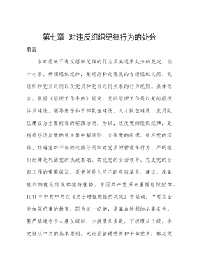 第七章对违反组织纪律行为的处分前言本章是关于违反组织纪律的行为及其适用处分的规定,共十七条。所谓组织纪律,是规范和处理党的各级组织之间、党组织和党员之间以及党员和党员之间关系的行为规则。具体而言,根据《组织工作条例》规定,党的组织工作是以党的组织体系建设、领导班子和干部队伍建设、人才队伍建设、党员队伍建设为主要内容的实践活动。所以,违反党的组织纪律,是指那些违反党的民主集中制原则、分裂党的组织、破坏党的团结、妨碍党对干部的选拔任用和对党员的管理等行为。严明组织纪律是巩固党的执政基础、实现党的全面领导、完成党的全部工作的重要保证,是党领导人民不断夺取革命、建设、改革胜利的优良传统和独特优势。中国共产党历来重视组织纪律。1941年中共中央在《关于增强党性的决定》中强调:要在全党加强纪律的教育,因为统一纪律,是革命胜利的必要条件。要严格遵守个人服从组织,少数服从多数,下级服从上级,全党服从中央的基本原则。无论是普通党员和干部党员,都必须如此。此后任弼时在中共中央党校作的关于增强党性的报告又强调:这决定的中心思想是强调党的统一性、集中性和全党服从中央领导的重要性,强调政治上、思想上、组织上都应服从党的中央。所以,遵守党的组织纪律是党员党性的体现,涉及党员的政治、组织和思想等诸多方面。第七十七条 违反民主集中制原则,有下列行为之一的,给予警告或者严重警告处分;情节严重的,给予撤销党内职务或者留党察看处分:(一)拒不执行或者擅自改变党组织作出的重大决定;(二)违反议事规则,个人或者少数人决定重大问题;(三)故意规避集体决策,决定重大事项、重要干部任免、重要项目安排和大额资金使用;(四)借集体决策名义集体违规。【条文主旨】本条是关于违反民主集中制行为的列举和处分。【条文解读】党章总纲部分规定:民主集中制是民主基础上的集中和文可居文库——海量学习资料,手机电脑均可下载www.wenkeju.com集中指导下的民主相结合。它既是党的根本组织原则,也是群众路线在党的生活中的运用。必须充分发扬党内民主,尊重党员主体地位,保障党员民主权利,发挥各级党组织和广大党员的积极性创造性。必须实行正确的集中,牢固树立政治意识、大局意识、核心意识、看齐意识,坚定维护以A同志为核心的党中央权威和集中统一领导,保证全党的团结统一和行动一致,保证党的决定得到迅速有效的贯彻执行……努力造成又有集中又有民主,又有纪律又有自由,又有统一意志又有个人心情舒畅生动活泼的政治局面。同时,党章第十条又规定了党的民主集中制的六项基本原则,与本条有关的主要是:(一)党员个人服从党的组织,少数服从多数,下级组织服从上级组织,全党各个组织和全体党员服从党的全国代表大会和中央委员会。(五)党的各级委员会实行集体领导和个人分工负责相结合的制度、凡属重大问题都要按照集体领导、民主集中、个别酝酿、会议决定的原则,由党的委员会集体讨论,作出决定;委员会成员要根据集体的决定和分工,切实履行自己的职责。(六)党禁止任何形式的个人崇拜。要保证党的领导文可居文库——海量学习资料,手机电脑均可下载www.wenkeju.com人的活动处于党和人民的监督之下,同时维护一切代表党和人民利益的领导人的威信。违反党的民主集中制原则,既包括违反民主原则的行为,也包括违反集中原则的行为。前者主要表现为党员领导干部不尊重党员主体地位,侵犯党员权利,以个人意志代替集体决策,搞一言堂等;后者主要包括党员和党组织没有牢固树立四个意识,不服从上级党组织或党中央的决定,搞分散主义,自行其是,无视党的领导人的权威等。本条第(一)项拒不执行或者擅自改变党组织作出的重大决定是典型的分散主义自由主义。在党的历史上,因为各行其是导致党的重大损失的经验教训有很多。《关于党内政治生活的若干准则》规定:每个共产党员特别是各级党委的成员,都必须坚决执行党委的决定。如果有不同意见,可以保留,或者向上一级党委提出声明,但在上级或本级党委改变决定以前,除了执行决定会立即引起严重后果的非常紧急的情况之外,必须无条件地执行原来的决定。《关于新形势下党内政治生活的若干准则》规定:全党必须自觉防止和反对文可居文库——海量学习资料,手机电脑均可下载www.wenkeju.com个人主义、分散主义、自由主义、本位主义。对党中央决策部署,任何党组织和任何党员都不准合意的执行、不合意的不执行,不准先斩后奏,更不准口是心非、阳奉阴违。属于部门和地方职权范围内的工作部署,要以贯彻党中央决策部署为前提,发挥积极性、主动性、创造性,但决不允许自行其是、各自为政,决不允许有令不行、有禁不止,决不允许搞上有政策、下有对策。第(二)项违反议事规则,个人或者少数人决定重大问题和第(三)项规避