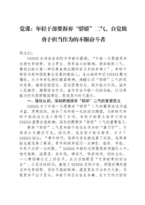 党课:年轻干部要摒弃骄娇二气,自觉做勇于担当作为的不懈奋斗者同志们:XXXXXX在河南省安阳市考察时强调,年轻一代要继承和发扬吃苦耐劳、自力更生、艰苦奋斗的精神,摒弃骄娇二气,像我们的父辈一样把青春热血镌刻在历史的丰碑上。年轻干部作为党和国家事业发展的接班人,务必始终牢记XXXXXX殷切嘱托,大力传承弘扬红旗渠精神,清醒认识骄娇二气的现实危害,锤炼坚强党性、坚定理想信念、提升能力作风、涵养人民情怀、激励担当作为,奋力作出年轻一代的贡献,以过硬能力作风勇担强国建设、民族复兴时代重任。一、强化认识,深刻把握摒弃骄娇二气的重要意义XXXXXX关于年轻一代要摒弃骄娇二气的重要论述内涵丰富、思想深刻,饱含了对年轻一代的深切期望,为新时代年轻干部的成长成才指明了方向。年轻干部要全面学习领会XXXXXX重要论述精神,深刻把握摒弃骄娇二气的重要意义。摒弃骄娇二气是年轻干部成长进步的磨刀石。干部成长无捷径可走,经风雨、见世面才能壮筋骨、长才干XXXXXX指出:青年时代,选择吃苦也就选择了收获,选择奉献也就选择了高尚。青年时期多经历一点摔打、挫折、考验,有利于走好一生的路。XXXXXX年轻时在陕西梁家河插队七年,他吃粗粮、战跳蚤、亲村民,建沼气、修淤地坝、创铁业社,一心带领群众过上好日子,成为百姓眼里吃苦耐劳的好后生。正是这段经历,磨炼了XXXXXX坚韧不拔、顽