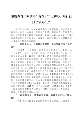 主题教育分享式党课:牢记初心,笃行社区当家人担当共产党人的初心和使命就是要为人民谋幸福,为中华民族谋复兴。作为一名基层社区的共产党员,同时作为社区带头人,把社区打造成居民离不开的组织,是我们的初心和使命。下面,我结合自已社区工作中的一些经历,就社区带头人如何践行初心浅谈自已的认识和看法:一、社区带头人,就需要心系居民,做社区居民的大管家社区就是一个大家庭,社区负责人就是这个大家庭中的大管家,居民心中自有一杆称,来评价社区工作成效,只要为居民办实事、解难题、做好事。把工作真正做到居民心坎上,就能得到居民的认同和支持。还记得当年在走访社区一独居老人家里时,看到老人吃的是前几天的剩菜剩饭,听到老人经常会做完饭了但忘记关煤气,心里就想到要争取条件办社区自已的食堂,解决社区老人,特别是独居孤寡老人的吃饭问题。为了办好社区食堂,我带领班子走访了杭城10余家社区食堂,学习借用他们好的做法,并通过努力,争取到社会赞助9万元,2014年4月社区爱心食堂启用,当看着,老人就餐时会心的笑时,就会觉得起初开办社区食堂的种种不易都是那么值的。为了补齐社区服务短板,2016年,我们将一废弃的水泵房改建成社区邻里之家,2017年,先行试点打造社区健康小屋,并荣获全国医养结合智慧养老示范点。2020,以老旧小区改造契机,拓展社区服务空间4300余方。二、社区带头人,需要攻坚克难、做社工队伍的排头兵社工队伍的团结是做好社区各项工作的保证,特别是在一些艰巨任务面前,需要每一位社工劲往一处使、心往一处想,这当中,需要社区带头人首当其冲,当好排头兵。当年我们社区一楼天井整治时,因当时相关文件对于历史违建没有统一的硬性规定和处置标准,执法难度大、时间久。就在召集社区班子讨论时做了一个在当时来说还比较大胆的决定,决定一次性啃下这块硬骨头,无论新旧违建,一并处理,封闭所有开门,拆除所有搭建,统一所有雨棚,并精心设计整治方案上报街道,经过近百天的努力,最终涉及的111处天井搭建全部拆除,69处破墙开门全部封闭,期间无一处强拆,无一处投诉。三、社区带头人,需要探索创新、做社区治理助推者社区工作不仅要服务居民,而且要依靠居民。我们社区近几年在居民自治方面进行了一些探索,并取得了一定成效。公约自治项目列入省城乡社区治理案例,相关工作还得到省市区主要领导批示肯定。作为街道试点社区,先行推出邻里坊标准化建设和网格实体化运作。2018年起,积极打造一核三坊社区治理体系建设。四、社区带头人,需要勤思善谋,做社区蓝图的设计师一个社区的发展,凝聚着一任又一任社区带头人的美好设想。作为江干区老旧小区改造试点社区,我们紧抓机遇,同时融入未来社区九大场景,强化数字赋能,全力构筑更具智慧、更具文化、更具活力、更具生态的红梅未来社区,当前,正积极主动申报第三批省级未来社区试点创建。百年正青春、奋进正当时,需要我们每一位社区负责人,用脚踏实地的工作干劲和学以致用的深学笃行,影响和带动社区一班人共建社区美好明天,用行动献礼建党百年华诞!
