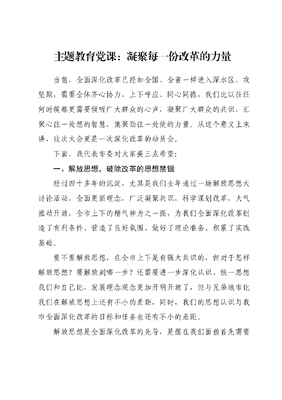 主题教育党课:凝聚每一份改革的力量当前,全面深化改革已经如全国、全省一样进入深水区、攻坚期,需要全体齐心协力、上下呼应、同心同德,我们比以往任何时候都更需要倾听广大群众的心声,凝聚广大群众的共识,汇聚心往一处想的智慧,集聚劲往一处使的力量。从这个意义上来讲,这次大会更是一次深化改革的动员会。下面,我代表市委对大家提三点希望:一、解放思想,破除改革的思想禁锢经过四十多年的沉淀,尤其是我们去年通过一场解放思想大讨论活动,全面更新理念,广泛凝聚共识,科学谋划改革,大气推动开放,全市上下的精气神为之一振,为我们全面深化改革创造了有利条件、营造了良好氛围、做好了理论准备、积累了实践基础。要不要解放思想,在全市上下是有强大共识的,但对于怎样解放思想?要解放到哪一步?还需要进一步深化认识、统一思想我们和自己比,发展理念观念更加开明开放了,但与兄弟地市比我们在解放思想上还有不小的差距,同时,我们的思想认识与我市全面深化改革的目标和任务也还有不小的差距。解放思想是全面深化改革的先导,是摆在我们面前首先需要解决的问题。我们必须从更深层面、更广领域解放思想,才能打破思维定势、突破视野狭隘,才能海纳百川、放眼百年。一场真正意义上的改革,必须依靠一场真正意义的思想革命。我们一定要深刻认识到:第一,解放思想不会是一劳永逸的事为什么我们说解放思想永无止境?思想解放不能局限于一时一事,也不可能靠一场大讨论活动完成。大家都知道,铁轨分宽轨和窄轨,美国的铁路铁轨的宽度是4.85英尺。为什么?因为美国的铁路是英国铁路设计师设计的,英国铁路就是这么宽。为什么英国铁路是这么宽?因为英国铁路是由设计有轨电车铁轨的人设计的,英国有轨电车的车轨就是4.85英尺。这个尺寸与马车的车轮距离一样宽,因为设计有轨电车的人原来是造马车的。为什么马车的车轮距离是4.85英尺?因为古罗马战车由两匹马拉动,而两匹马屁股的宽度就是4.85英尺所以沿袭下来,美国的铁路就是4.85英尺宽。这个故事反映的现象就是管理学上的一个定律叫路径依赖,我们老祖宗的话更加入木三分一些,叫江山易改、本性难移,就是说很多事情形成思维定势之后,比较难改。所以解放思想不可能是一劳永逸的事,不是通过一次大讨论就可以解决要突破思维定势就是一件触及灵魂的事情。工作中我们会发现,一场扎扎实实的大讨论活动结束了,但是有的干部依然总是强调,领导是这样要求的,以前就是这样做的,总是把从来没有干过的事和明令不能干的事混为一谈。我到下面进行调研时几乎每个单位都告诉我,力量短缺,人才引进难、资金困难,可是当我们制定出台新的办法,都很高的。XXX新时代中国特色社会主义思想告诉我们,成功首先是治理理念的成功,而治理理念的成功无不得益于突破思维定势。北京单位假如不是一改学而优则仕的两千年太学道统局限,倡导兼容并包、学术自由,是不可能从一个官僚养成所改造成为中国历史上第一所真正意义的现代单位的。柏林单位假如不是在办学理念上突破了单一人才培养的视野,将科学研究发展成为新的功能,也不可能在极短的时间内发展成为一所世界一流单位,执世界高等教育之牛耳。改革就是要开创前无古人的新格局只要有利于改革,有利于师生员工的切身利益,有利于我市发展大局,我们就要放开手脚干、坚定不移闯。所以,不要寄希望于一场大讨论就解放大家思想。第二,解放思想不能是坐而论道的事说起来头头是道,干起来无计可施,这不是解放思想,这是纸上谈兵式的坐而论道。我们这个社会现在最不缺的就是批评家,特别是随着微信、微博这些新媒体的出现,几乎每个人每天都在@别人,指点江山、说短道长的都有,给大家开辟了一个言论的空间。解决问题的好办法好点子,多传递一些正能量。正能量就体现在这个新办法、新举措、新建议上,问题讲多了,不讲办法,人会越听越没劲,越听越灰溜溜的,所以,改革不是坐而论道的事。人有多大胆、地有多大产,这不是解放思想,这是大跃进时期异想天开式的坐而论道。我们要力避思想上的头脑发热,有其自身的发展规律,要力戒冒进。比如:人才队伍建设的问题总量不足,我们可以在短时间内通过加大资金投入、加大改革力度来解决,但是往深一层次想,要形成团队,同时团队要真正形成合力和竞争力,则需要悉心的培育,要按照规律办事。党委、行政只能用心制定好政策,用心营造好氛围,下文件、喊口号是不灵的。上述两种坐而论道的解放思想,还说明一个问题,解放思想必须有为有守。第三,解放思想不光是领导干部的事今年正月初一凌晨两点,新年的钟声刚刚敲响,我就收到了一份十分珍贵的礼物。最近我做了一个统计,我的办公系统总共收到了690多封来信,其中有300多封来自工作一线的群众,我每一封都做了回复,因为每一封来信,都是一份信任和期待。老话说人心齐、泰山移,没有什么比1600余名群众同心同德、同行同向更可贵