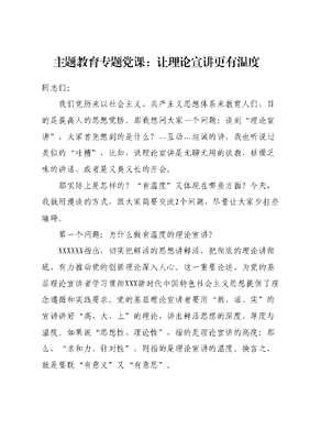 主题教育专题党课:让理论宣讲更有温度同志们:我们党历来以社会主义、共产主义思想体系来教育人们,目的是提高人的思想觉悟。那我想问大家一个问题:谈到理论宣讲,大家首先想到的是什么?…互动…坦诚的讲,我也听说过类似的吐槽,比如,说理论宣讲是无聊无用的说教,枯燥乏味的讲话,或者是又臭又长的开会。那实际上是怎样的?有温度又体现在哪些方面?今天,我就用漫谈的方式,跟大家简要交流2个问题,尽量让大家少打些瞌睡。第一个问题:为什么做有温度的理论宣讲?XXXXXX指出,切实把鲜活的思想讲鲜活,把彻底的理论讲彻底,有力推动党的创新理论深入人心。这一重要论述,为党的基层理论宣讲者学习贯彻XXX新时代中国特色社会主义思想提供了理念遵循和实践要求。党的基层理论宣讲者要用新、活、实的宣讲讲好高、大、上的理论,讲出鲜活思想的深度、厚度与温度。如果说思想性、理论性,指的是理论宣讲的高度;那么,亲和力、针对性,则指的是理论宣讲的温度。换言之,就是要既有意义又有意思。反观当前,毫不掩饰地说,我们的理论宣讲,温度还是不够还存在一些问题和不足。共性的问题,其实,刚才大家都断断续续提到了,概括起来主要是三个方面:一是不好听。党的基层理论宣讲的内容要把鲜活思想的道理学理哲理与基层工作的事理有效衔接,让基层党员、群众感受到鲜活思想的可亲与可近,避免让基层宣讲变为高不可攀的象牙塔。理论宣讲,原本是让大家听起来感觉暖洋洋的,但遗憾的是,我们有些单位的理论宣讲给人的感觉却是懒洋洋的,让人一听就想睡觉。比如,有的同志作报告,要么是没完没了地看新闻、读报纸、学文件;要么是长篇大论地讲官话套话空话,没亲和力、不接地气,很少有大家听得懂的话,还是以传统地说教、灌输为主。这样的理论宣讲,不仅起不到正激励,甚至还会有副作用。二是不好玩。做好鲜活思想的铸魂工程,提升党的基层理论宣讲的思想引领力。让基层党员、群众能够明确马克思主义立场观点方法,明晰其与XXX新时代中国特色社会主义思想的世界观和方法论的内在联系,做到对鲜活思想的真学、真懂、真信、真用。善于从群众身边的经济、政治、文化、社会、生态文明等现象和典型案例出发,阐述小故事背后的大道理,进一步以党的创新理论统一思想、统一意志、统一行动。现在,有些群众共对政府搞的活动热情不高,甚至还有些抵触情绪。比如,有些的宣讲活动,形式单一、内容单调,一提理论宣讲、党课,就是会议室开大会、报告厅作报告,一提能力提升,就是办学习班、培训班。又如,活动的宣传上,还是旧配方、老味道,开通了微信公众号、抖音号等新阵地,但发布的内容还是党八股假大空等旧内容,新瓶装旧酒、换汤不换药,没有新意自然也鲜有人问津。三是不好用。一方面,缺人文关怀。现在,我们的群众特别是很多青年务工人员,不仅经济压力大,房子孩子的压力也很大。但个别领导同志却很少去关心,平时除谈工作外,对大家的思想动态、生活状态等关注不够及时、不够细致。另一方面,没立足实际。有的单位开展宣讲工作,仅仅是为了宣讲而宣讲,宣讲活动与单位特色、干部特长、专业特点没有很好的结合起来只想解决思想问题,不思解决实际问题。讲好XXXXXX在地方工作的生动实践与新时代治国理政的逻辑关联,让基层党员、群众感受到鲜活思想与自己的邻距离。思想要引起共鸣,宣讲就要有温度。事实上,干部中不少思想问题,都是由于理论宣讲脱离实际,对干部们的需求考虑不周解决不力造成的,从而导致个别同志对理论宣讲产生了怀疑,甚至抵触。如何让理论宣讲变得接地气,既讲道理又办实事,做有温度的理论宣讲,是我们亟待解决的问题。因此,我的第二个问题来了。第二个问题:怎样做有温度的理论宣讲?简单,也不简单。说简单,是因为用一句话就可以概括,就是:把有意义的事情做得有意思。说不简单,是因为:一方面,要虚功实做。光说不练假把式,又说又练才是真把式。有温度不能只喊口号、不见行动。另一方面,还要久久为功。有温度不只是体现在一两件事情上,也不能只做一锤子买卖,而是要长期坚持、久久为功,在点点滴滴中让大家感受到。那如何让有意义的事情变得有意思?下面,简要分享三句话,概括讲就是三个结合:第一句话:远大理想与现实目标相结合先讲个故事:从前,有两个饥饿的人,分别得到了鱼竿和鱼然后各奔东西,得到鱼的人,把鱼吃光后饿死了;拿到竿的人,走到海边后没了力气,也饿死了。另外有两个饥饿的人,他们也得到了鱼竿和鱼。但没有各奔东西,而是一起跋涉找寻大海,最终如愿来到海边。从此,过上了幸福生活。一个人若只顾眼前利益、只顾自身利益,得到的幸福终将是短暂的;目标再高远,也要立足实际、面对现实,也要有团队支持、团结协作。实现人生理想,就是要把理想和现实有机结合起
