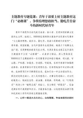 主题教育专题党课:青年干部要上好主题教育这门必修课,争做有理想敢担当,能吃苦肯奋斗的新时代好青年青年干部是伟大时代的见证者、奋斗者,是党和国家事业发展的生力军、接班人。XXXXXX在党的XX大报告中动员新时代青年立志做有理想、敢担当、能吃苦、肯奋斗的新时代好青年。青年强,则国家强。当代中国青年生逢其时,施展才干的舞台无比广阔,实现梦想的前景无比光明。尤其是要在当前正在开展的主题教育中上好必修课,认真学习领会、深入贯彻落实XXXXXX关于主题教育的一系列重要讲话和指示精神,明大德、守公德、严私德,知敬畏、存戒惧、守底线。在常学常新中加强理论修养,在真学真信中坚定理想信念,在学思践悟中牢记初心使命,在细照笃行中不断修炼自我,在知行合一中主动担当作为,保持对党的忠诚心、对人民的感恩心、对事业的进取心、对法纪的敬畏心,做到信念坚、政治强、本领高、作风硬,以行则将至的决心和做则必成的信心,全力铆足四股劲,在奋进新征程中展现青年担当、贡献青春力量,以高度的政治责任感和扎实的工作作风答好主题教育试卷。一、心怀一颗远大志向的心,自我鞭策,争做有理想的新时代好青年坚定理想信念是青年立身之本、立志之根。XXXXXX指出:青年理想远大、信念坚定,是一个国家、一个民族无坚不摧的前进动力。要树立对马克思主义的信仰、对中国特色社会主义的信念、对中华民族伟大复兴中国梦的信心,坚持真学、真懂、真信、真用,从根本上形成坚定马克思主义的政治自觉、思想自觉、行动自觉。要深刻认识XXX新时代中国特色社会主义思想是当代中国马克思主义、21世纪马克思主义,坚持学懂弄通XXX新时代中国特色社会主义思想,持续学、深入学、反复学,日耕不辍、久久为功,在学习中感悟真理伟力、坚定伟大信仰,自觉运用贯穿其中的立场观点方法观察时代、把握时代,分析问题、解决问题。(一)写好理论学习文,让信仰在笃学深信中更坚定。XXXXXX在中青年干部培训班上发表的系列重要讲话多次就年轻干部加强理论学习提出要求,强调年轻干部要刻苦钻研马克思主义基本原理特别是新时代党的创新理论成果,努力掌握蕴含其中的立场观点方法、道理学理哲理,做到知其言更知其义、知其然更知其所以然。首先,通过学习提升思想认识。年轻干部正处于人生的上坡路段,在单位是主力军,在家里是顶梁柱,能够用作理论学习的时间十分有限,只有真正转变思想认识,把理论学习作为一种工作和生活方式,才能做到理论学习的可持续发展,也才能实现从要我学到我要学再到我爱学的转变,彻底解决为什么要加强理论学习的问题,彻底解决工学矛盾的问题,真正提高学习效果。其次,通过学习提升能力本领。要练好内功提升能力,德才配位,不辜负党和人民的期望和重托。要提高群众工作能力,团结带领群众,做好群众工作,解决群众实际关心问题。提高解决问题能力,加强思想淬炼、政治历练、实践锻炼专业训练,在本职岗位上不断提高分析问题的深度、解决问题的精度。提高各项综合能力。年轻干部要提高调查研究能力、科学决策能力、改革攻坚能力、应急处突能力、抓落实能力。要想干事、能干事、干成事,不断强化各项综合能力。最后,通过学习解决实际问题。为学之实,固在践履。没有实践的学习,就像讲解航海知识不让上船,就像部署过河任务不让下水难以产生学以致用的良好氛围和成果转化。坚持以学增智,提升实践能力,就要发扬理论联系实际的优良学风,把学到的理论和本领应用到基层工作实践中,转化为指导实践、提升实践和推动实践的有力武器。作为年轻干部,我们要坚持以学增智,充分学以致用,在日常工作中提高履职尽责的能力,增强为民服务的本领,及时关注基层群众切身利益,不断增强群众满意度,提升群众获得感和幸福感。(二)写好实践检验文章,让服务在入心见行中更优化党组织要根据工作需要敢于把年轻党员干部放到艰苦环境中去,勇于让年轻干部深入一线,让他们在实践锻炼中改进作风、攻坚克难、磨练意志,提升应对紧急情况、处理复杂问题的能力。年轻党员干部要身心向下,树立扎根基层的决心和信心要多学多思提高实际工作能力,做到荣誉面前不争功,利益面前不计较,困难面前不躲闪,责任面前不推卸。要勇于在开展工作过程中,要紧密围绕基层治理,针对基层治理中发现的问题,提出整改方案拿出整改意见,从而达到整改目的。自觉拜人民为师,虚心向能者求教、向智者问策,善于从人民群众中汲取社会治理的智慧和力量。除此之外,示范党员干部应该发挥好带头引领作用,带动更多年轻年轻党员干部为人民群众干好事、干实事,帮助基层群众解决生活中、工作中对面临的烦心事,从而赢得人民群众的真心拥戴。(三)写好建功立业文章,让成效在担当尽责中更彰显青年干部正值风华正茂,是党的事业发展的中坚力量,务必要坚定斗争意志,鼓足冲锋陷阵勇气,做到冲得上、豁得出、顶得住要努力锤炼