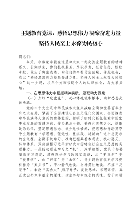 主题教育党课:感悟思想伟力 凝聚奋进力量坚持人民至上 永葆为民初心同志们:今天,非常荣幸能在这里和大家一起交流主题教育的精神要义,长期以来,你们扎根基层,尽职尽责,任劳任怨,默默奉献,做出了突出成绩,向你们的辛苦付出致敬。借此机会,我以感悟思想伟力凝聚奋进力量,坚持人民至上永葆为民初心这一主题,从三个方面谈谈个人的认识体会,与大家共勉。一、在思想伟力中把握精神实质,汲取动力源泉(一)立好定盘星,凝心铸魂筑牢根本,用新思想武装头脑。党的二十大立足中华民族伟大复兴战略全局和世界百年未有之大变局,擘画了全面建设社会主义现代化国家、全面推进中华民族伟大复兴的宏伟蓝图,指明了新时代新征程党和国家事业发展的前进方向。作为基层干部,要强化思想认识,提高政治站位,坚定理想信念、提升党性修养,把思想和行动贯穿于主题教育学思想、强党性、重实践、建新功这个总要求的全过程,全面系统学习、准确把握其基本观点、核心要义、科学体系,深刻感悟习近平新时代中国特色社会主义思想的真理伟力。一是扬起理论学习之帆,深学细悟。党员干部要端正学习态度,增强理论学习的自觉意识,从要我学变我要学,由好学变乐学,将主题教育规定学习资料作为案头书,平心静气地读,全神贯注地读,不搞花架子,拿出真功夫,沉下身子,发散思维,常思常悟,真正读出书本中蕴含的原味,读出字句中饱含的真味。村干部要把学习当做硬性指标,既要注重理论和实践相结合,又要做到学习和工作两不误。要结合本职工作,按照缺什么补什么的原则,严格落实学习制度,制定学习计划,经常性加油充电,不断夯实理论基础、丰富知识储备。二是坚定理想信念之锚,学深悟透。要强化理论武装,多向书本学,向同事学、群众学,在学中干、干中学;要多下村入户,做到多学、多问、多听;要多向乡镇干部、第一书记和致富带头人请教学习,多交流、多探讨工作经验,学深吃透党的各项政策,始终按政策办事、按原则办事,真正克服本领恐慌。同时要向革命先烈、先进典型学,比如张富清,60多年深藏功名,为贫困山区奉献一生,一辈子坚守初心使命,不改本色,积极弘扬奉献精神,汇聚了万众一心奋斗新时代的强大力量。把奖章深藏箱底,把对战友的怀念深藏心底,从不居功索取,只为坚守初心和使命,默默奉献,用自己的纯朴、淡泊,书写了精彩人生;张定宇,不顾自己身患渐冻症的身体,坚守在抗击疫情一线,用渐冻的身体托起信心与希望,被授予人民英雄国家荣誉称号。三是践行知行合一之桨,学思践悟。要合理安排好学习时间和内容,解决好学什么为什么学怎么学问题,做到知行合一、格物致知、融会贯通;要充分利用好主题党日、集中学习、专题党课,通过交流研讨、宣传阐释、送学上门等方式,认真读原著学原文悟原理,系统学习主题教育必读书目,真正钻进去、悟深透,全面系统理解把握习近平新时代中国特色社会主义思想的科学体系、核心要义、运用到实践中去,确保理论水平有新提升、党性修养有新增强,不断提高认识问题的高度、分析问题的深度、把握问题的准度,着力增强破解乡村发展难题的能力和本领。(二) 争做千里马,锤炼品格忠诚担当,深入推动工作落实。基层是党和人民的刀把子枪杆子,必须绝对忠诚、绝对纯洁、绝对可靠。基层党组织是整个党组织的神经末梢,是落实党的路线方针政策和各项工作任务的毛细血管,如果软弱涣散,必将极大损害党的执政根基,就无法完成党交给我们的任务。一要坚定革命理想高于天的忠诚信仰。国无信仰则不兴,人无信仰则不立。党员干部要扣好人生每一粒扣子,坚定忠诚信仰,牢记初心,增强政治定力,面对大是大非要保持清醒头脑、面对大风大浪要保持正确立场,矢志不渝跟党走,不偏不倚沿信仰之路前行。做到能在复杂环境中不迷失、在巨大压力下不退缩、在糖衣炮弹下不缴械,争做百折不挠、意气风发的党员干部。二要锤炼只留清气满乾坤的忠诚品格。党员干部要心怀敬畏,忠诚于党,时刻牢记共产党人为的是大公、守的是大义、求的是大我,要正心明道、怀德自重,永远把党和人民放在心中最高位置,廉洁自律、守正笃行,才是真正的人生之道。对党忠诚是对理想信念坚定的最好诠释,要有忠诚品格,才能行稳致远。三要践行俯首甘为孺子牛的忠诚理念。民生无小事,一枝一叶总关情。坚持全心全意为人民服务的根本宗旨,深刻展现了我们党坚持人民至上的政治底色,彰显了共产党人的责任担当,体现了我们党发展为了人民的最终目的。时代是出卷人,人民是阅卷人。基层干部要答好时代之问,就要忠诚于人民,常怀时时放心不下事事放心不下为民之心,始终同人民群众保持血肉联系,察真情、说实话,出真招、办实事,下苦功、求实效,始终保持赶考姿态,交出一份让人民满意的时代答卷。(三)找准指南针,践行宗旨为民造福,牢固树立为民立场。人民
