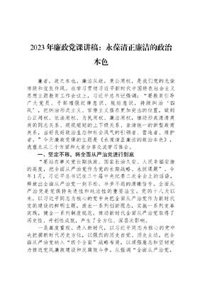 2023年廉政党课讲稿:永葆清正廉洁的政治本色廉者,政之本也。廉洁从政,秉公用权,是我们党的光荣传统和优良作风。在学习贯彻习近平新时代中国特色社会主义思想主题教育工作会议上,习近平总书记强调:要教育引导广大党员、干部增强纪律意识、规矩意识,持续纠治四风,把纠治形式主义、官僚主义摆在更加突出的位置,做到公正用权、依法用权、为民用权、廉洁用权,推动形成清清爽爽的同志关系、规规矩矩的上下级关系、亲清统一的新型政商关系,当好良好政治生态和社会风气的引领者、营造者、维护者。今天廉政党课的主题是《永葆清正廉洁的政治本色》,我重点从三个方面和大家分享交流学习体会。一、坚定不移,将全面从严治党进行到底要站在事关党长期执政、国家长治久安、人民幸福安康的高度,把全面从严治党作为党的长期战略、永恒课题。今年1月,习近平总书记在二十届中央纪委二次全会上的话语,释放出全面从严治党一刻不松、半步不退的清晰信号。全面从严治党是党保持先进性和纯洁性的重要法宝。党的十八大以来,以习近平同志为核心的党中央把全面从严治党作为新时代党的建设的鲜明主题,提出一系列创新理念,实施一系列变革实践,健全一系列制度规范,推动新时代全面从严治党取得了历史性、开创性成就,产生了全方位、深层次影响。一是高度重视。进入新时代,以习近平同志为核心的党中央把握新时代历史方位,以强烈的历史自觉、历史主动,把全面从严治党纳入四个全面战略布局,以顽强意志和坚韧定力推进党风廉政建设和反腐败斗争。从强调全面从严治党,是我们党在新形势下进行具有许多新的历史特点的伟大斗争的根本保证,到提出全面从严治党必须持之以恒、毫不动摇,再到明确全面从严治党是党永葆生机活力、走好新的赶考之路的必由之路……以习近平同志为核心的党中央以永远在路上的政治定力,敢于斗争、善于斗争,不断巩固拓展全面从严治党成果,开辟了百年大党自我革命新境界。二是常抓不懈。反腐败斗争形势从依然严峻,到依然严峻复杂,再到压倒性态势正在形成,及至取得压倒性胜利,党的十八大以来,在以习近平同志为核心的党中央坚强领导下,党风廉政建设和反腐败斗争笃定前行。只要存在腐败问题产生的土壤和条件,反腐败斗争就一刻不能停,必须永远吹冲锋号。习近平总书记在党的二十大报告中的铿锵话语,再一次释放出不断巩固发展反腐败斗争压倒性胜利的重要信号。接续开展的党内集中教育将学习贯彻习近平新时代中国特色社会主义思想贯穿始终;修订完善中央八项规定实施细则;一以贯之推进依规治党,形成比较完善的党内法规体系……时刻保持解决大党独有难题的清醒和坚定,习近平总书记引领全党以不变的决心、不变的力度,更高的要求、更高的标准,跑好全面从严治党这场接力赛。三是系统部署。健全全面从严治党体系,党的二十大报告中这一明确要求一经提出,就引发广泛关注。我们党作为长期执政的马克思主义政党和世界上第一大政党,党的远大目标和历史使命,党的队伍的庞大规模和广泛分布,党面临的重大风险和严峻挑战,都决定了必须整体地而不是局部地、系统地而不是零碎地、持久地而不是短暂地、高标准地而不是一般化地全面从严治党。构建全面从严治党体系,是一项具有全局性、开创性的工作。在二十届中央纪委二次全会上,习近平总书记进一步阐释,全面从严治党体系应是一个内涵丰富、功能完备、科学规范、运行高效的动态系统,并明确提出要坚持内容上全涵盖、对象上全覆盖、责任上全链条、制度上全贯通,为成体系推进全面从严治党向纵深发展指明前进方向。二、持之以恒,把党风廉政建设推向深入习近平新时代中国特色社会主义思想,贯穿着中国共产党人的作风操守要求。今年以来,习近平总书记先后在广东、陕西、内蒙古、江苏等地考察调研。在新征程开局起步的关键时刻,习近平总书记以生动而深刻的调研为全党作出表率,引导广大党员做足基本功,养成好作风。2012年12月4日,党的十八大闭幕不到一个月,习近平总书记主持中共中央政治局会议,审议通过中共中央政治局关于改进工作作风、密切联系群众的八项规定。也正是在这次会议上,习近平总书记带头作出承诺、发起号召,对新一届中共中央政治局委员提出要求:党风廉政建设,要从领导干部做起,领导干部首先要从中央领导做起。正所谓己不正,焉能正人。2017年10月27日,党的十九大闭幕刚3天,习近平总书记主持召开十九届中共中央政治局会议,审议通过《中共中央政治局贯彻落实中央八项规定的实施细则》,巩固和拓展落实八项规定精神成果,对相关内容进一步作出细化完善,提出更高要求。2022年10月25日,党的二十大闭幕仅3天,习近平总书记主持召开中共中央政治局会议,研究部署学习宣传贯彻党的二十大精神。会议的一项重要议程,即是审议《中共中央政治局贯彻落实中央八项规定实施细则》。从十八届中共中央政治局一开始就为作风建