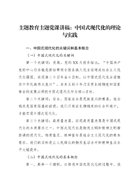 主题教育主题党课讲稿:中国式现代化的理论与实践一、中国式现代化的关键词和基本概念(一)中国式现代化的关键词第一个关键词:发展。党的XX大报告指出,中国共产党的中心任务就是团结带领全国各族人民全面建成社会主义现代化强国、实现第二个百年奋斗目标,以中国式现代化全面推进中华民族伟大复兴。未来五到十年乃至更长时期党和国家事业的发展必须把中国式现代化作为核心目标。第二个关键词:安全。国家安全是民族复兴的根基,社会稳定是国家强盛的前提。我们只有在长期稳定的社会环境中,才能实现中国式现代化。第三个关键词:高质量发展。实现高质量发展是中国式现代化的本质要求之一。中国式现代化是物质文明和精神文明相协调的现代化。物质富足、精神富有是社会主义现代化的根本要求。我们的目标是让人民群众的物质生活水平和精神生活水平大幅提升。(二)中国式现代化的基本概念第一,高举一个旗帜。在推进中国式现代化的过程中,我们要高举中国特色社会主义伟大旗帜,为全面建设社会主义现代化国家而团结奋斗。第二,两个结合和两个维护。其一,两个结合。要深刻理解中国式现代化的本质,就必须将马克思主义基本原理同中国具体实际相结合、同中华优秀传统文化相结合。其二,两个维护。在推进中国式现代化的进程中,我们必须坚决维护XXX同志党中央的核心、全党的核心地位,坚决维护党中央权威和集中统一领导。第三,三个务必、三个基础、三大任务。其一,三个务必。在推进中国式现代化的进程中,我们务必不忘初心、牢记使命,务必谦虚谨慎、艰苦奋斗,务必敢于斗争、善于斗争。其二,三个基础。中国式现代化深深植根于中华优秀传统文化,体现科学社会主义的先进本质,借鉴吸收一切人类优秀文明成果。其三,三大任务。中国式现代化要完成发展、安全、高质量发展三大任务。第四,四个全面、四个自信、四个意识、四个伟大。其一,四个全面。全面建设社会主义现代化国家、全面深化改革、全面依法治国、全面从严治党是中国式现代化的具体目标。其二,四个自信。道路自信、理论自信、制度自信、文化自信是推进中国式现代化的根本保障。其三,四个意识。只有增强政治意识、大局意识、核心意识、看齐意识,才能更好地推进中国式现代化。其四,四个伟大。要想实现伟大梦想,必须进行伟大斗争、建设伟大工程、推进伟大事业。第五,五位一体、五大发展理念、五大特色五大原则、五个必由之路。其一,五位一体。推进中国式现代化要从经济建设、政治建设、文化建设、社会建设、生态文明建设五方面综合考虑。其二,五大发展理念。推进中国式现代化必须坚持创新、协调、绿色、开放、共享五大发展理念。党的十八大以来,我们一直通过五大发展理念促进中国经济社会结构转型升级。其三,五大特色。党的XX大报告指出,中国式现代化有五大特色,即中国式现代化是人口规模巨大的现代化、全体人民共同富裕的现代化、物质文明和精神文明相协调的现代化、人与自然和谐共生的现代化、走和平发展道路的现代化。其四,五大原则。在推进中国式现代化的进程中,我们要坚持和加强党的全面领导、坚持中国特色社会主义道路、坚持以人民为中心的发展思想、坚持深化改革开放、坚持发扬斗争精神。其五,五个必由之路。在推进中国式现代化的进程中,全党必须牢记五个必由之路,即坚持党的全面领导是坚持和发展中国特色社会主义的必由之路,中国特色社会主义是实现中华民族伟大复兴的必由之路,团结奋斗是中国人民创造历史伟业的必由之路,贯彻新发展理念是新时代我国发展壮大的必由之路,全面从严治党是党永葆生机活力、走好新的赶考之路的必由之路。二、中国式现代化的本质要求党的XX大报告指出,中国式现代化的本质要求包括九条。第一,坚持中国共产党领导。中国共产党的初心使命是为中国人民谋幸福、为中华民族谋复兴。党和国家的一切发展事业都将以人民为中心的发展思想摆在首位。坚持中国共产党领导对推进中国式现代化起着基础和核心作用。第二,坚持中国特色社会主义。党的XX大报告指出,中国式现代化,是中国共产党领导的社会主义现代化。社会主义这个词非常关键,表明我们要在社会主义的意识形态、基本价值、社会主义制度之下推进中国式现代化。另外,推进中国式现代化的一个基本目标,就是要解决人民日益增长的美好生活需要和不平衡不充分的发展之间的矛盾问题。第三,实现高质量发展。当前,中国社会经济正处在转型升级的关键期。实现物质生活和精神生活共同富裕是推动我国经济社会高质量发展、实现社会主义现代化的必然要求。从产业发展角度看,我们必须加快产业的数字化、信息化发展进程。从社会管理角度看,我们要用新技术来武装自己高质量发展是系统性、整体性的发展。所以,我们不能把高质量发展仅理解为经济高质量,因为高质量发展还包括人们生活水平的