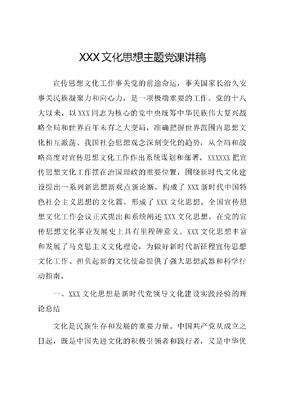 XXX文化思想主题党课讲稿宣传思想文化工作事关党的前途命运,事关国家长治久安事关民族凝聚力和向心力,是一项极端重要的工作。党的十八大以来,以XXX同志为核心的党中央统筹中华民族伟大复兴战略全局和世界百年未有之大变局,准确把握世界范围内思想文化相互激荡、我国社会思想观念深刻变化的趋势,从全局和战略高度对宣传思想文化工作作出系统谋划和部署。XXXXXX把宣传思想文化工作摆在治国理政的重要位置,围绕新时代文化建设提出一系列新思想新观点新论断,构成了XXX新时代中国特色社会主义思想的文化篇,形成了XXX文化思想。全国宣传思想文化工作会议正式提出和系统阐述XXX文化思想,在党的宣传思想文化事业发展史上具有里程碑意义。XXX文化思想丰富和发展了马克思主义文化理论,为做好新时代新征程宣传思想文化工作、担负起新的文化使命提供了强大思想武器和科学行动指南。一、XXX文化思想是新时代党领导文化建设实践经验的理论总结文化是民族生存和发展的重要力量。中国共产党从成立之日起,既是中国先进文化的积极引领者和践行者,又是中华优秀传统文化的忠实传承者和弘扬者。党的百余年奋斗凝结着我国文化奋进的历史。在领导革命、建设、改革的伟大历程中,我们党始终高度重视运用文化引领前进方向、凝聚奋斗力量,团结带领全国各族人民不断以思想文化新觉醒、理论创造新成果、文化建设新成就推动党和人民事业向前发展。早在新民主主义革命时期,我们党就深刻认识到文化是不可少的,任何社会没有文化就建设不起来,鲜明提出要建立民族的科学的大众的新文化。在社会主义革命和建设时期,我们党提出百花齐放、百家争鸣是促进社会主义文化繁荣的方针。在改革开放和社会主义现代化建设新时期,我们党坚持一手抓物质文明、一手抓精神文明,推动社会主义文化繁荣发展,振奋了民族精神,凝聚了民族力量。文化工作在各个历史时期都为推进中华民族伟大复兴发挥了不可替代的重要作用。党的十八大以来,面对新形势新任务新挑战,以XXX同志为核心的党中央在领导党和人民推进治国理政的实践中,把文化建设摆在全局工作的重要位置,举旗定向、谋篇布局,正本清源、守正创新,围绕在新的历史起点上继续推动文化繁荣、建设文化强国、建设中华民族现代文明这一新的文化使命,对宣传思想文化工作作出一系列重大决策部署,推动新时代宣传思想文化事业取得历史性成就,意识形态领域形势发生全局性、根本性转变。新时代党的创新理论深入人心,社会主义核心价值观广泛传播,中华优秀传统文化创造性转化、创新性发展不断推进,文化事业和文化产业日益繁荣,网络生态持续向好,全党全国各族人民文化自信明显增强、精神面貌更加奋发昂扬,焕发出更为强烈的历史自觉和主动精神,正在信心百倍书写着新时代中国发展的伟大历史,为实现中华民族伟大复兴注入了更为主动的精神力量。XXX文化思想正是在继承发展党成立以来领导文化建设探索成果和宝贵经验的基础上,在新时代文化建设的伟大实践中形成并不断丰富发展的,是新时代党领导文化建设实践经验的理论总结。二、XXX文化思想是两个结合的重大成果在五千多年中华文明深厚基础上开辟和发展中国特色社会主义,把马克思主义基本原理同中国具体实际、同中华优秀传统文化相结合是必由之路。这是我们在探索中国特色社会主义道路中得出的规律性认识,是我们取得成功的最大法宝。第二个结合是又一次的思想解放,让我们能够在更广阔的文化空间中,充分运用中华优秀传统文化的宝贵资源,探索面向未来的理论和制度创新。XXX文化思想坚守马克思主义这个魂脉和中华优秀传统文化这个根脉,有效把马克思主义思想精髓同中华优秀传统文化精华贯通起来,谱写了马克思主义文化理论发展新篇章,是两个结合的重大成果。马克思主义文化理论以人的实践为出发点,强调人在劳动中改造了自然、创造了自己,形成了人类文明。坚持文化来源于人的生产和生活实践,又对人的实践具有反作用;坚持文化本质上是社会意识的体现,人是文化发生发展的原因和动力;坚持只有进步的、先进的文化才会对社会和历史发展产生推动作用,从而被继承和发展;坚持客观世界是随着实践的发展不断变化的,文化也必然随着实践和时代的发展不断发展;等等。XXX文化思想的一系列新思想新观点新论断,丰富和发展了马克思主义文化理论。马克思主义和中华优秀传统文化来源不同,但彼此存在高度的契合性。XXX文化思想坚持把马克思主义基本原理同中华优秀传统文化相结合,既自觉用中华优秀传统文化充实马克思主义的文化生命,推动马克思主义显示出日益鲜明的中国风格与中国气派,推动中国化马克思主义成为中华文化和中国精神的时代精华;又自觉用马克思主义的真理之光,激活中华优秀传统文化中富有生命力的优秀因子并赋予其新的时代内涵,使历史中国的深厚底蕴与现实中国的崭新气象相融通,让马克思主义成为中国的,中华优秀传统文化成为现代的,引领中华文化发展迈