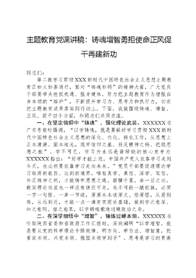 主题教育党课讲稿:铸魂增智勇担使命正风促干再建新功同志们:第二批学习贯彻XXX新时代中国特色社会主义思想主题教育正如火如荼进行,面对铸魂补钙的精神大餐,广大党员干部要带头抢抓机遇、强身健体,努力把主题教育作为增强自身本领的熔炉,不断提升学习力、思考力和执行力,切实把主题教育成果落实到行动上。下面,我就围绕铸魂、增智、正风、促干四个方面,和同志们共同交流。一、在坚定信仰中铸魂,强化理论武装。XXXXXX在广东考察时强调,以学铸魂,就是要做好学习贯彻XXX新时代中国特色社会主义思想的深化、内化、转化工作,从思想上正本清源、固本培元,筑牢信仰之基、补足精神之钙、把稳思想之舵。学不可已,学习力永远是最稀缺的核心竞争力XXXXXX指出:好学才能上进。中国共产党人依靠学习走到今天,也必然要依靠学习走向未来。党员干部要促进理论学习取得新收获、达到新境界,唯有真学、真信、深学、笃信,补足精神之钙,才能铸牢思想之魂。骐骥千里,非一日之功。做实理论功底也一样没有捷径可走,也不可能一蹴而就,必须一字一句悟、一章一节读,原原本本读原文、悟原理,从易到难,从远到近,才能一点一滴夯实理论基础,做到学之愈深、知之愈明、信之愈真,以学铸魂锻造过硬政治之身。二、在深学细悟中增智,锤炼过硬本领。XXXXXX在听取陕西省委和省政府工作汇报时,深刻阐明以学增智,就是要从党的科学理论中悟规律、明方向、学方法、增智慧,把看家本领、兴党本领、强国本领学到手。思考是学习的更高境界,是表象感觉深刻化、感性认识理性化的演绎过程,是知识转化为智慧的有效途径,若学习力是对主题教育内容的消化,那思考领悟便是吸收。面对党的创新理论的时代精髓,需要如切如磋,如琢如磨,反复研究推敲,认真思考,汲取营养,才能对内在的真谛有更准确的把握、更深刻的理解和更全面的体会。只有学以聚之,问以辩之。结合实际对学到的知识主动消化吸收、判断分析、决定取舍,借助勤奋学习和深入思考,不断培养战略思维、创新工作思路、总结经验教训、增长知识才干,才能涵养见微知著的领悟力和洞若观火的判断力,提高分析问题和解决问题的本领。要提高政治能力,把党支部建设成为宣传党的主张、贯彻党的决定、领导基层治理、团结动员群众、推动改革发展的坚强战斗堡垒;要提高思维能力,通过深学细悟,自觉把新时代中国特色社会主义思想的世界观、方法论和贯穿其中的立场观点方法转化为自己的科学思想方法,提高为党分忧、为民谋福的能力和水平;要提高实践能力。要学习掌握新时代中国特色社会主义思想蕴含的领导方法、思想方法和工作方法,紧紧围绕村奋斗目标,持续增强推动乡村振兴、服务群众、防范化解风险的本领,在谋事中锻炼、在干事中磨炼、在成事中锤炼,全面提升基层党组织创造力、凝聚力、战斗力。三、在知行合一中促干,勇于担当作为。主题教育的学习成果最终要靠干事创业的实效来体现,只有把主题教育运用到具体实践中,聚焦到为民办实事上,才能真正让主题教育转化成担当干事创业、推动工作落实的强大动力。XXXXXX提出时代是出卷人,我们是答卷人,人民是阅卷人的精辟论述广大党员干部要将全心全意为人民服务奉为圭臬,运用好四下基层制度,发扬马上就办,真抓实干的工作作风,勇于攻坚克难,敢于担当作为,在顽强拼搏、躬身笃行中不断提高实践能力,解决好群众的忧心事、烦心事、糟心事,逐渐成长为扛得起、顶得住的好干部。具体到我们而言,就是要求我们时时刻刻将群众放在心上,把服务落实在行动上,要大兴调查研究之风,经常在不同的巷子里转转,去群众家里坐坐,问问大家有什么想法、有什么诉求,积极宣讲政策、及时化解矛盾纠纷;要持续对照群众反映的突出问题,积极与各职能部门沟通,引进更多有利于民生的优质项目;要加大对一老一少群体关心关爱力度,努力做到民呼我为接诉即办;要持续强化安全隐患排查和公共应急常识宣传,让群众更安全、生活更安心,用看得见、摸得着的好事实事践行初心、凝聚民心。四、在检视整改中正风,树立良好形象。XXXXXX在内蒙古考察时,对开展主题教育提出明确要求,对以学正风作出深刻阐释,强调要养成俭朴之风,把生活作风问题作为检视整改的重要内容,督促清正廉洁不停歇,作风永远在路上。检视是指对事物进行详细的观察和分析,以发现其中的问题。检视的目的是帮助我们提出改进和优化的建议。XXXXXX指出,要坚持边学习、边对照、边检视、边整改,把问题整改贯穿主题教育始终,让人民群众切实感受到解决问题的实际成效。廉者,政之本也,民之惠也。XXXXXX强调,人民群众看主题教育是否有成效,最直观的感受是看党风方面存在的问题是否得到解决、党员干部作风是否有明显进步。广大党员干部要巧借主题教育学习的东风,从思想上固本培元、正本清源,有针对性补齐廉洁弱项、作风