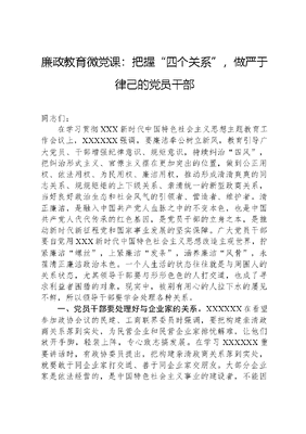 廉政教育微党课:把握四个关系,做严于律己的党员干部同志们:在学习贯彻XXX新时代中国特色社会主义思想主题教育工作会议上,XXXXXX强调,要廉洁奉公树立新风,教育引导广大党员、干部增强纪律意识、规矩意识,持续纠治四风,把纠治形式主义、官僚主义摆在更加突出的位置,做到公正用权、依法用权、为民用权、廉洁用权,推动形成清清爽爽的同志关系、规规矩矩的上下级关系、亲清统一的新型政商关系,当好良好政治生态和社会风气的引领者、营造者、维护者。清正廉洁,是融入中国共产党人血脉之中的不变本色,也是中国共产党人代代传承的红色基因,是党员干部的立身之本,是推动新时代新征程党和国家事业发展的坚实保障。广大党员干部要自觉用XXX新时代中国特色社会主义思想改造主观世界,拧紧廉洁螺丝,上紧廉洁发条,涵养廉洁风骨,永葆清正廉洁政治本色。一个人生活的状态往往就是与周围人的关系状态,尤其领导干部要与形形色色的人打交道,也成了寻求利益者围猎的对象,现实中,被别有用心的人拉下水的屡见不鲜,所以领导干部要学会处理各种关系。一、党员干部要处理好与企业家的关系。XXXXXX在看望参加政协会议的民建、工商联界委员时强调,要把构建亲清政商关系落到实处,为民营企业和民营企业家排忧解难,让他们放开手脚,轻装上阵,专心致志搞发展。在学习XXXXXX重要讲话时,有政协委员提出,把构建亲清政商关系落到实处,就要敢于同企业家打交道、善于同企业家交朋友。大部分企业家是依法经营的,是中国特色社会主义事业的建设者,不能因为个别不法商人违法,就否定了企业家的群体。领导干部要主动做好政务服务工作,着力营造重商、亲商、兴商发展氛围,这是好事,更是分内之事。领导干部不要怕和企业家打交道,只要个人不拿企业家的好处,按规矩办事,该接触要接触,该帮的忙要帮。一些领导干部在与企业家交往过程中出了问题,并不是因为和企业家有交往,而是以权谋私,我为你办事,你助我发财。殊不知,一个人能用金钱收买你,就一定会为了利益出卖你。在与企业人员交往过程中,要坚持原则,守住底线,绝不能搞权力寻租,否则到头来只能是人财两空、身败名裂,所以领导干部与企业打交道,要建立亲清统一的新型政商关系,做到亲而有度,清而有为。二、党员干部要处理好与家人亲情的关系。家庭是社会的基本细胞,是人生的第一个课堂,中国人一贯重视家庭在个人成长过程中的作用,涵养良好的家风,树立家风正、家教严的亲情关系,对于个人的成长和家庭的传承至关重要。XXXXXX指出:国家富强,民族复兴,最终要体现在千千万万个家庭都幸福美满上,体现在亿万人民生活不断改善上。千家万户都好,国家才能好,民族才能好不论时代发生多大变化,不论生活格局发生多大变化,我们都要重视家庭建设,注重家庭、注重家教、注重家风。XXXXXX多次强调家庭在增进社会和谐中的重要作用。随着党风廉政建设和反腐败斗争深入推进,重视家庭建设,筑牢反腐败的家庭防线,同样意义重大而深远。关爱家人,希望亲人生活得更好,这是人之常情,无可厚非。但当官要守官德,党员要讲党性,办事要有原则。不论时代发生多大变化,不论生活格局发生多大变化,我们都要重视家庭建设,筑牢家庭防线。有些领导干部因亲情放弃党性原则,官当到哪里,亲属生意就做到哪里;有的甚至利用家族成员当二传手,导致一人当官全家贪腐。综览落马官员受贿历程,家人的身影时常闪现其中。在间接收受贿赂的腐败分子中,妻子出现频率最高,足以说明家庭是反腐败工作中不可忽视的重要环节。妻贤夫祸少,子孝父宽心。家庭应当成为领导干部清正廉洁的助推器。领导干部要搞清楚什么是真正的爱、用怎样的方式去爱、爱的底线在哪里。在大是大非面前,真正的亲情一定是讲原则的,是支持家人按正确的选择办事,做到持恒守节、头脑清醒,而不是以帮助得到多少个人利益作为亲情的标准。否则就可能导致后院起火,结果只能是毁了家庭、害了自己。三、党员干部要处理好与职位的关系。XXXXXX在内蒙古考察时强调,要弘扬清廉之风,教育各级领导干部牢固树立正确权力观,全面查找廉洁风险点,筑牢思想防线,坚守法纪红线。为政清廉才能取信于民,秉公用权才能赢得人心。党章规定,中国共产党党员永远是劳动人民的普通一员。除了法律和政策规定范围内的个人利益和工作职权以外,所有共产党员都不得谋求任何私利和特权。党员领导干部必须正确行使人民赋予的权力,坚持原则,依法办事,清正廉洁,永葆共产党人清正廉洁的政治本色。干部想进步未必都是坏事,关键是进步的目的是什么,是为党多做事,还是个人图名利。一些干部为得到一官半职违反政治纪律和政治规矩,搞团团伙伙、溜须拍马甚至拉票买官。当他们当了领导后又用同样办法搞亲亲疏疏、排斥异己,甚至结党营私、卖官敛财。最终就是如《红楼梦》中所言,因嫌纱帽小,致使锁枷扛,彻底断送了自己的前