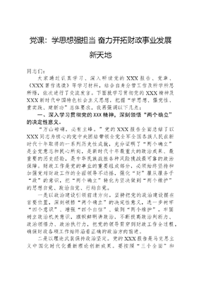 党课:学思想强担当 奋力开拓财政事业发展新天地同志们:大家通过认真学习、深入研读党的XXX报告、党章、《XXX著作选读》等学习材料,结合自身分管工作及所学所思所悟,依次进行了交流发言。下面就学习贯彻党的XXX精神及XXX新时代中国特色社会主义思想,把握学思想、强党性、重实践、建新功总体要求,我再强调以下几点:一、深入学习贯彻党的XXX精神,深刻领悟两个确立的决定性意义。万山磅礴,必有主峰。党的XXX报告全面总结了以XXX同志为核心的党中央团结带领全党全军全国各族人民在新时代十年取得的一系列历史性成就,充分证明了两个确立是全党意志和民心所向,是新时代十年最重大的政治成果、最重要的历史经验,是中华民族战胜各种风险挑战最可靠的政治保障。财政工作是党的事业的重要组成部分,必须始终坚持和加强党对财政工作的全面领导不动摇,强化财服从服务于政的意识,把两个确立转化为坚决做到两个维护的思想自觉、政治自觉、行动自觉。一是以政治建设引领前进方向。坚持把党的政治建设摆在首要位置,深刻领悟两个确立的决定性意义,进一步树牢四个意识、增强四个自信、做到两个维护。牢固树立政治机关意识,旗帜鲜明讲政治,不断提高政治判断力、政治领悟力、政治执行力,把党的领导贯穿到财政工作全过程,确保财政各项工作始终沿着正确的政治方向前进。二是以理论武装保持政治坚定。党的XXX报告是马克思主义中国化时代化最新理论创新成果。要按照三个全面和五个牢牢把握的重要要求,深学细悟党的XXX精神,深入学习、准确把握XXX新时代中国特色社会主义思想的世界观和方法论,坚持用XXX新时代中国特色社会主义思想凝心铸魂,全面系统学、原原本本学、联系实际学,在学懂弄通做实上下功夫,坚持好、运用好贯穿其中的立场观点方法,用以观察、指导和推进财政工作。三是以实际行动诠释政治忠诚。要心系两个大局、胸怀国之大者,自觉对标对表,把党的XXX精神及XXX中国特色社会主义思想转化为攻坚克难、干事创业的强大动力,落实落细到党的建设、现代财政治理、财税体制改革、财政政策制定、预算收支安排等各项具体工作,一步一个脚印把党的XXX作出的战略部署付诸于行动,见之于成效。二、深入践行XXX新时代中国特色社会主义思想,坚定不移推进财政改革发展。财政是国家治理的基础和重要支柱,在推动经济发展中起着至关重要的作用。做好新时代财政工作,必须坚持以推动高质量发展为主题,完整、准确、全面贯彻新发展理念,充分发挥财政职能作用,助力全区经济高质量发展迈上新台阶。一是主动服务,精准施策。充分发挥财政精准调控优势,打好政策组合拳,当好经济高质量发展的调节器稳定器助推器,着力打通构建新发展格局中的关键堵点,推动经济实现质的有效提升和量的合理增长。优化财政政策制度设计,自觉站在政治上审视和谋划财政工作,从全局上想问题、筹资金、出政策,在服务大局、建立现代经济体系、推进乡村振兴、实施科教兴国战略等方面接续发力,在拼经济、促发展、推动重大项目建设、高质量建设白龟湖科创新城等方面体现担当,不断塑造发展新动能新优势。二是开源节流,强化保障。党的XXX报告指出,没有坚实的物质技术基础,就不可能全面建成社会主义现代化强国。财政作为国家治理的基础和重要支柱,要坚持以发展实体经济为着力点,深化财政体制改革,加力推进财源建设,持续激发市场主体活力,提振发展信心,促进经济增效与财政增收良性循环。同时,大力倡导勤俭节约精神,推动建立政府过紧日子长效机制,把过紧日子的财政方针落到实处。持续盘活存量资金资产资源,为各项战略决策部署落地提供充足的财力支撑。三是防范风险,兜牢底线。党的XXX报告强调推进国家安全体系和能力现代化,提出要以新安全格局保障新发展格局。财政部门在统筹发展与安全中承担重要职责,要进一步增强忧患意识,坚持极限思维、底线思维,一以贯之抓好政府债务风险防控、基层三保、政府拖欠企业账款、社保基金监管等工作,牢牢守住不发生区域性系统性风险的底线,确保财政稳健运行,以财政安全为全局稳定作贡献。三、深刻领悟江山就是人民,人民就是江山的内涵意蕴,坚定不移增进民生福祉。悠悠万事,民生为大。党的XXX报告强调,中国共产党领导人民打江山、守江山,守的是人民的心。我们要深刻领悟江山就是人民,人民就是江山这一朴素真理,扎实做好新时代财政民生服务保障工作,加快推进共同富裕。一是坚守民生财政本色。公共财政取之于民、用之于民,要把人民对美好生活的向往作为奋斗目标,要以群众满意不满意作为工作成效的根本评判标准,克服减收增支影响,优先足额保障民生领域支出,用心用情用力解决好群众急难愁盼问题,不断把民生愿景转变成幸福实景。二是坚持公平普惠导向。充分发挥财税再分配功能,在做大