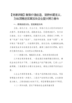 【党课讲稿】聚焦价值创造,坚持长期主义,为纵深推进改革加快企业复兴努力奋斗一、把准历史方位,坚定前进方向当前,时代之变、行业之变、市场之变正以前所未有的方式展开,惊涛骇浪之间,是随波逐流,还是破浪前行,攸关命运前途。在这一关键时刻,把握历史主动,要做好三件事:外看风浪内视肌体,才能审时度势、扫清迷雾;科学制定路线图,才能纲举目张、谋定后动;长期稳舵奋楫,才能避免故步自封或是急功冒进。遵循三者的内在逻辑,我们将无惧风吹浪打,走向更加光明的未来。(一)把握大势,增强深化改革、加快发展的紧迫感从外部宏观形势来看。一是我国迈向高质量发展阶段,建筑业地位将逐步下降。二是建筑业产能严重过剩,已进入去产能周期。三是我国社会需求发生转变,建筑业供需矛盾日益凸显。从企业内部形势来看。一是生产组织模式较为粗放,项目管理能力有待进一步提升。二是资产结构存在问题,去化降债压力极大。三是创效能力尚有不足,项目管理效益提升不明显。(二)回归本源,坚定不移推动企业高质量发展——聚焦高质量发展,就要勇于直面市场竞争挑战,从源头上构建更加强大的营销能力。——聚焦高质量发展,就要持续化解供给与需求的矛盾,从基础上不断提升全过程履约能力。——聚焦高质量发展,就要着力破解创效不足问题,从根本上提升全方位创效能力。——聚焦高质量发展,就要聚力调整优化资产结构,从体系上增强全系统御险能力。推动高质量发展,营销能力是前提,履约能力是基础,创效能力是关键,御险能力是保障,四种能力环环相扣、缺一不可。(三)坚持长期主义,久久为功推动改革持续深化十年两步走发展愿景——通过五年的努力,让二局实现健康发展,通过十年的努力,让二局回归中国中铁系统第一梯队。这本质上就是坚持长期主义,把阶段的里程纳入复兴的蓝图,将复兴的愿景拆解为更能触摸的发展目标,让大家在长期艰苦奋斗中找到方向感,从而引领企业沿着科学的路径前进,化劣势为优势,积优势为胜势,积小胜为大胜。坚持长期主义,是一家企业从大到伟大的根本道路。坚持长期主义,才能为企业带来真正的价值。文可居文库——海量学习资料,手机电脑均可下载www.wenkeju.com坚持长期主义,就是做时间的朋友。一是坚持长远定位。二是坚持价值贯穿。三是坚持聚焦当下。二、当前及今后一段时期的重点工作总体要求是:以XXX新时代中国特色社会主义思想为指导,全面贯彻党的XXX、中央经济工作会议及中国中铁第五次党代会、2024年工作会精神,围绕十年两步走愿景和三强三优目标,保持战略定力,坚持长期主义,在以调动人的积极性为核心的干部人才管理、激励约束机制改革和以提升企业效益、改善发展质量为核心的要素建设上持续发力,加快企业改革复兴步伐。重点要抓好10个方面的工作:(一)坚持建树育人、人才强企,筑牢人才优势以坚持控制用工总量为手段,实现人才效能持续提升。树立真正决定企业发展的不是员工数量而是员工质量的人才理念,坚持战略性总量控制思路,切实做好队伍结构调整和员工素质提升。以构建人才管理新机制为抓手,实现人才结构持续优化。完善覆盖全员的考核评价体系和市场化退出体系,加强以合同管理为依据的劳动关系管理,大力压减不胜任员工,持续加大冗余人员清理力度,提高员工市场化退出比例。有效控制人才流失,抓实人才队伍建设制度执行和要素管理,全面优化人才文可居文库——海量学习资料,手机电脑均可下载www.wenkeju.com队伍结构。以适应企业改革发展为目的,实现人才素质持续提升。持续提升人才引进质量,坚持678人才引进目标。探索柔性引才工作机制,拓宽人才储备途径。持续深化人才培养机制,抓实见习和锻炼期培养,强化专家队伍建设,强化技能人才队伍建设,优化任职资格管理体系。继续强推两级本部员工考核调整和任职资格管理,不断提升两级本部人员综合素质和能力水平。(二)坚持党管干部、奋斗为本,筑牢干部优势坚定不移践行业绩优先的鲜明导向。要牢固树立以奋斗者为本、以业绩论英雄的鲜明价值导向,坚持四个优先,突出五个过硬,打造五有干部,大力选拔敢于负责、勇于担当、善于作为、实绩突出的干部。持续完善项目经理管理体系,持续推进各级党组织书记队伍建设,持续强化优秀年轻干部培养选拔,靠制度和体系选拔干部。坚定不移推动干部能上能下常态化。必须以最坚决的态度、最果断的措施执行制度、管理干部,让有为者有位、无为者让位,始终保持干部队伍活力。坚定不移激发干部新担当新作为。要着力培养干部的家国情怀,着力培养干部的敬业精神、责任感和牺牲