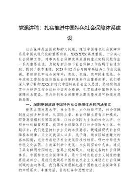 党课讲稿:扎实推进中国特色社会保障体系建设社会保障是治国安邦的大问题。建设中国特色社会保障体系是中国式现代化的重要内容。XXXXXX高度重视、十分关心社会保障工作,对事关社会保障改革发展的重大实践问题作出一系列重要论述,为做好新形势下社会保障工作指明了前进方向、提供了根本遵循。2023年12月召开的中央经济工作会议强调,要织密扎牢社会保障网;兜住、兜准、兜牢民生底线。今年政府工作报告就加强社会保障和服务作出重要部署。我们要深入学习贯彻XXX新时代中国特色社会主义思想,坚决贯彻落实中央经济工作会议和全国两会精神,扎实推进中国特色社会保障体系建设,努力开创社会保障事业高质量发展可持续发展新局面。一、深刻把握建设中国特色社会保障体系的内涵要义世界各国发展水平、社会条件、文化特征不同,社会保障制度必然多种多样。从国际上看,社会保障主要有三种模式,即普惠型福利型国家保障、以社会保险为主体的社会共济、公积金计划储蓄积累。我国社会保障体系以社会保险为主体。长期以来,我们党坚持社会主义的本质要求,既遵循现代社会保障基本规律,又立足我国人口多、底子薄、城乡区域差距大的基本国情,充分考虑经济社会发展阶段性特征,吸收中华优秀传统文化基因,在改革创新中发展,在实践探索中完善,建成了具有鲜明中国特色、世界上规模最大、功能完备的社会保障体系。中国特色社会保障体系,是中国特色社会主义制度的重要组成部分,是我们党领导中国特色社会主义建设在社会保障领域的生动体现。我们要深刻理解把握中国特色社会保障体系的本质要求、丰富内涵、目标任务和思想方法。以坚持和加强党的领导为根本保证。我们党历来高度重视民生改善和社会保障。新中国成立伊始,全面建立劳动保险制度。改革开放以后,党把社会保障作为建立社会主义市场经济体制的重要支柱和改善人民生活水平的制度安排,确立社会统筹与个人账户相结合的制度模式,稳步推进社会保障体系建设,搭建起我国社会保障制度的四梁八柱。党的十八大以来,以XXX同志为核心的党中央把社会保障体系建设摆上更加突出的位置,加强集中统一领导,统筹协调各方面利益关系,调动各方面积极性,推动社会保障兜底线、织密网、建机制,我国社会保障体系建设进入快车道,取得历史性成就、发生历史性变革。统一城乡居民养老保险制度,推动机关事业单位和企业养老保险制度并轨,实现企业职工基本养老保险全国统筹,建立个人养老金制度,我国多层次、多支柱养老保险体系基本形成。失业保险、工伤保险制度体系不断完善。社会保障制度改革涉及深层次、多元化重大利益格局调整,其复杂性、艰巨性、敏感性非常突出。正是因为我们党从全局高度出发,统一思想认识,加强顶层设计,集中力量办大事,我国社会保障事业从无到有、从小到大,取得令世人瞩目的成就。实践证明,党的领导是中国特色社会保障体系最本质的特征和最大优势,是我国社会保障事业行稳致远的根本所在。以坚持人民至上为根本出发点和落脚点。社会保障关乎人民群众最关心最直接最现实的利益问题。我们党围绕覆盖全民、人人享有的目标,推动实施全民参保计划,推进城乡统筹,将更多的群众纳入保障范围,不断增强社会保障公平性,织就世界上覆盖人口规模最大的社会保障安全网。截至2023年底,我国基本养老、失业、工伤保险参保人数达到10.66亿人、2.44亿人、3.02亿人,比2012年分别增加2.78亿人、0.92亿人、1.12亿人。坚持共享发展,稳步提高社会保障待遇水平,让人民群众更多更公平分享改革发展成果。2023年全国企业退休人员月人均基本养老金比2012年增加一倍,月平均失业保险金水平从文可居文库——海量学习资料,手机电脑均可下载www.wenkeju.com2012年的707元提高到2023年的1814元,月平均工伤保险伤残津贴由1864元提高到4000元。在打赢脱贫攻坚战中,通过政策倾斜,6098万建档立卡贫困人口实现基本养老保险应保尽保。坚持记录一生、保障一生、服务一生,统筹城乡的五级社保经办管理服务网络基本形成,社会保障卡覆盖98%的人口,最大限度方便群众,不断提升群众办事满意度。这些都体现了社会保障锚定基本民生,顺民意、解民忧、暖民心的鲜明特征。我国社会保障体系建设致力于增进民生福祉、促进社会公平,通过一系列制度安排和政策举措,有效纾解群众防范相关风险的后顾之忧。这是建设中国特色社会保障体系必须坚守的根本立场。以高质量发展可持续发展为鲜明主题。高质量发展,体现的是人民群众需要的时代特征。随着我国社会主要矛盾的变化,人民群众对社会保障的需求从有没有逐步转向好不好,内涵不断丰富、层次不断提升,期盼有更高质量的社会保障。可持续发展,是针对健全社会保障体系面临的发展环境和形势要求作出的重要判断,体现的是社会保障代际平衡和制度成熟的发展规律,是对建设更为可靠的社会保障体系的基