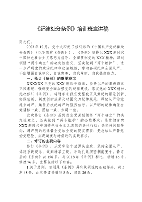 《纪律处分条例》培训班宣讲稿同志们:2023年12月,党中央印发了修订后的《中国共产党纪律处分条例》(以下简称《条例》)。《条例》坚持以XXX新时代中国特色社会主义思想为指导,全面贯彻党的XXX精神,深刻领悟两个确立的决定性意义、坚决做到两个维护,进一步严明党的政治纪律和政治规矩,带动各项纪律全面从严,不断增强自我净化、自我完善、自我革新、自我提高能力。一、修订《条例》的重要意义XXXXXX在党的XXX报告中指出,坚持以严的基调强化正风肃纪,强调要全面加强党的纪律建设。落实党的XXX精神,此次修订《条例》,将近年来我们党强化正风肃纪的理论创新、实践创新、制度创新成果及时固化为纪律规范,释放从严治党越来越严、越往后执纪越严的强烈信号,以严明的纪律确保全党目标一致、团结一致、步调一致。此次修订《条例》是促进全党深刻领悟两个确立的决定性意义、坚决做到两个维护的必然要求;是贯彻落实XXX新时代中国特色社会主义思想的具体行动;是坚持问题导向,用严明的纪律管全党治全党的现实需要;是总结从严管党治党经验、实现制度与时俱进的实践要求。二、修订的主要内容修订《条例》,从党章这个总源头出发,坚持全面从严,体现系统观念,做到科学立规,不断扎紧织密制度笼子。修订后的《条例》共158条,与2018年《条例》相比,新增16条,修改76条,主要包括以下内容:1.关于总则。总则是《条例》具有统领性的基础部分,共5章48条,此次修订共增写5条,修改26条。一是丰富了指导思想和总体要求。在第二条指导思想中增写弘扬伟大建党精神坚持自我革命推动解决大党独有难题、健全全面从严治党体系为以中国式现代化全面推进强国建设、民族复兴伟业提供坚强纪律保障等内容,在第三条总体要求中增写坚守初心使命切实践行正确的权力观、政绩观、事业观等内容,明确纪律建设的宗旨目标和功能定位,强化各级党组织纪律建设责任和广大党员、干部遵规守纪自觉。二是坚持从严要求。在第四条工作原则中对把严的基调严的措施、严的氛围长期坚持下去作出总体规定,又在违纪与纪律处分等总则各章中加以细化,奠定整部法规严的基调。三是完善纪法衔接条款。在第三十条规定对有破坏社会主义市场经济秩序、违反治安管理、违反国家财经纪律等行为的党员视情节轻重给予处分,对有涉黄涉毒等丧失党员条件、严重败坏党的形象行为的党员应当开除党籍,进一步细化处分情形,标定处分档次。四是促进执纪执法贯通。新增第二十八条,明确规定做到党纪政务等处分相匹配,在第十一条、第三十五条细化规定对党员撤销党内职务的,应当建议党外组织撤销其党外职务,以及党员依法受到撤职以上处分的,同时给予撤销党内职务以上处分,将第四条增写的执纪执法贯通原则落实落细。同时,借鉴国家法律有关规定,充实完善从轻减轻处分情形、党纪处分影响期计算规则、共同违纪数额认定标准、经济损失计算规则等内容。五是深化运用四种形态、落实三个区分开来。将XXX党章修正案新增内容具体化,在第五条中充实第一种形态处理方式,增写谈话提醒、批评教育、责令检查、诫勉,推动抓早抓小、防微杜渐、层层设防。完善纪律处分运用规则,在第十九条规定区分一般违纪、轻微违纪、不追究党纪责任等文可居文库——海量学习资料,手机电脑均可下载www.wenkeju.com不同情形给予相应处理,推动把从严管理监督和鼓励担当作为统一起来。2.关于政治纪律。政治纪律是党的各级组织和全体党员在政治立场、政治方向、政治原则、政治道路上必须遵守的行为规则,是维护党的团结统一的根本保证。《条例》分则对违反政治纪律行为的处分一章共28条,增写2条,修改12条。一是坚决维护党中央权威,保障党中央政令畅通。在第五十六条增写对不顾党和国家大局、搞部门或者地方保护主义行为的处分规定,将贯彻党中央决策部署只表态不落实行为由违反工作纪律调整到违反政治纪律。二是推动完整、准确、全面贯彻新发展理念,促进高质量发展。新增第五十七条,充实党员领导干部政绩观错位,违背新发展理念、背离高质量发展要求的处分规定,将搞劳民伤财的形象工程、政绩工程行为由违反群众纪律调整到违反政治纪律。三是促进对党忠诚老实,维护党的团结统一。在第五十四条增写搞政治攀附行为的处分规定,并新增第五十五条,明确对搞投机钻营,结交政治骗子以及充当政治骗子行为的处分规定。四是规范政治言行,坚定理想信念。针对执纪监督中发现的问题,在第五十二条增写对私自阅看、浏览、收听有严重政治问题资料,情节严重行为的处分规定;在第六十九条明确对信仰宗教的党员加强思想教育,要求其限期改正;在第七十条增写对个人搞迷信活动行为的处分规定,促进党员坚定理想信念,永葆政治本色。3.关于组织纪律。组织纪律是规范和处理党的各级组织之间、党组织与党员之间以及党员