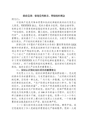廉政党课:强化党性修养,增强组织观念同志们:中国共产党是用革命理想和铁的纪律组织起来的马克思主义政党。XXXXXX指出,党的力量来自组织,党的全面领导、党的全部工作要靠党的坚强组织体系去实现,强调全党同志要相信组织、依靠组织、服从组织,自觉接受组织安排和纪律约束。这些重要论述,深刻阐明了党的组织体系建设的极端重要性,深刻揭示了个人与组织的内在关系,为党员干部强化组织观念、严守组织纪律提供了根本遵循。新修订的《中国共产党纪律处分条例》围绕贯彻党的XXX精神和党章要求,聚焦落实新时代好干部标准、增强党员组织观念等方面严明组织纪律,并对违反民主集中制原则行为、七个有之问题等相关条款作了进一步充实完善,为各级党组织和广大党员干部严格划定了组织纪律的高压线。深入学习贯彻XXXXXX关于严守组织纪律的重要要求,严格落实《条例》,对于加强党的组织纪律建设,落实新时代党的组织路线,推进全面从严治党具有重要意义。一、深刻认识强化组织观念的重要意义马克思主义认为,组织纪律是维护党的团结统一、完成党的使命任务的重要保证。马克思曾经指出:必须绝对保持党的纪律,否则将一事无成。列宁进一步强调,无产阶级政党的纪律是铁的纪律,无产阶级在争取政权的斗争中,除了组织而外,没有别的武器。中国共产党是按照马克思主义建党原则建立起来的无产阶级政党,组织严密、纪律严明是我们党的优良传统和强大优势。在100多年的奋斗历程中,我们党之所以能够在逆境中不倒、在挫折中奋起,取得一个又一个伟大胜利,发展成为世界上最大的马克思主义执政党,一个极其重要的保证就是组织体系严密、组织纪律严明。(一)强化组织观念是我们党的光荣传统。建党伊始,我们党就规定了加入党的组织需要经过严格的程序。党的一大通过的《中国共产党第一个纲领》明确规定,须经党员一人介绍,才能成为我们的同志。井冈山时期,毛泽东亲自制定的三大纪律八项注意,对于严肃党纪军纪、粉碎敌人围剿发挥了重要作用。延安时期,毛泽东在党的六届六中全会上重申党的纪律,首次提出四个服从的原则,即个人服从组织、少数服从多数、下级服从上级、全党服从中央。这四个服从,既是党的组织纪律的核心内容,也是维护党的团结统一、确保党的行动一致的重要保障。西柏坡时期,毛泽东指出加强纪律性,革命无不胜,狠抓党内军内纪律建设,建立请示报告制度,保证了党中央的集中统一领导,为夺取全国胜利提供了坚强纪律保证。新中国成立后,我们党一如既往地将加强纪律建设置于重要地位,突出执政条件下纪律建设的重点内容,全党的组织纪律性进一步加强,为社会主义革命和建设提供了坚强纪律保障。在三反运动中,我们党查处了刘青山、张子善腐败案,引起了全党全社会的极大震动。针对党内有领导同志为刘、张两人说情的举动,毛泽东严肃指出:正是因为他们两人地位高、功劳大、影响大,所以才要下决心处决他们。只有处决他们,才可能挽救二十个、两百个、两千个、两万个犯有各种不同程度错误的干部。改革开放和社会主义现代化建设新时期,面对新形势新任务,邓小平多次强调,一靠理想,二靠纪律。1980年2月,党的十一届五中全会通过《关于党内政治生活的若干准则》,从12个方面对全党政治生活、组织生活和全体党员的行为作了全面规定,为党员遵守组织纪律提供了遵循。1982年9月,党的十二大对党的纪律建设提出了一系列明确规定,阐述了四个服从的内涵,制定党的根本组织原则和纪律要求;明确民主集中制的6条基本原则,把纪律要求纳入党员必须履行的8项义务等。此后我们党修订的每一部党章,都明确强调要坚持民主集中制,加强组织性、纪律性。(二)强化组织观念是拥护两个确立、践行两个维文可居文库——海量学习资料,手机电脑均可下载www.wenkeju.com护的必然要求。党的十八大以来,以XXX同志为核心的党中央从党章这个总源头出发,在总结实践经验的基础上,与时俱进完善组织纪律规范,为推动新时代党的组织路线提供了坚强纪律保证。在二十届中央纪委三次全会上,XXXXXX深刻阐述党的自我革命的重要思想,明确提出九个以的实践要求,其中就包括以锻造坚强组织、建设过硬队伍为重要着力点,提出必须进一步严明组织纪律,贯彻新时代党的组织路线,推动各级党组织全面进步、全面过硬,使广大党员干部做到忠诚干净担当。新征程上,我们面临的形势越是复杂、肩负的任务越是繁重,越要严明党的组织纪律,保证全党团结统一、步调一致向前进,齐心协力谱写事业发展新篇章。二、全面把握强化组织观念的核心要求(一)坚持民主集中制原则。民主集中制是指民主基础上的集中和集中指导下的民主相统一的原则,是我们党的根本组织原则和领导制度。党章明确党是根据自己的纲领和章程,按照民主集中制组织起来的统一整体,并规定了民主集中制的六项基本原则