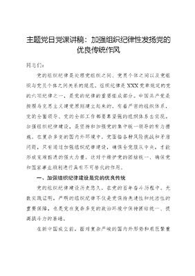 主题党日党课讲稿:加强组织纪律性发扬党的优良传统作风同志们:党的组织纪律是处理党组织之间、党员个体之间以及党组织与党员个体之间关系的规范。组织纪律是XXX党章规定的党的六项纪律之一,是党的纪律的重要组成部分。中国共产党是按照马克思主义建党原则建立起来的,有着严密的组织体系,党的全面领导、党的全部工作都要靠坚强的组织体系去实现。加强组织纪律建设,是坚持和加强党的集中统一领导的有力措施。在复杂多变的国内外环境中,党面临各种风险挑战和矛盾问题,只有通过加强组织纪律建设,确保全党服从中央,才能形成克难前进的强大力量。这对于维护党的团结统一、确保党和国家事业顺利进行具有不可替代的作用。一、加强组织纪律建设是党的优良传统党的组织纪律建设历史悠久,在党的百年奋斗历程中,无数实践证明,严明的组织纪律不仅是党保持先进性和纯洁性的重要保障,也是党在复杂多变的政治环境中保持团结统一、提高战斗力的基础。在新中国成立前,面对复杂严峻的国内外形势和艰巨繁重的革命任务,党的组织纪律建设起步于实践中的需要。1922年党的二大制定的第一部正式党章就明确规定:全国大会及中央执行委员会之议决,本党党员皆须绝对服从之,本党一切会议均取决多数,少数绝对服从多数。这就是四个服从原则中全党服从中央、少数服从多数的雏形。党的五大通过的党章将民主集中制这一根本的组织原则写入党章。随着革命形势的发展,我们党深刻认识到
