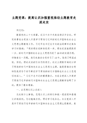 主题党课:提高认识加强重视推动主题教育走深走实同志们:根据党的二十大部署,近日中共中央政治局召开会议,研究部署在全党深入开展学习贯彻习近平新时代中国特色社会主义思想主题教育工作。习近平总书记在中央政治局第四次集体学习时强调:党的理论创新每前进一步,理论武装就要跟进一步。新时代中国特色社会主义思想历经了10年的发展历程,伴随着这一历程,我们也推动全党学习了10年,取得了明显成效。但是,理论武装的任务仍然艰巨。这次主题教育确定以学习贯彻新时代中国特色社会主义思想为主题,就是要推动全党特别是领导干部不断把学习贯彻新时代中国特色社会主义思想引向深入。习近平总书记的重要指示,为在全党深入开展学习贯彻习近平新时代中国特色社会主义思想主题教育指明了方向,提供了根本遵循。一、在思想认识上求深入无论做什么事情,思想认识上的到位和统一是前提和基础认识越深刻,行动就越自觉,理论学习也如此。在全党深入开展学习贯彻习近平新时代中国特色社会主义思想主题教育,是党中央为全面贯彻党的二十大精神,动员全党同志为完成党的中心任务而团结奋斗所作的重大部署,是深入推进新时代党的建设新的伟大工程的重大部署。我们一定要站在政治的高度、时代的高度、历史的高度深刻认识其重大意义,不折不扣把中央的决策部署落到实处,推动学习教育活动走深走实。从党和国家事业的高度深刻认识学习教育活动的重大意义习近平总书记指出:一个民族要走在时代前列,就一刻不能没有理论思维,一刻不能没有正确思想指引。习近平新时代中国特色社会主义思想是当代中国马克思主义、二十一世纪马克思主义,是党和人民奋进新征程的行动指南。从推进中国式现代化的需要来看,只有坚持不懈用习近平新时代中国特色社会主义思想凝心聚力,才能准确把握中国式现代化的根本性质、牢牢锚定中国式现代化的奋斗目标、充分激发推进中国式现代化的强劲动力、广泛凝聚推进中国式现代化的磅礴力量,在中国式现代化的道路上实现中华民族伟大复兴。从战胜新征程上的风险挑战来看,只有坚持不懈用习近平新时代中国特色社会主义思想凝心聚魂,才能不断提高全党运用科学理论应对风险挑战的能力,才能以咬定青山不放松的顽强韧劲,发扬越是艰险越向前的斗争精神,迎难而上,沉着应对,赢得战略主动。从推进新时代党的建设新的伟大工程要求来看,只有坚持不懈用习近平新时代中国特色社会主义思想凝心聚魂,才能使全党同志特别是领导干部牢记三个务必,经受四大考验、克服四个危险,永葆党的先进性和纯洁性,团结带领广大人民群众共克时艰,不断开创强国建设、民族复兴的新局面。从个人成长进步的角度深刻认识学习教育活动的重大意义习近平总书记指出:对领导干部来说,马克思主义这个看家本领掌握得越牢靠,政治站位就越高,政治判断力、政治领悟力、政治执行力就越强,观察时势、谋划发展、防范化解风险就越主动。党的十八大以来,习近平新时代中国特色社会主义思想不仅使党和国家的事业取得历史性成就、发生历史性变革,而且给广大党员干部以深厚的精神滋养,教给我们正确认识客观世界和主观世界的科学方法和行动指南,让我们受益终身。在民族复兴的新征程上,我们面临形势环境的考验是严峻的、长期的,肩负的使命任务是繁重的、艰巨的,只有坚持不懈用习近平新时代中国特色社会主义思想凝心聚魂,才能在各种挑战和考验面前,明确前进方向、保持战略定力,做到任凭风浪起,稳坐钓鱼台;才能在使命任务面前,勇于担当作为,不断开拓进取,把党和国家的各项事业不断推向前进。二、要在创新方法上求深入我们党在学习教育上曾创造了许多成功经验。比如,在学习安排上多次分批发布学习计划,在学习模式上开展分类编组、分级指导的差异化学习,在学习激励上明确提出勤学者奖、怠惰者罚,在学习方法上提出工作忙就要挤,看不懂就要钻等,有效地提高了广大党员干部的思想理论水平。进入新时代,对学习党的创新理论提出了更高的要求,学习必须注重守正创新,在坚持实践证明了的行之有效的经验方法基础上,积极推进学习教育方式方法的创新,让理论学习的形式更加贴近学习的内容,做到相互促进、相得益彰。要在深读原著上下功夫。学习理论最有效的办法是读原著、学原文、悟原理,强读强记,常学常新。原著原文最能体现理论的实质和核心要义。读原文、悟原理,必须是全面的、系统的,不是零碎的、孤立的。学习贯彻习近平新时代中国特色社会主义思想,就要以《习近平著作选读》《习近平谈治国理政》等为读本,并同学习习近平总书记最新讲话精神紧密结合,同学习领会党的二十大精神紧密结合,逐句逐段研读、反复咀嚼消化,不满足于记住个别词句,重在掌握精髓要义,达到融会贯通之效。只要我们保持一股学习的静气沉下心来认真钻研原著,坚持不懈、久久为功,我们的理论水平必将有一个大的提高。要在多思深思上下功夫。学而不思则罔。在熟读精读原著