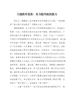 主题教育党课:着力提升政治能力同志们,根据第二批主题教育动员部署会议议程,下面我围绕着力提升政治能力为题给大家上一堂党课。XXXXXX强调,在干部干好工作所需的各种能力中,政治能力是第一位的。回顾我们党历次党内集中教育,都把锤炼党员、干部政治能力作为重要目标、鲜明标尺。目前,全党上下正在深入开展学习贯彻XXX新时代中国特色社会主义思想主题教育,我们要牢牢把握学思想、强党性、重实践、建新功总要求,紧紧锚定以学铸魂、以学增智、以学正风、以学促干硬任务,坚持把锤炼政治能力贯穿主题教育始终,引导党员、干部站稳政治立场、砥砺政治品格、强化政治担当,积极投身中国式现代化伟大实践。前期市委召开学习贯彻XXX新时代中国特色社会主义思想主题教育专题民主生活会,X书记强调明确全市各级党组织要始终聚焦学思想、强党性、重实践、建新功总要求,对照凝心铸魂筑牢根本、锤炼品格强化忠诚、实干担当促进发展、践行宗旨为民造福、廉洁奉公树立新风具体目标,深入学习领悟XXXXXX以学铸魂以学增智、以学正风、以学促干重要论述的丰富内涵和实践要求检视差距不足,进行党性分析,着力从思想根源上解决问题,坚定捍卫两个确立,坚决做到两个维护。一、注重学思想,筑牢政治信仰根基加强理论学习、铸牢政治忠诚,是共产党人的必修课。党员、干部必须把学习贯彻XXX新时代中国特色社会主义思想作为首要政治任务,坚持把学思想作为提高政治能力的根本,持续在学深悟透、笃信笃行上下功夫,真正把马克思主义看家本领学到手。一是入脑入心,提高政治素养。XXX新时代中国特色社会主义思想内涵丰富、博大精深,是一个系统完整、逻辑严密、相互贯通的科学理论体系,必须通过强读强记提高理论修养、深学深悟把握精神实质、常学常新提升站位境界,以理论清醒确保政治坚定。要让各级党组织把学思想作为理论学习的第一议题,推动党员、干部全面系统学、联系实际学、与时俱进学,深刻领悟蕴含其中的立场观点方法、道理学理哲理。要抓住开展主题教育重大契机,创新学习方式,保证学时要求,引导广大党员、干部深入领会对共产党人政治品格、价值追求、精神境界、作风操守的要求,不断提升思想觉悟、提高政治素养。二是对标对表,夯实忠诚基座。坚持把铸牢政治忠诚摆在突出位置,推动党员、干部深刻领悟两个确立的决定性意义,坚决做到两个维护。具体来讲,就是要在抓好系统学习的同时,紧密联系新时代党和国家事业取得的历史性成就、发生的历史性变革,紧密联系改革发展的生动实践自觉同党的基本理论、基本路线、基本方略对标对表,以党的旗帜为旗帜、以党的意志为意志、以党的使命为使命,保证全党思想统一、意志统一、行动统一。要把XXXXXX对的重要讲话和重要指示批示精神作为全部工作的纲和魂,逐条逐项对照研究谋划、部署推进,用心用力推动落实落细、落地见效。三是真心笃行,深化学用结合。学习贯彻XXX新时代中国特色社会主义思想的目的全在于运用,在于把这一思想变成改造主观世界和客观世界的强大思想武器。要坚持在学思想中提升素质、锻造能力,引导党员、干部树立正确的权力观、政绩观、事业观,增强责任感、使命感、紧迫感,练就推动发展、服务人民的硬本领全面提振锐意进取、担当作为的精气神,真正把思想力量转化为行动力量和实践成效。尤其要不断强化党组织政治功能和组织功能,推动干部、组织、人才资源向中心工作聚焦,切实把党的政治优势、组织优势转化为发展优势。二、坚持强党性,锻造政治能力基石党性是党员、干部立身、立业、立言、立德的基石。开展主题教育,要自觉用XXX新时代中国特色社会主义思想凝心铸魂,不断提升思想境界,持续强化党性锤炼,使党员、干部始终保持共产党人的政治本色。注重用理想信念涵养党性。坚定的理想信念是激励广大党员、干部奋勇向前、克难制胜的力量源泉。要加强理想信念教育,引导广大党员、干部自觉经受思想淬炼、精神洗礼,增强对党的价值追求和前进方向的高度政治认同,真正把好世界观、人生观、价值观这个总开关。要教育广大党员、干部坚定对马克思主义的信仰、对中国特色社会主义的信念、对实现中华民族伟大复兴中国梦的信心,真正从主题教育中汲取奋勇前行的力量、矢志不渝的豪情。严格遵守规矩砥砺党性。守纪律讲规矩是对党员、干部党性的重要考验。新时代加强党员、干部党性修养,必须坚持以党章和党规党纪为遵循,严格执行党的政治纪律、组织纪律、廉洁纪律等,从思想深处拧紧螺丝。遵守党的纪律规矩是具体的、明确的,必须重点督促各级领导班子和领导干部严格落实民主集中制各项要求,认真执行重大事项请示报告制度,坚决防止七个有之,落实五个必须,始终做到知敬畏、存戒惧、守底线。突出教育管理淬炼党性。党内政治生活是党组织教育管理党员和党员进行党性锻炼的主要载体。主题教育中,必须把增强政治性、时代性、原则