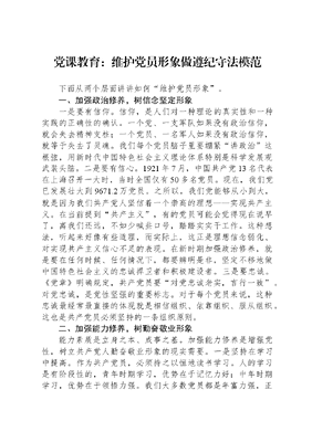 党课教育:维护党员形象做遵纪守法模范下面从两个层面讲讲如何维护党员形象。一、加强政治修养,树信念坚定形象一是要有信仰。信仰,是人们对一种理论的真实性和一种实践的正确性的确认。一个党、一支军队如果没有政治信仰,就会失去精神支柱;一个党员、一名军人如果没有政治信仰,就等于失去了灵魂。我们每个党员脑子里要绷紧讲政治这根弦,用新时代中国特色社会主义理论体系特别是科学发展观武装头脑。二是要有信心。1921年7月,中国共产党13名代表在上海召开一大时,当时全国仅有50多名党员。现在,我们党已发展壮大到9671.2万党员。之所以,我们党能够从小到大,就是因为我们共产党人坚信着一个崇高的理想——实现共产主义。在当前提到共产主义,有的党员可能会觉得现在说早了,离我们还远,不如少喊些口号,踏踏实实干工作。这种想法,听起来好像有些道理,而实际上,这正是理想信念弱化、对实现共产主义信心不足的表现。在新时期加强政治修养,就是要在任何时候、任何情况下,都要辨明是非,坚定不移地做中国特色社会主义的忠诚捍卫者和积极建设者。三是要忠诚。《党章》明确规定,共产党员要对党忠诚老实,言行一致。对党忠诚,是党性坚强的重要标志。对于每个党员来说,这种忠诚最经常最直接的体现就是相信组织、依靠组织、服从组织。这也是共产党员必须坚持的一条组织原则。二、加强能力修养,树勤奋敬业形象能力素质是立身之本、成事之基。加强能力修养是增强党性,树立共产党人勤奋敬业形象的现实需要。一是坚持在学习中提高。作为共产党员,必须持之以恒地读书学习。人的学习是有阶段性的,青年时期学习,优势在于记忆力好;中年时期学习,优势在于领悟力强。我们大多数党员都是年富力强,正处于领悟能力、运用能力、创造能力都很强的阶段,易于学习;我们正处于知识日益更新、信息化迅猛发展的阶段,需要学习;我们肩负着建设现代化武警重任,要求严、标准高,必须学习。这就要求我们要有时不我待的紧迫感,坚持不懈地抓好学习。二是坚持在岗位中磨练。千淘万漉虽辛苦,吹尽狂沙始到金。共产党员加强能力修养,要敢于经受艰苦环境、复杂矛盾、各种困难的锻炼和考验。越是艰苦的地方,越要刻苦工作;越是困难的工作,越要迎难而上。只有这样,才能使自己的思想更纯洁,党性更坚强,成长得更快;才能在党和人民需要的时候,义无反顾,勇往直前,不惜奉献自己的一切。工作岗位是实现理想抱负的最好平台,尽职尽责是加强党性修养的最佳途径。从党的好干部焦裕禄、孔繁森、郑培民、牛玉儒的身上,我们不难看出,他们并没有轰轰烈烈的英雄壮举,只是把本职岗位作为履行职责使命的最好平台,从小处着眼,从点滴做起,扑下身子,真抓实干,在平凡中成就伟大,在实干中实现升华。三、加强道德修养,树和谐干事形象加强道德修养,要自觉做到三常:一是常怀感恩之情。感恩是中华民族的传统美德,也是加强道德修养的重要内容。看一个党员讲不讲修养,首先要看他念不念党恩。陈毅元帅说过:第一想到不忘本,来自人民莫作恶;第二想到党培养,无党岂能有作为;第三想到衣食住,若无人民岂能活。作为党员应该时刻想一想:自己能从一名普通青年,来到部队,入了党、转了士官,有的还走上了领导岗位,除了要牢记父母的养育之恩,还要牢记组织的教育引导之恩,提供良好学习、工作环境的栽培之恩,给予荣誉、奖赏的激励之恩,帮助解决切身利益问题的关怀之恩,乃至批评劝诫、处分的挽救之恩,等等。二是常有知足之感。知足者常乐,贪婪者常悲。这是中国传承千年的古训,也是人们求得心理平衡的一剂良药。孔繁森同志说过:老是把自己当珍珠,就时常有怕被埋没的痛苦;要把自己当泥土,让众人把你踩成路,就绝不会埋没。我们要保持一颗平常心,以平和的心态、豁达的胸怀处理得失,以奉献精神,不为名所累、不为利所缚。如果要说不知足,应当是工作上的不足,道德修养上的不足,知识才能上的不足。三是常修友善之心。友善,是指善良、关爱、友好等,是人与人之间的一种美好心灵、美好情感、美好愿望。从古到今,人们对善都是倍加推崇、竭尽赞美。比如,《三字经》,开篇即是人之初,性本善。共产党员,要把与人为善作为一种品质,对他人要友好、要关心、要爱护,同时对他人的误会、过失要宽宏大量。一个不善于团结他人、关心他人、帮助他人的人,自己肯定也不快乐、不成功;而那些能够很好的和别人共事,团结一心干事业的人,最终成就了别人,也成功了自己。下面我从两个方面谈一谈如何做遵纪守法模范。遵守纪律是对党忠诚的内在要求和重要保证。对于党员来讲,最基本的就是要强化严格自律意识,自觉把党纪国法和军队的条令条例、规章制度作为自己的行为规范和准则。四、为什么要遵纪守法依法治国,是我们国家的基本治国方略,遵纪守法,既是我军的光荣传统,和战斗力生成之本,军威所在,也是确保官兵一生平安、发展顺利和实现个人理想前途的