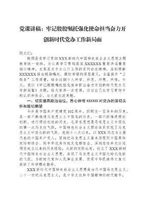 党课讲稿:牢记殷殷嘱托强化使命担当奋力开创新时代党办工作新局面同志们:按照县委学习贯彻XXX新时代中国特色社会主义思想主题教育统一安排,为认真学习贯彻落实XXXXXX重要讲话重要指示精神,尤其是关于办公厅工作的系列论述精神,深刻理解XXXXXX提出勉励嘱托、殷切希望的深层意义,全面提升三服务工作质量,结合近期个人所学、所思、所想、所悟,今天,我以《牢记殷殷嘱托强化使命担当奋力开创新时代党办工作新局面》为题,给大家讲一次党课,谈谈自己在学习贯彻中的认识和体会,与大家交流共勉。一、切实提高政治站位,悉心体悟XXXXXX对党办的深切关怀和殷切期望今年是中国共产党建党102周年,回顾这一百多年的历史,是一部不断推进马克思主义中国化的历史,一部不断推进理论创新、进行理论创造的历史。毛泽东思想是马克思主义中国化的第一次历史性飞跃,中国特色社会主义理论体系实现了马克思主义中国化新的飞跃。党的十八大以来,以XXX同志为主要代表的中国共产党人,坚持把马克思主义基本原理同中国具体实际相结合、同中华优秀传统文化相结合,深刻总结并充分运用党成立以来的历史经验,从新的实际出发,创立了XXX新时代中国特色社会主义思想,实现了马克思主义中国化时代化新的飞跃,为新时代党和人民事业发展、实现中华民族伟大复兴提供了科学理论指导。XXX新时代中国特色社会主义思想是当代中国马克思主义、二十一世纪马克思主义,是中华文化和中国精神的时代精华,实现了马克思主义中国化时代化新的飞跃。XXX新时代中国特色社会主义思想以两个结合为根本途径推进理论创新,是顺应时代大势、适应实践所需、植根文化沃土的科学真理,以马克思主义中国化时代化新的飞跃,引领新时代党和国家事业取得历史性成就、发生历史性变革。其内涵丰富、逻辑严密、体系完备、博大精深,涵盖改革发展稳定、内政外交国防、治党治国治军等方方面面,构成集时代性、系统性、原创性于一体的开放的科学体系。党的XX大报告明确指出,十个明确、十四个坚持、十三个方面成就概括了这一思想的主要内容。新征程上,我们必须坚持不懈用XXX新时代中国特色社会主义思想凝心铸魂,完整把握、准确理解这一科学思想的世界观和方法论,坚持好、运用好贯穿其中的立场观点方法,进一步增强对两个确立、两个维护的政治认同、思想认同、理论认同、情感认同,更加紧密地团结在以XXX同志为核心的党中央周围,更加自觉用当代中国马克思主义、二十一世纪马克思主义指引方向,凝心聚力走好新时代的赶考之路。党委办公室处于四最一中枢(为党委服务最直接、联系各方面最广泛、保障党委工作最关键、在各机构运转中最核心,居于承上启下、协调左右的中枢位置)的特殊位置,是首要政治机关,开展学习贯彻XXX新时代中国特色社会思想主题教育的首要任务,就是要认真学习领会XXXXXX对新时代党委办公厅(室)工作作出的重要指示批示精神,悉心感悟体会XXX对党办工作的殷殷嘱托和殷切期望,切实把XXXXXX重要论述精神作为提升三服务工作质量、开创党办工作新局面的强大思想武器和行动指南。XXXXXX非常熟悉办公厅工作,不仅组织领导过这项工作,而且亲自做过这项工作。他大学毕业到军委办公厅做秘书工作,后来无论在地方担任县委书记、地(市)委书记、省长、省委书记,还是在中央担任党的XXX,都非常重视办公厅(室)工作,关心办公厅(室)建设,提出了做好办公厅(室)工作的一系列指示要求。1988年至1990年间,XXX同志在担任福建省宁德地委书记时指出,对于办公室工作,体会最深的有四个字:一是重,地位重要。二是苦,非常辛苦。三是杂,事务繁杂。四是难,难度很大。他要求地方党委的领导,对办公室工作要在理解、信任和尊重的基础上支持使用。1993年11月,XXX同志在担任福州市委书记时要求市委办公厅:对党忠诚、马上就办、严谨认真、同心协力、无私奉献。他指出,办公厅(室)是一个单位的首脑机关,时时处处都要起表率作用。讲政治、坚持政治原则,很重要的一条,就是要在思想上政治上行动上同党中央保持高度一致。用坚强的党性确保中央政令畅通,确保党的路线方针政策不折不扣得到贯彻落实。要有高度的责任感,要高效率开展工作,实行高水平服务。要讲团结、顾大局,正确对待自己和别人,与人为善、常怀善念,互相尊重、互相支持,在相互配合中加深了解,在合作共事中增进团结。要戒奢节俭,自觉抵制铺张浪费的不良风气。2005年5月,XXX同志在担任浙江省委书记时指出:省委提出大的思路,办公厅的同志要帮助出主意;省委作出大的决策,办公厅要制定具体方案;省委勾勒蓝图,办公厅要描绘细节,具体深化;省委提出目标,办公厅要考虑行军路线,做好搭桥铺路的工作。XXX同志说,文件是用来指导工作的,要言之有物,有具体内容,有创新之处,连标点符号