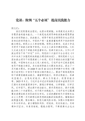 党课:做到五个必须 提高实践能力同志们:我们党既要政治坚定,也要本领高强。本领是完成本职工作要具备的基本能力,一个政党完成领导和执政使命需要具备基本的领导能力、执政能力,领导干部完成领导职责也必须具备相应的领导能力。中国共产党一直高度重视党员干部的领导能力建设,新民主主义革命时期,领导工农革命、武装斗争成为党员干部能力的集中体现;社会主义革命和建设时期,又红又专成为党员干部能力的显著标识;改革开放以来,从邓小平提出领导干部四化方针,到党的十六届四中全会通过《中共中央关于加强党的执政能力建设的决定》,再到党的十九大报告提出领导干部要提高八个本领,党员干部能力的范围不断拓展。中国特色社会主义进入新时代,习近平总书记高度重视党员干部能力建设,多次就领导能力问题发表讲话,提出了一系列能力要求,如2020年10月10日在秋季学期中央党校(国家行政学院)中青年干部培训班开班式上,要求干部特别是年轻干部要提高政治能力、调查研究能力、科学决策能力、改革攻坚能力、应急处突能力、群众工作能力、抓落实能力等。2023年5月,习近平总书记在听取陕西省委和省政府工作汇报时发表的重要讲话中,围绕以学铸魂、以学增智、以学正风、以学促干,提出提升政治能力、提升思维能力、提升实践能力的三个方面要求。对于提升实践能力,习近平总书记强调要发扬理论联系实际的优良学风,全面把握新时代中国特色社会主义思想一系列新理念新思想新战略的实践要求,增强推动高质量发展、服务群众、防范化解风险本领,加强斗争精神和斗争本领养成,着力增强防风险、迎挑战、抗打压能力,及时填知识空白、补素质短板、强能力弱项,不断提高专业化水平。无疑,把提升实践能力作为落脚点,在当前复杂的形势下具有特别重要的意义。一、提升实践能力必须掌握科学的理论和方法实践能力本质上是发现问题、分析问题、解决问题的能力,如何认识和解决问题总是受到一定的世界观、方法论和基本理论的制约。面对同样的问题,立场不同、方法不同,解决的思路也会截然不同。对于党员领导干部来说,必须依照马克思主义的基本理论和立场观点方法,才能真正解决问题,让人民满意。站在人民立场思考和解决问题。立场问题是最根本的问题。马克思主义是关于无产阶级和人类解放的学说,我们党以马克思主义及其中国化时代化的最新成果作为党的指导思想,党员领导干部思考和解决问题必须站在人民立场上,始终坚持人民至上,以人民满意不满意、高兴不高兴、答应不答应作为衡量自己工作的根本标准,做到一切为了人民,一切依靠人民,改革发展成果由人民共享。我们党能够发展到今天,取得历史性成就,靠的就是人民支持。因此,我们党总结百年成功历史经验,得出坚持人民至上的基本结论,强调党的根基在人民、血脉在人民、力量在人民,人民是党执政兴国的最大底气。民心是最大的政治,正义是最强的力量。党的最大政治优势是密切联系群众,党执政后的最大危险是脱离群众。要求全党始终坚持全心全意为人民服务的根本宗旨,坚持党的群众路线,始终牢记江山就是人民、人民就是江山,坚持一切为了人民、一切依靠人民,坚持为人民执政、靠人民执政,坚持发展为了人民、发展依靠人民、发展成果由人民共享,坚定不移走全体人民共同富裕道路。坚持人民立场必须坚持正确用人导向和政绩观,坚决反对官僚主义、形式主义、享乐主义、奢靡之风,反对只对上负责不对下负责,真正把人民放在心中最高位置。坚持马克思主义的世界观和方法论。马克思主义为我们提供了认识世界、改造世界的根本的世界观和方法论,这就是辩证唯物主义和历史唯物主义。坚持这一正确的世界观和方法论,就能够使我们正确认识自然界、人类社会发展规律,坚定共产主义信念,增强四个自信,不论在任何艰难困苦的情况下,都能够坚定信心,做到任尔东西南北风,我自岿然不动。马克思主义世界观和方法论具有强大的真理性和科学性,是指导国际共产主义运动的强大思想武器,也是中国共产党发展壮大的理论指南和行动遵循。党的二十大作出把握好新时代中国特色社会主义思想的世界观和方法论,坚持好、运用好贯穿其中的立场观点方法的重大论断,要求做到六个坚持,为党员领导干部更好地掌握运用马克思主义的世界观和方法论作出了表率、指明了方向。掌握好这一世界观和方法论,是全党进行习近平新时代中国特色社会主义思想主题教育的重要任务。善于运用科学工作方法。任何工作都有其正确的方法,方法是对规律的认识和运用,方法的任务是解决过河的桥和船的问题,方法正确可以事半功倍,方法错误必然事倍功半,甚至一事无成。党员领导干部必须掌握相应的工作方法,做经济工作必须掌握做经济工作的方法,做思想工作也必须掌握做思想工作的方法。当然,也有一些共同的工作方法,如调查研究的方法、先试点后推开的方法、抓两头带中间的方法等,掌握了这些方法,才能在各项工作中有条不紊、有的放矢。相反,如果不懂正确的工作方